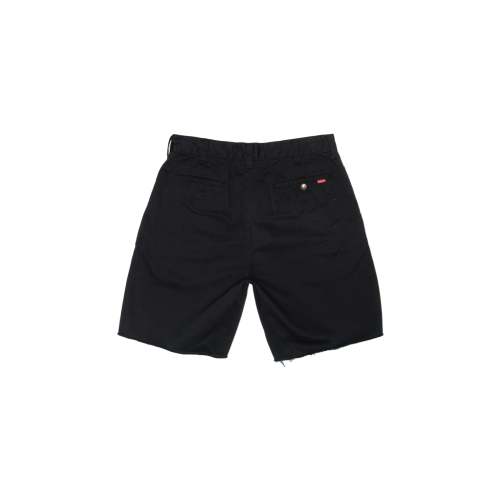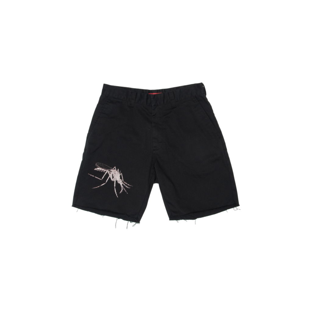 Supreme Black Mosquito Shorts features front zip closure with hook and bar fastening, 4 pocket styling, mosquito graphic on leg, and raw hems.