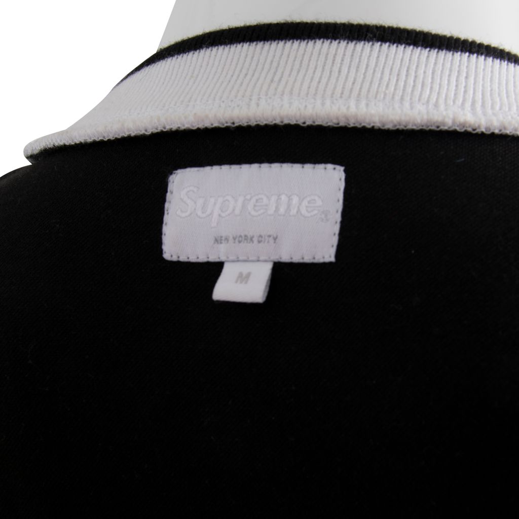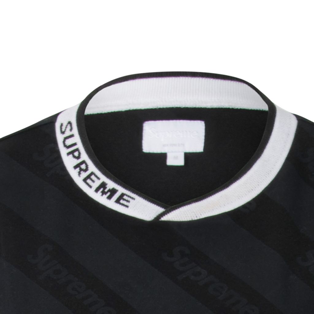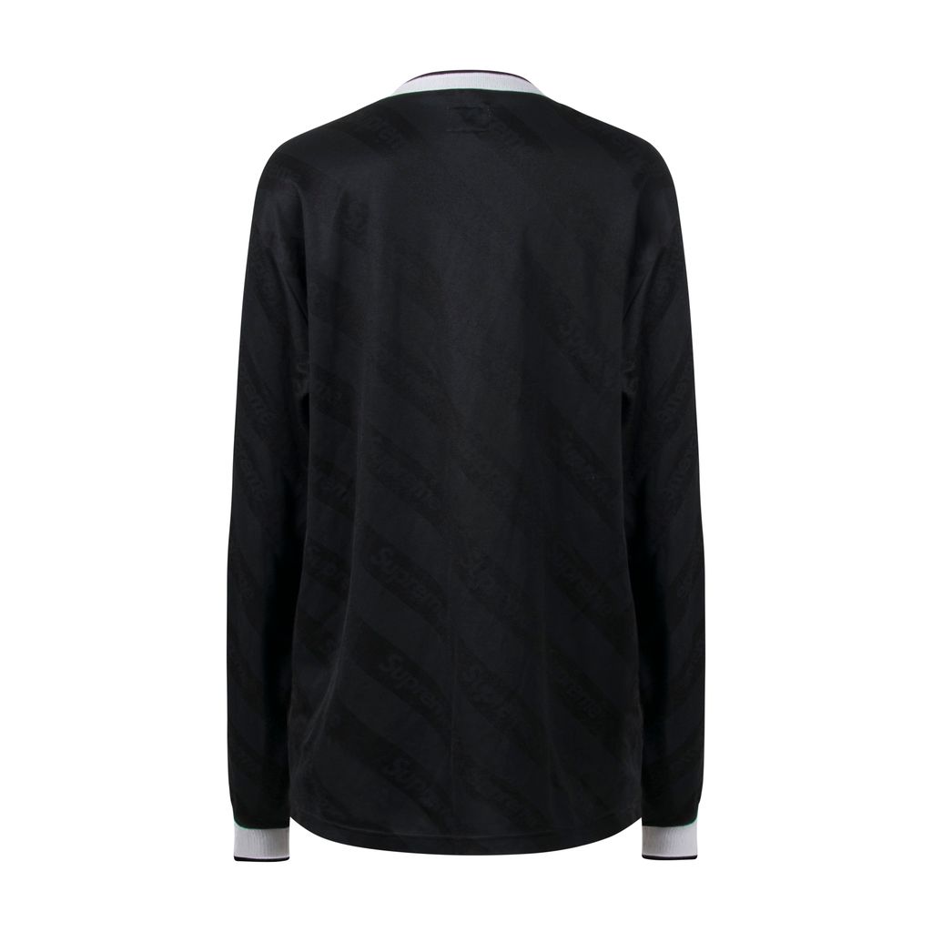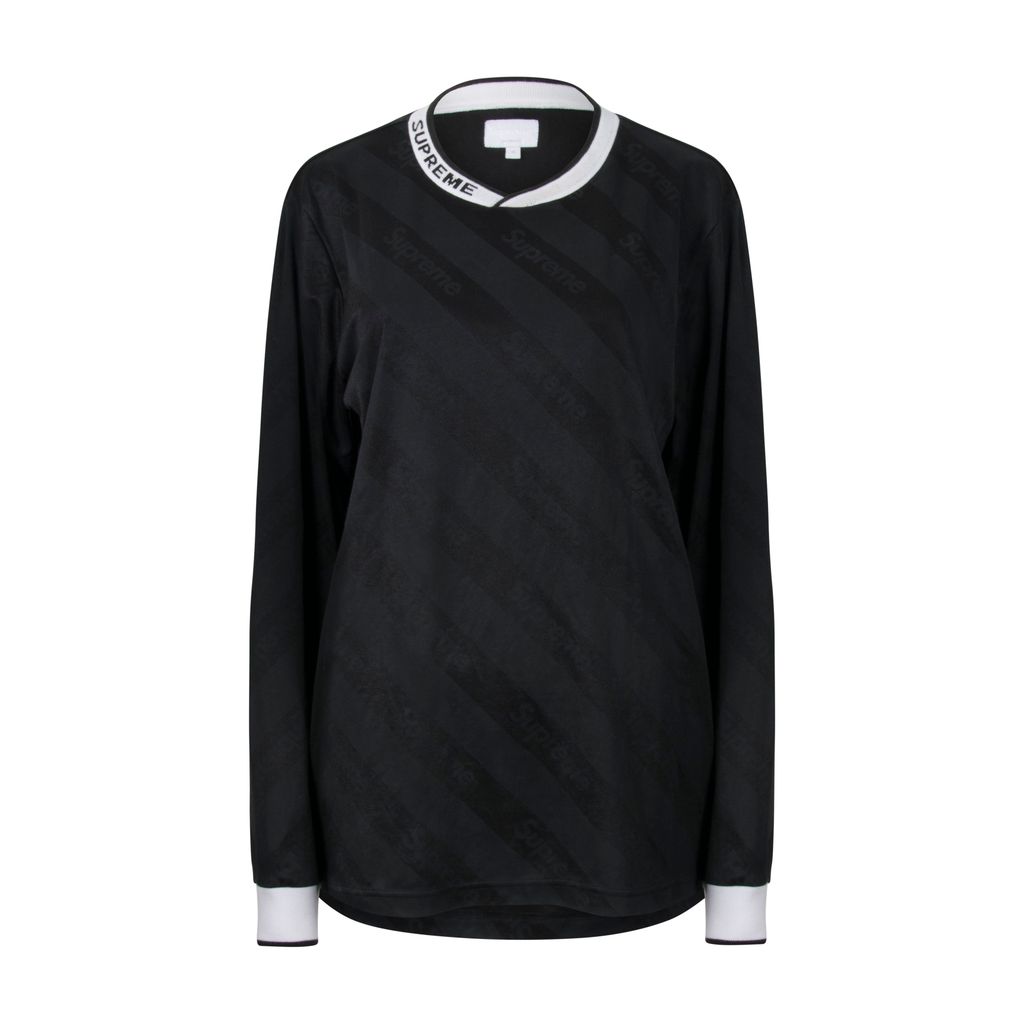 This long sleeve jersey from Supreme features a crossover ribbed logo collar, long sleeves with ribbed cuffs and has a diagonal Supreme logo bodice design. Gently worn, minor marks around collar and on cuffs.