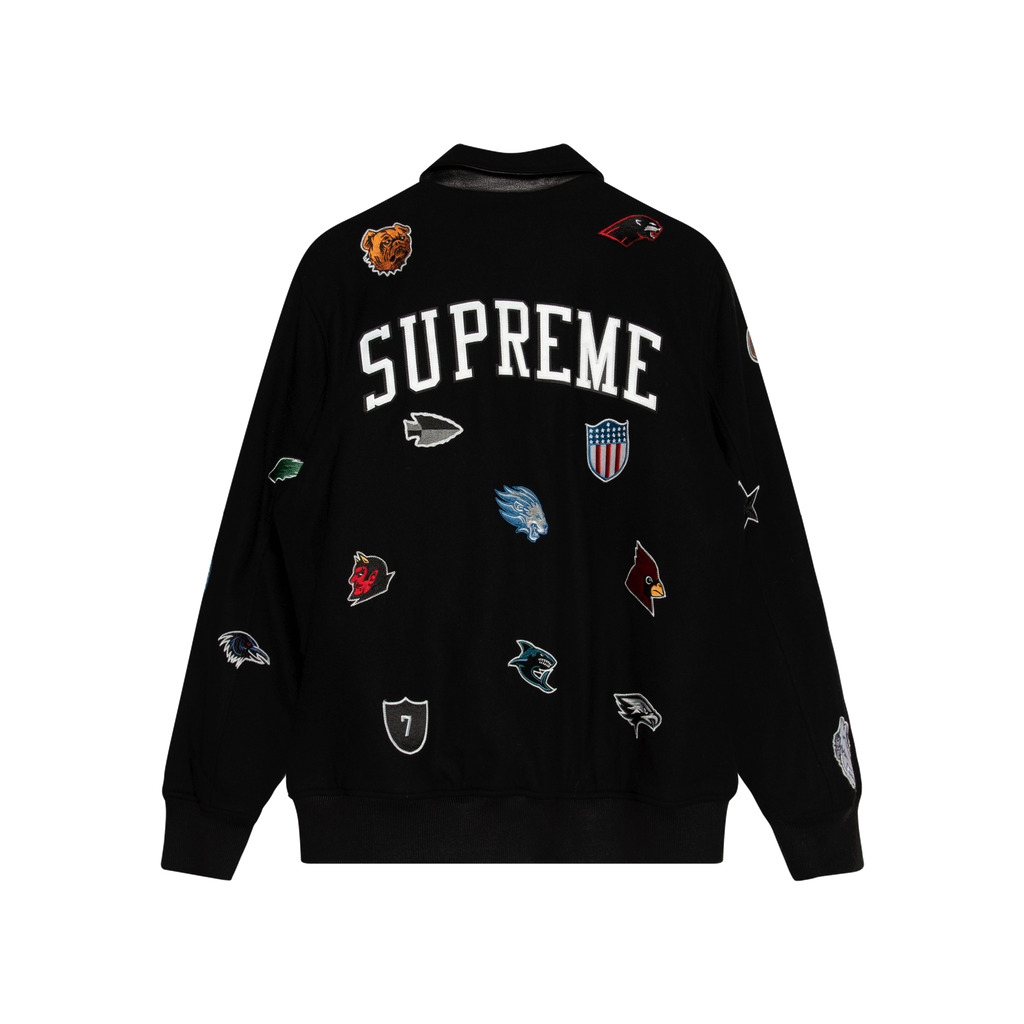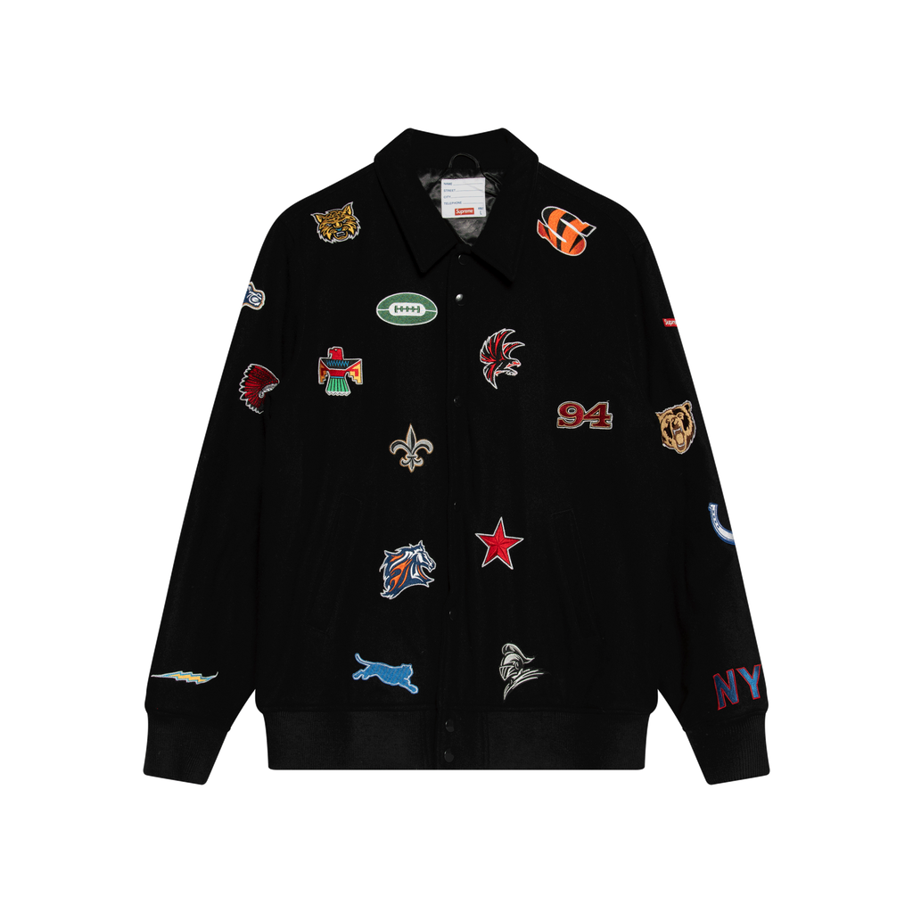 Supreme Franchise Varsity Jacket features classic collar, front button closure, two front pockets, and NFL patches through out.