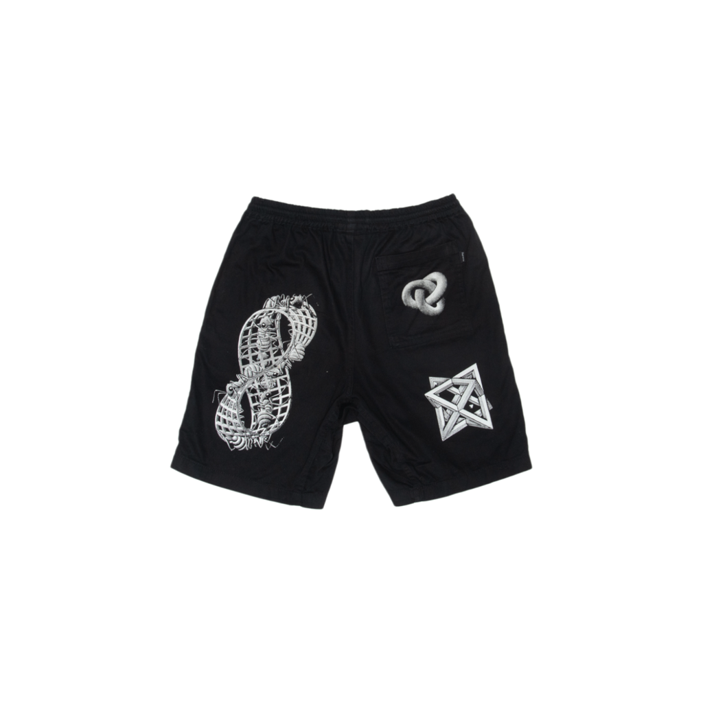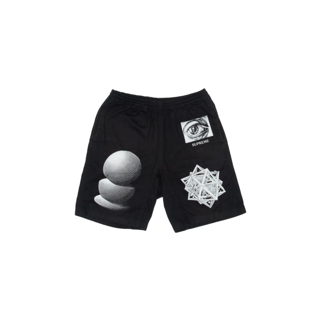 Supreme MC Escher Black Shorts features elasticated waistband with hidden drawstring, 3 pocket styling, and graphics on front and back.