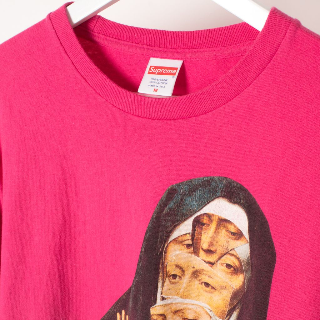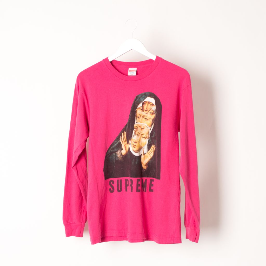 Like new, Nun long sleeve from Supreme. Features a screen print front graphic, an 100% cotton tee in the pink color way.