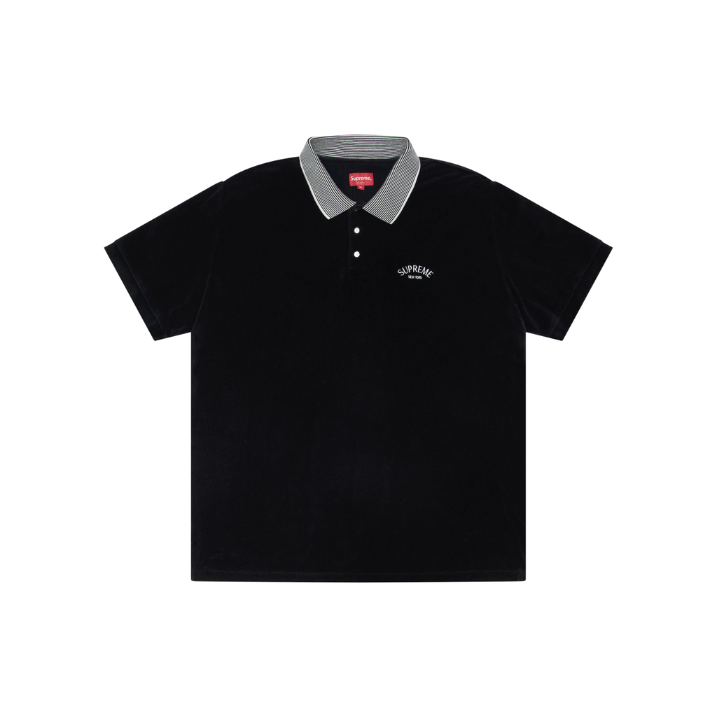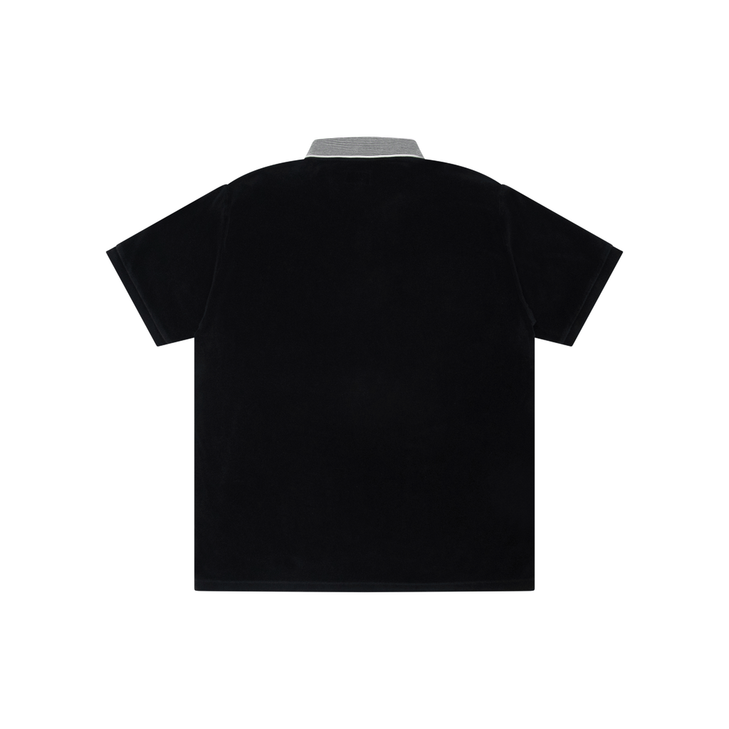 Supreme Terry Polo - Black features an embroidery on the chest pocket, with a striped collar, and three white buttons.