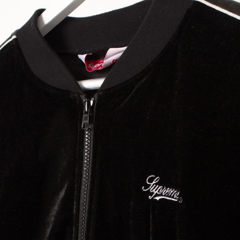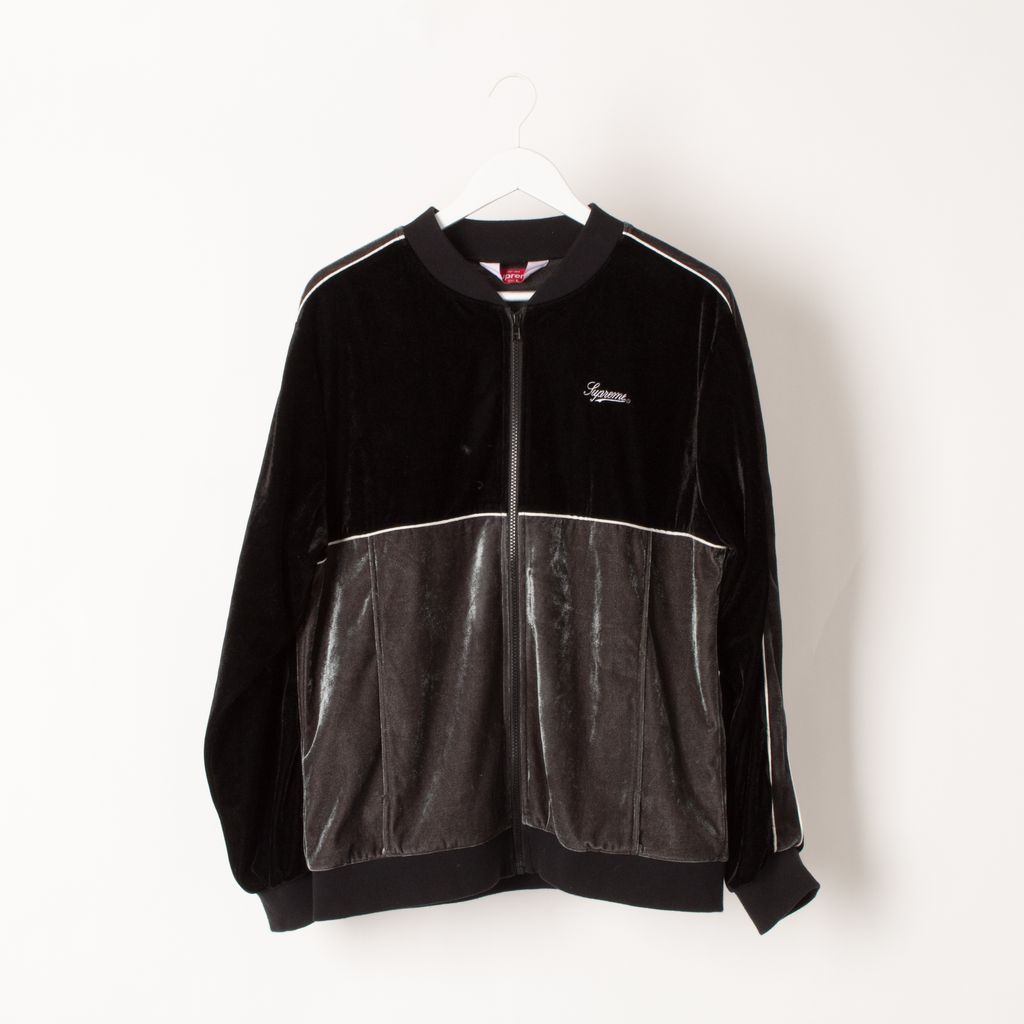 Like new, two-tone velour zip up track jacket from Supreme with embroidered small script logo on chest. 100% Cotton.