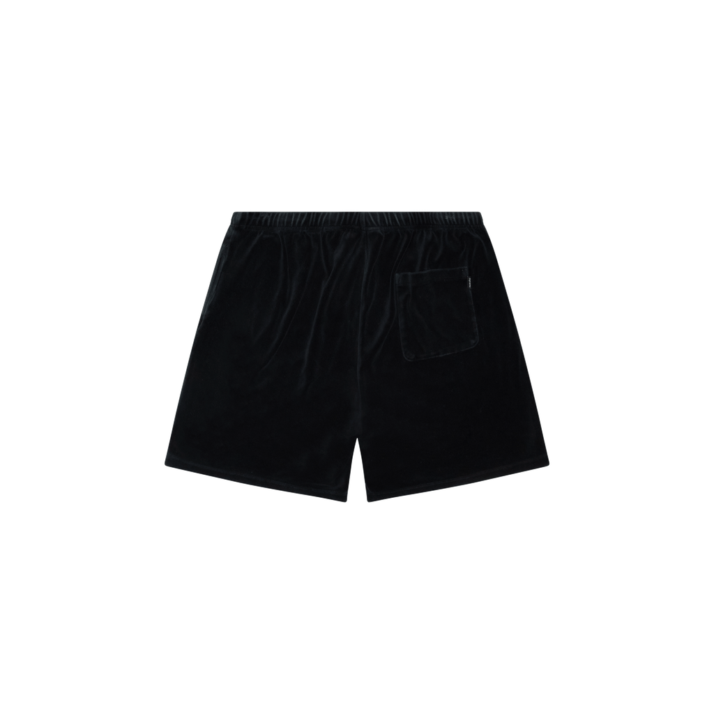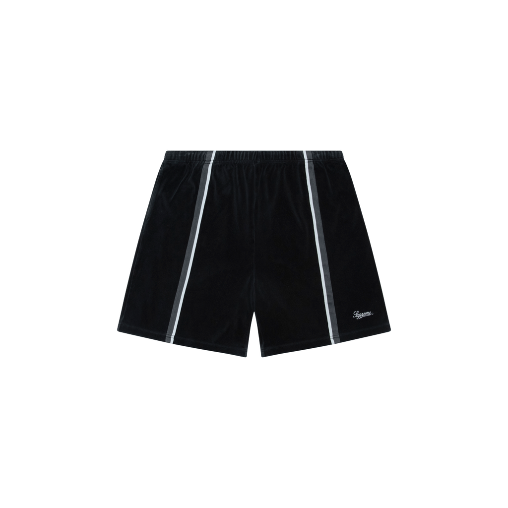 Supreme Velvet Shorts features elasticized waistband, 1 pocket on back, striped design on front, and Supreme logo embroidery on left leg.