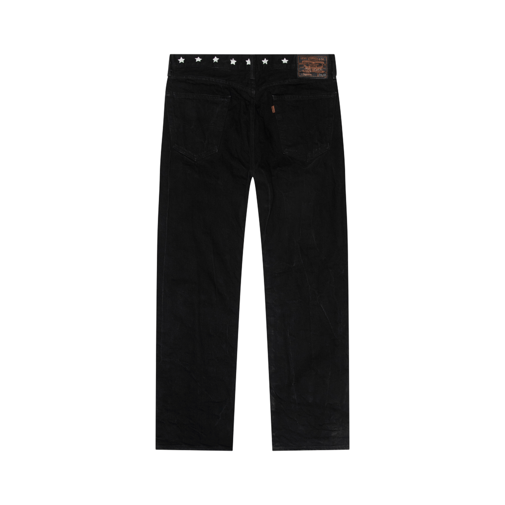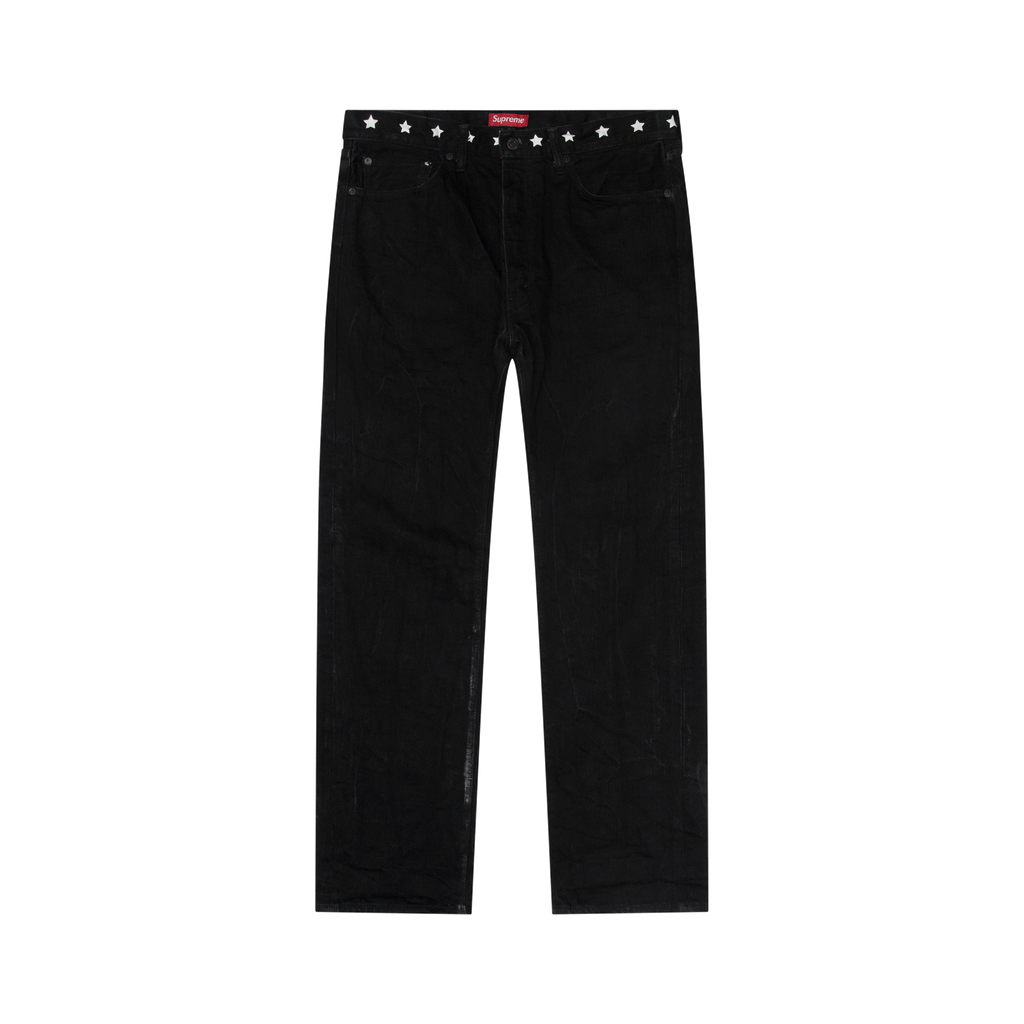 Supreme x Levi’s Jeans features white stars on the waistband, straight leg, black denim, with an orange tab.