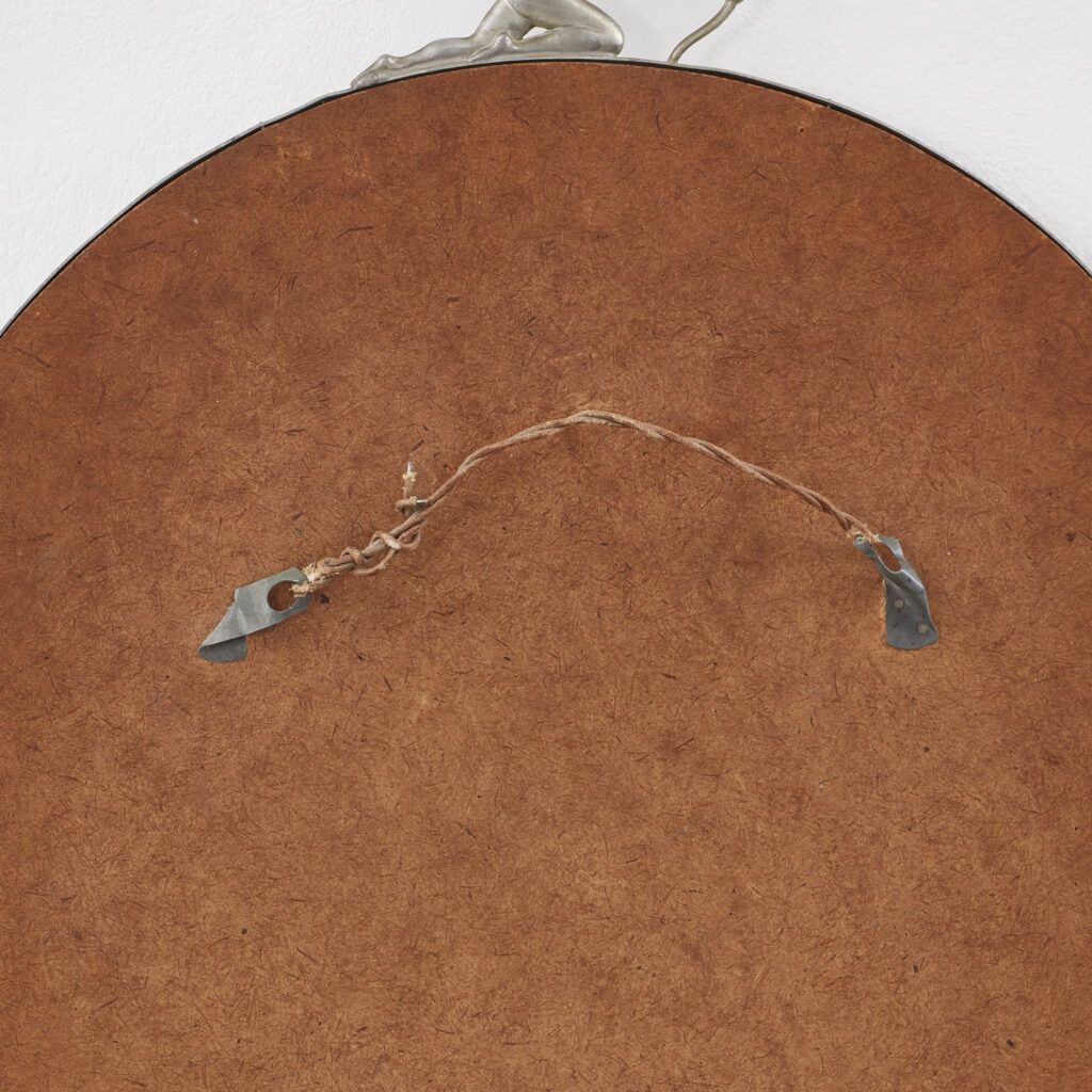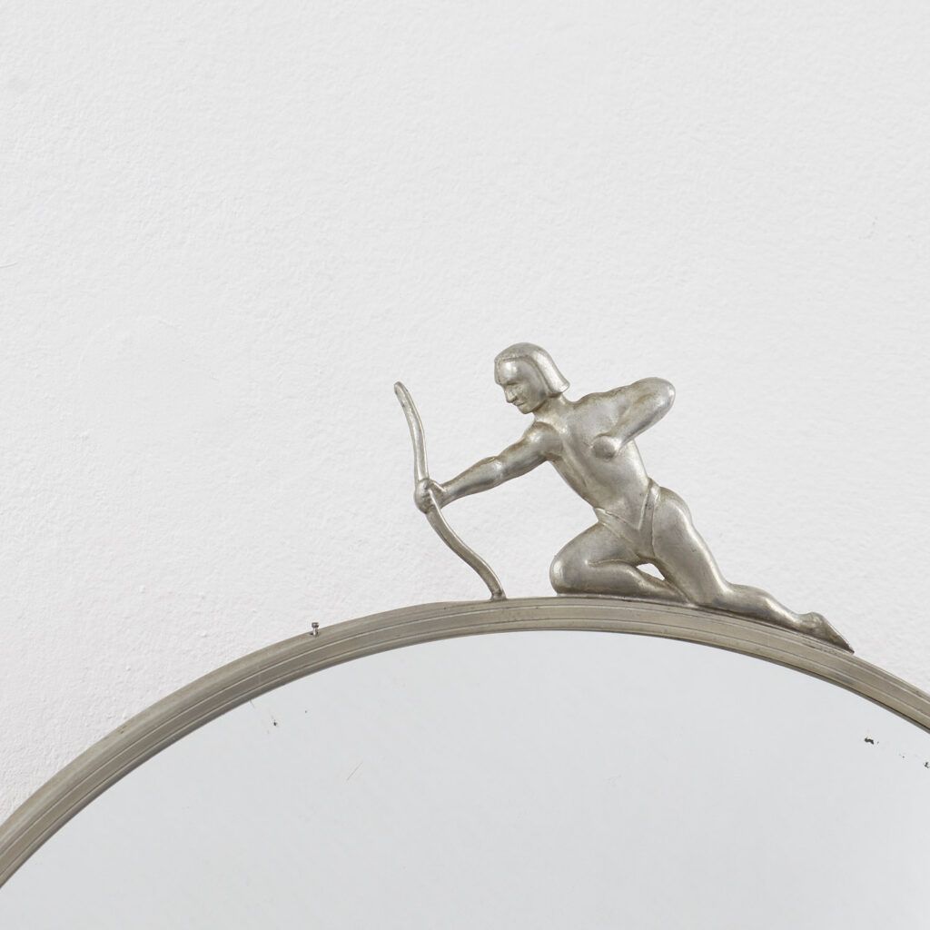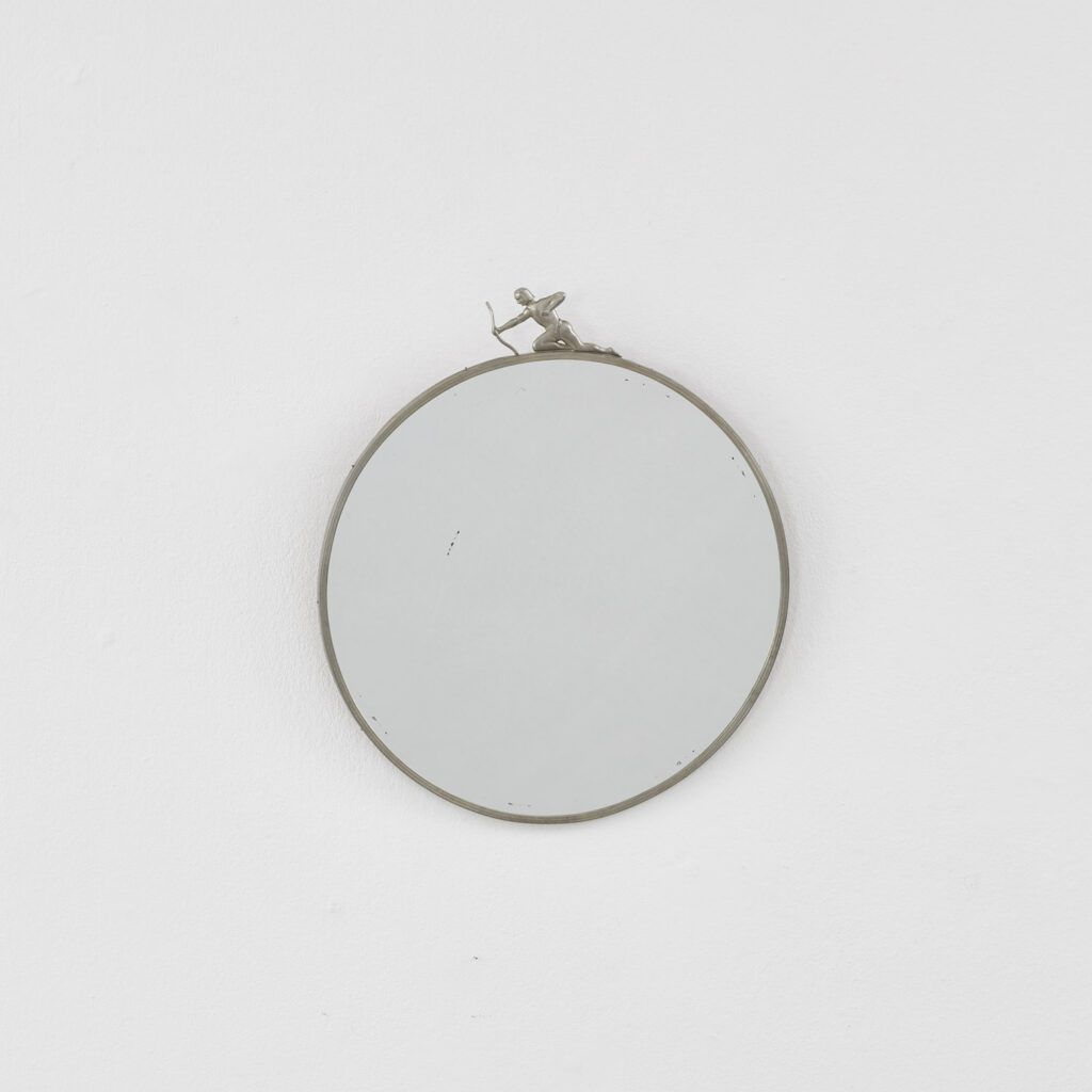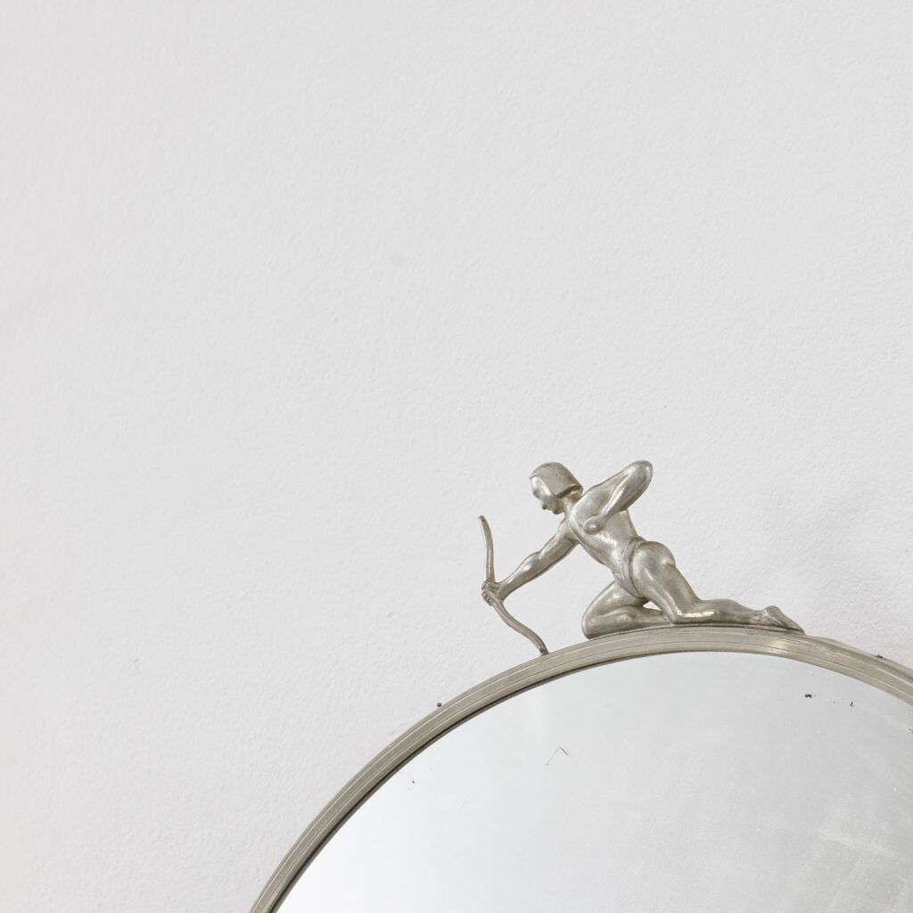 A charming round pewter mirror, crowned by a diminutive archer with bow drawn. The piece is typical of the Swedish Grace movement, a lesser-known Scandinavian branch of Art Deco that beautified geometric silhouettes with simple decorative flourishes.