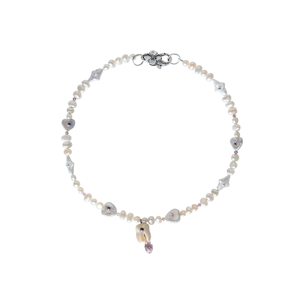 Sweet Tooth features freshwater pearls with Swarovski stones on both sides, handmade glass tooth bead from Ukraine, and Swarovski beads.