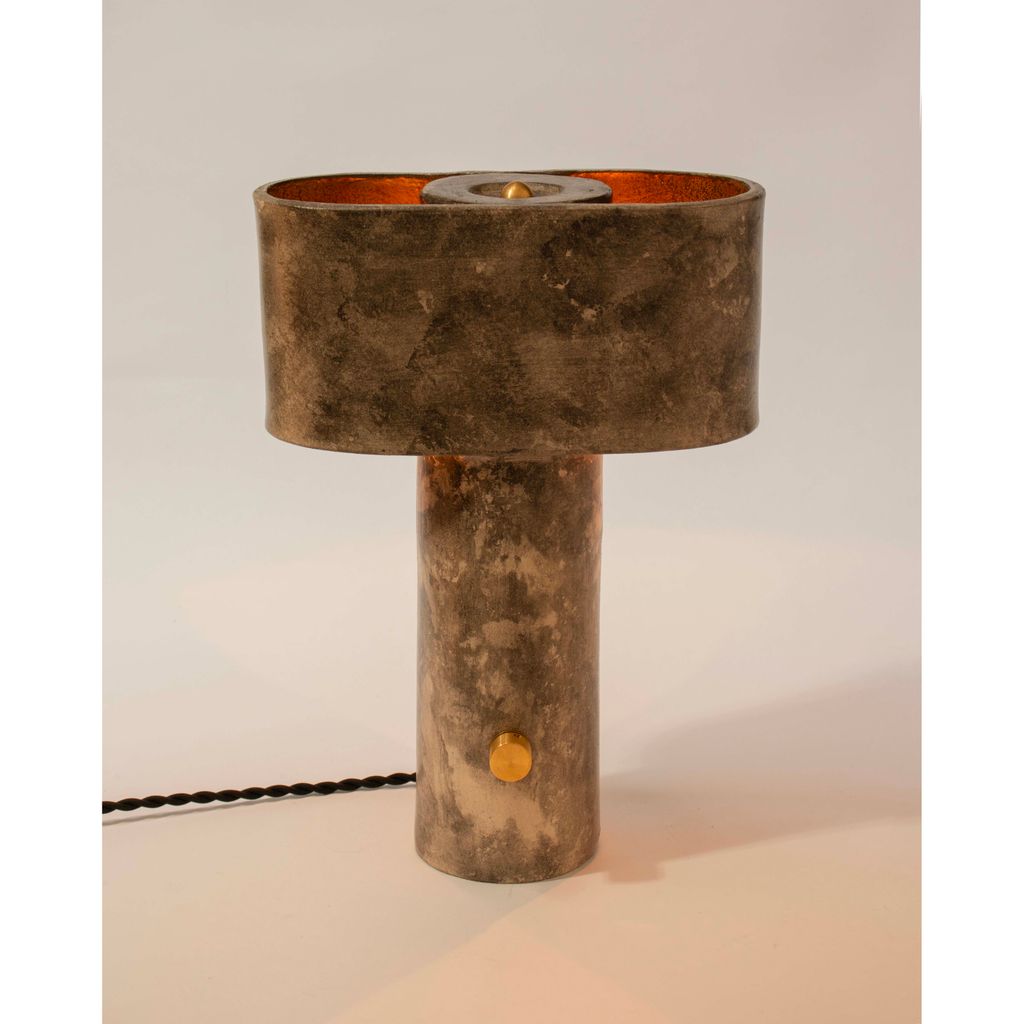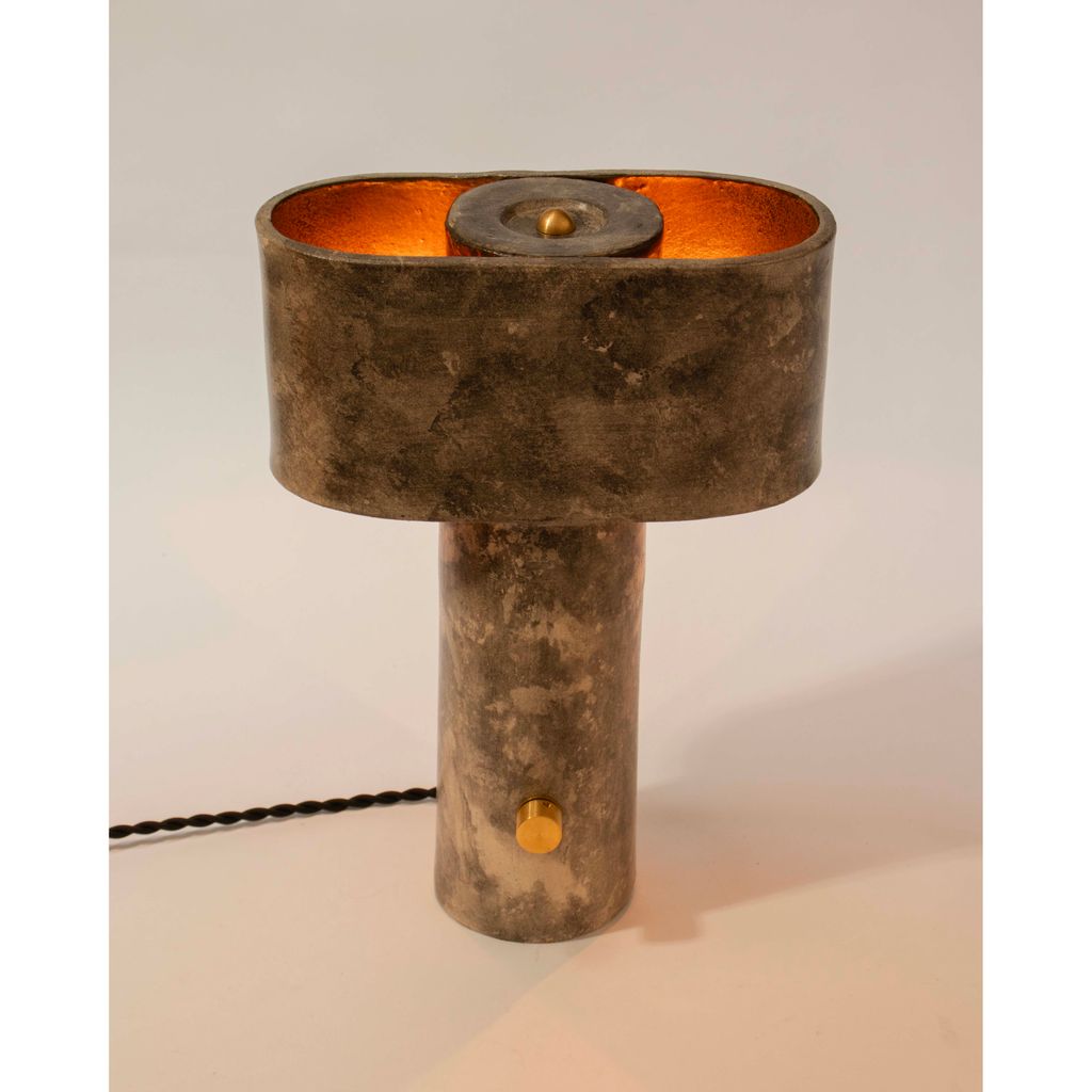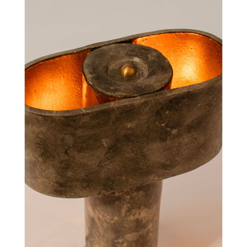 The T-top lamp has a thin cylindrical base that supports an elongated oval (or pill-shaped) top section, giving it a modern and simple appearance. The top section forms a shade with two openings on either side, creating pockets for the light to emit upwards and downwards for a subtle and diffused illumination. The inside of the elliptical top is finished with a warm, metallic bronze coating which is enhanced by the glow of the light and further contrasts the weathered rock-like exterior of the piece.