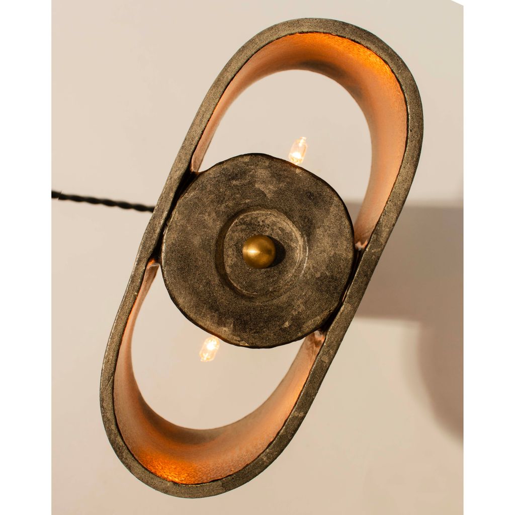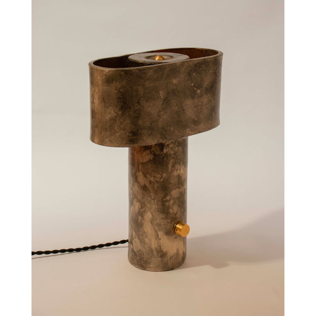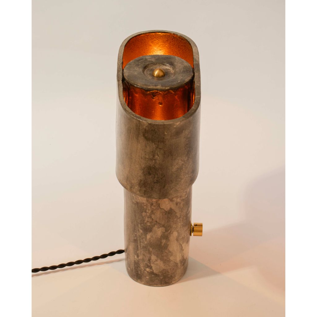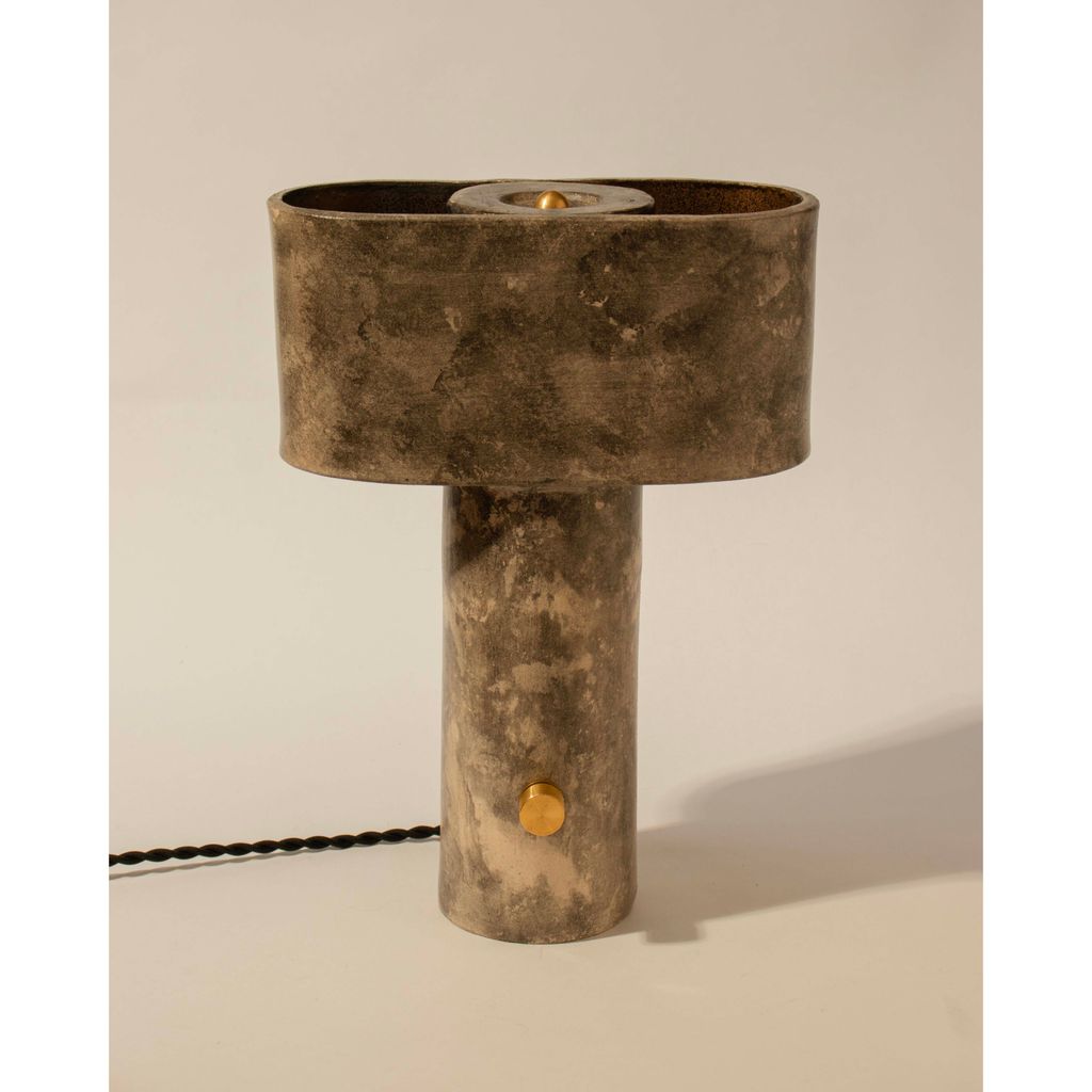 The T-top lamp has a thin cylindrical base that supports an elongated oval (or pill-shaped) top section, giving it a modern and simple appearance. The top section forms a shade with two openings on either side, creating pockets for the light to emit upwards and downwards for a subtle and diffused illumination. The inside of the elliptical top is finished with a warm, metallic bronze coating which is enhanced by the glow of the light and further contrasts the weathered rock-like exterior of the piece.