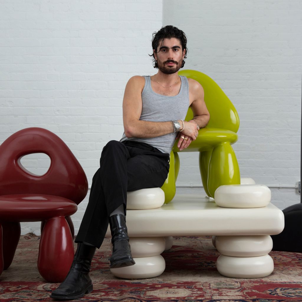 Design has always surrounded Kouros Maghsoudi, who was born in the Frank Lloyd Wright suburbs of Chicago to parents who owned a boutique women’s clothing store and Persian rug galleries. After earning his degree in sustainable architecture and urban design, he debuted his own furniture collection, called Mehmooni, which draws directly from his Persian culture but is tinged with playful postmodern motifs that encourage people to indulge. A self-taught multidisciplinary artist and designer, Kouros’s approach is steeped in an investigation of future cultures, gathering cues from fashion and metropolitanism. Kouros’ fantasy is unapologetically tinged with sex, liberation, opulence, and self-indulgence.