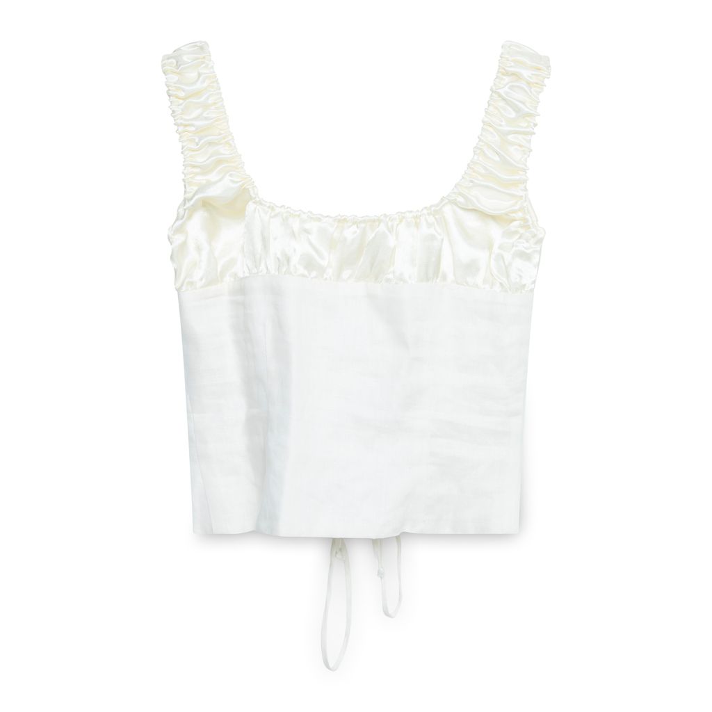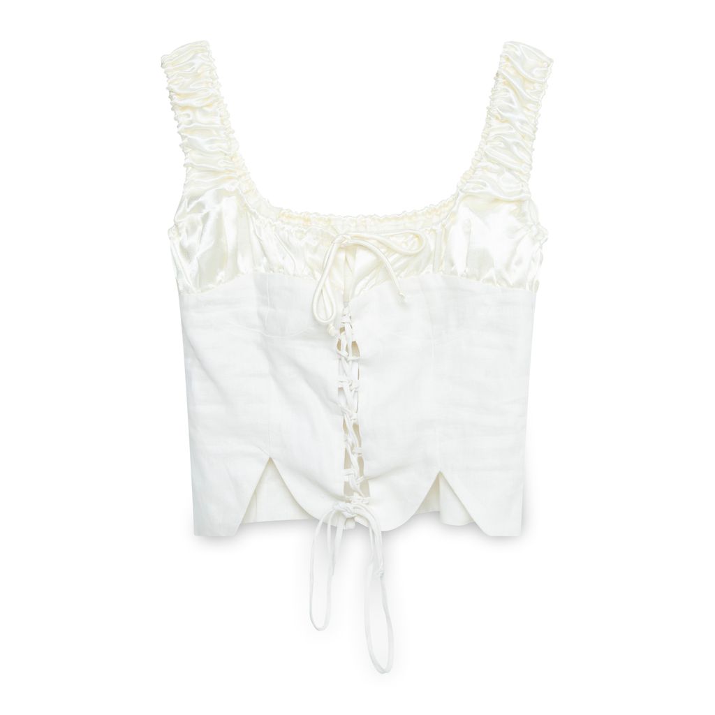 Tach Clothing Linen and Satin Corset Top features ties up the chest.