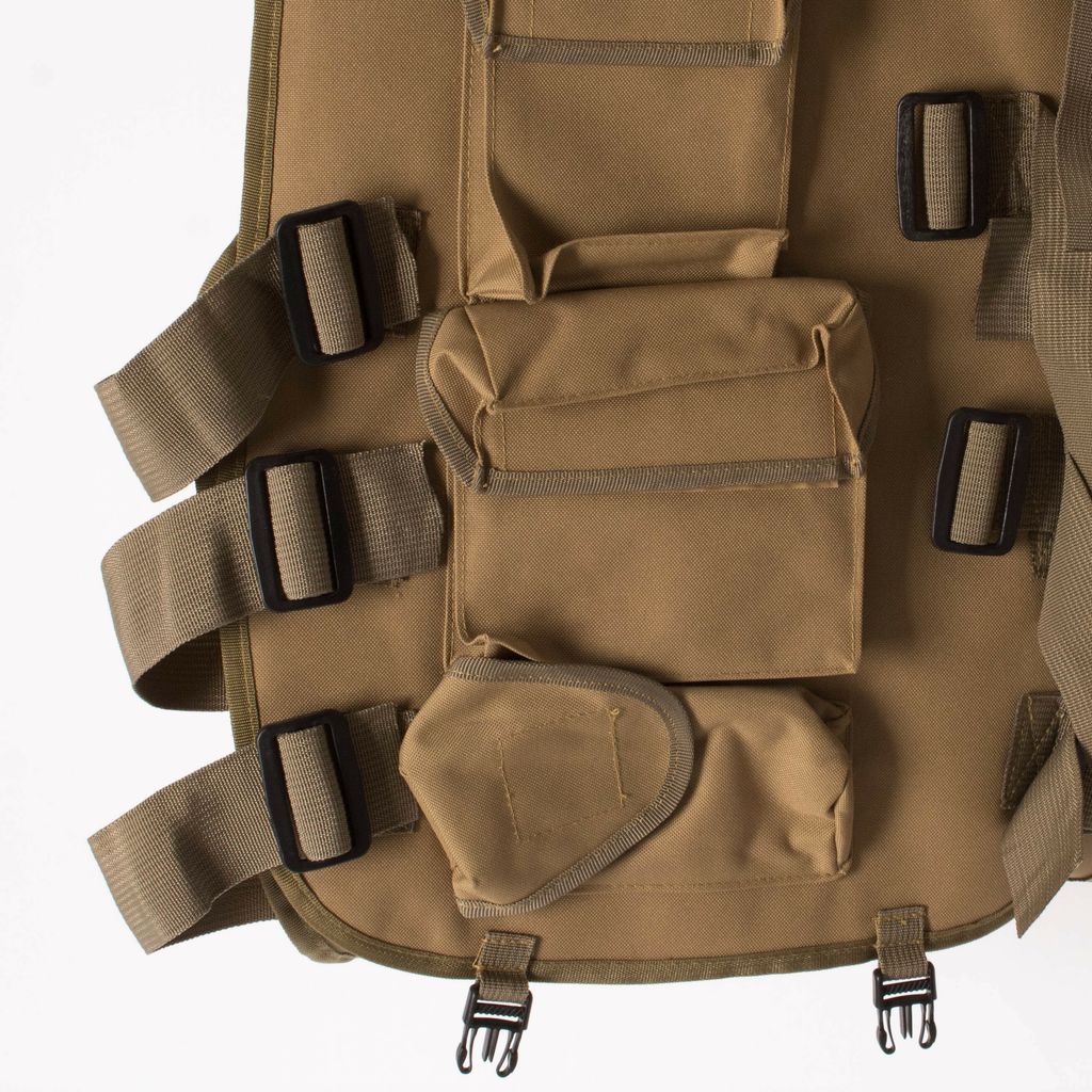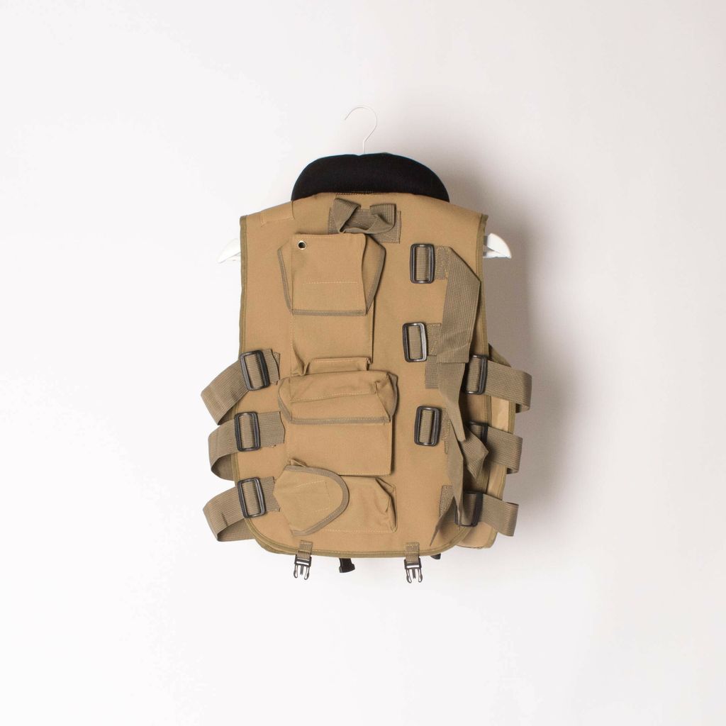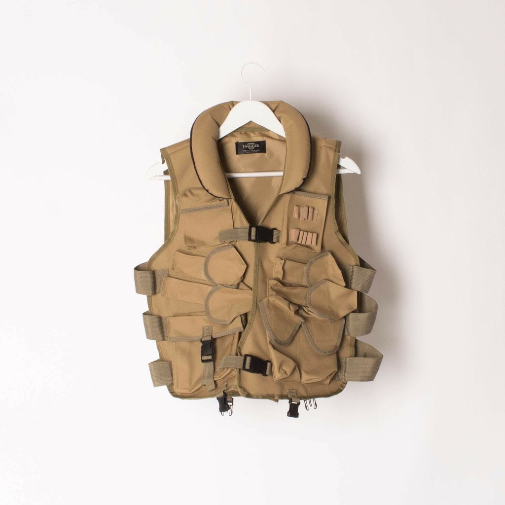 A true utility piece that doubles as an over layer, this vest is a two for one. Features an insane amount of pockets, padded neck, buckle clips, and pull ties on the sides to adjust size.