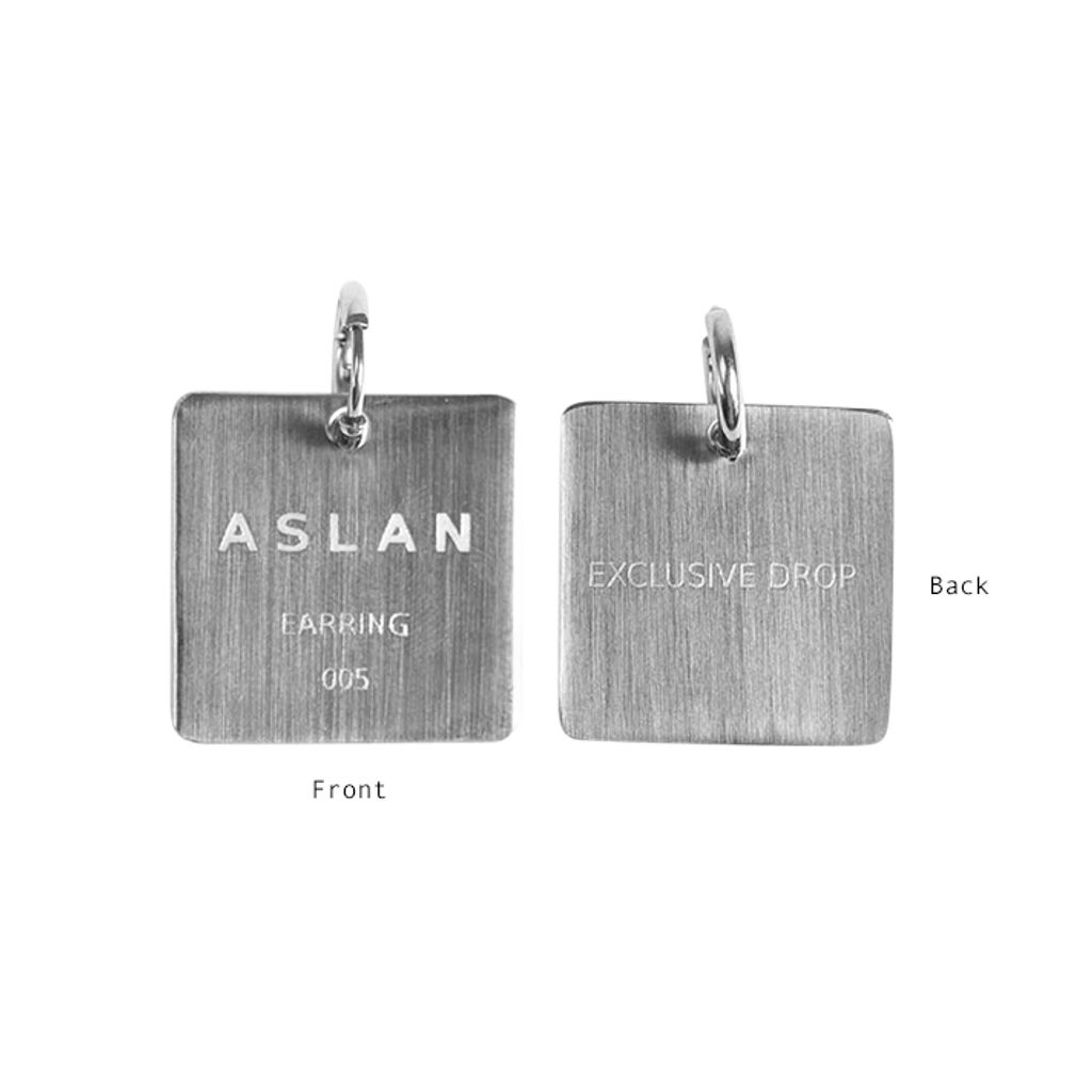 Tag Earring 05 features text on stainless steel monochromatic tag.