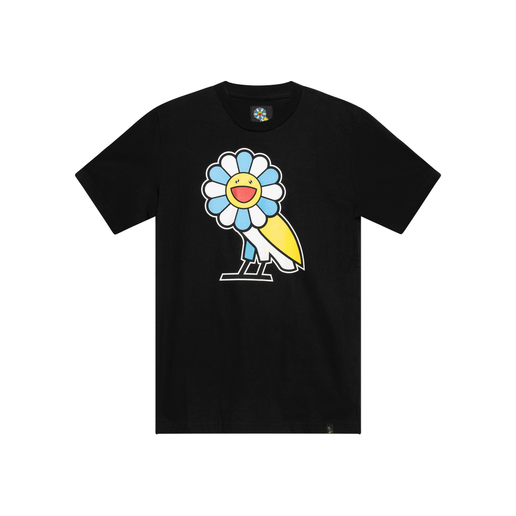 Takashi Murakami x OVO Tee features short sleeves, round neck, squared silhouette, and graphic of flower motif with the owl on front.
