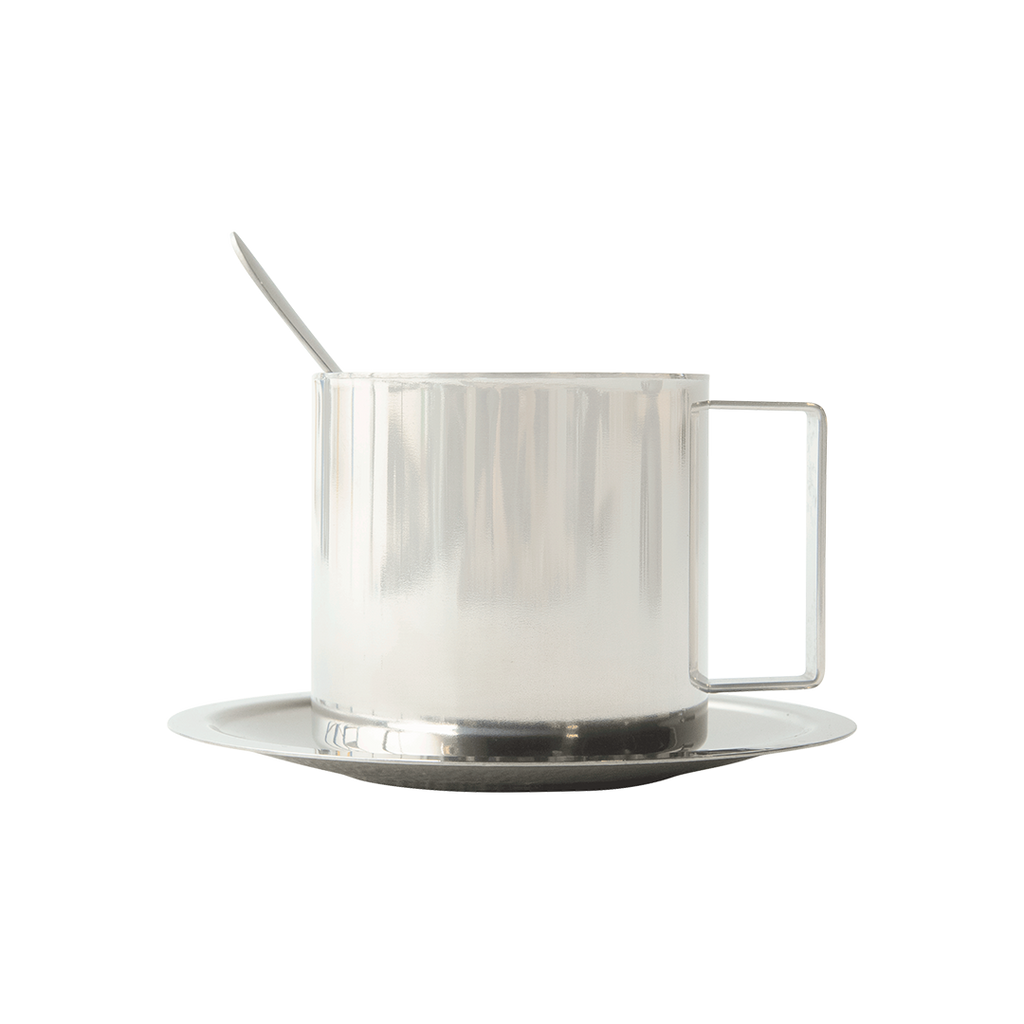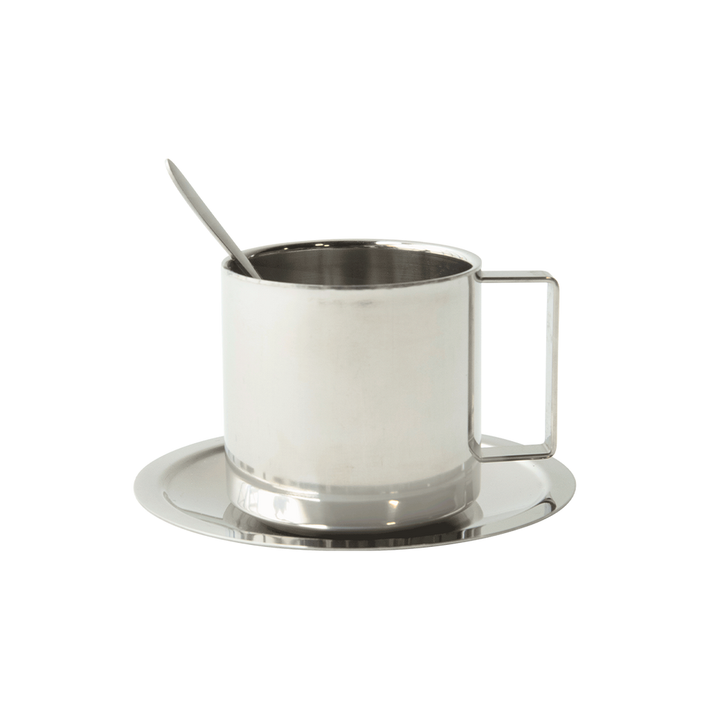 Includes cup, saucer, and spoon. Double wall insulation. 200mL capacity.