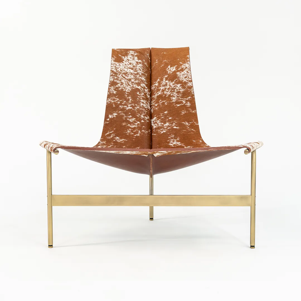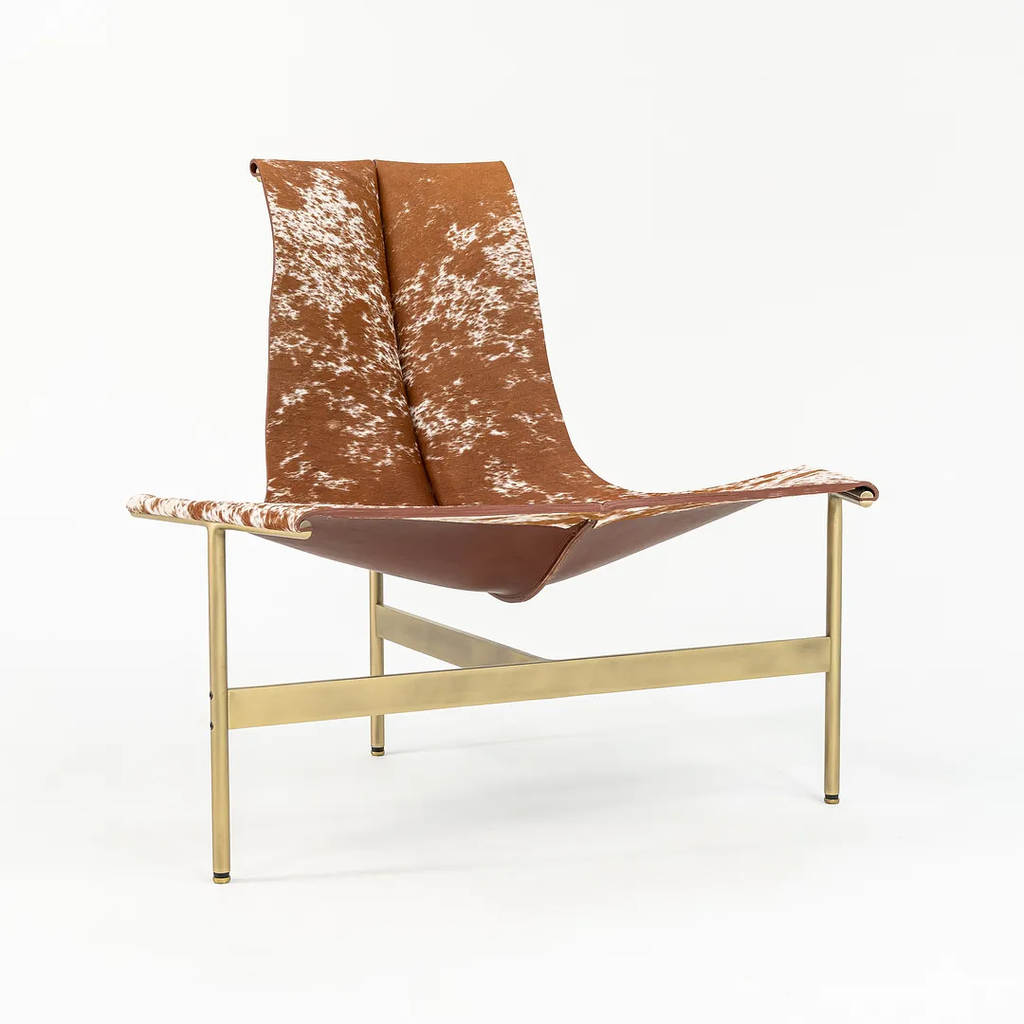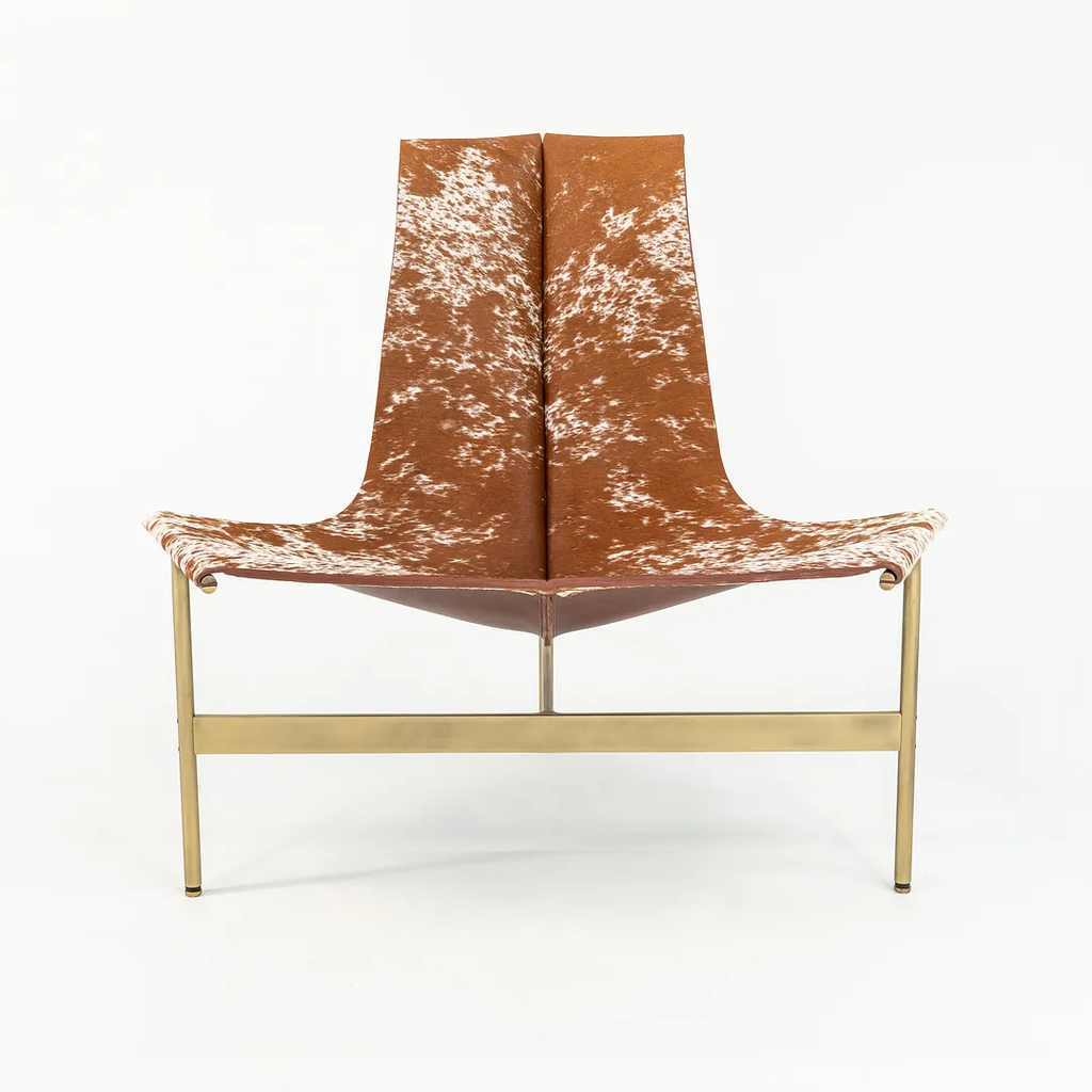 This is a TG-15 sling lounge chair in tan and white speckled hair on hide with a light antique bronze frame, produced by Gratz Industries. The chair was designed by Katavolos, Littell and Kelley in 1952 as part of the original Laverne Collection produced by Gratz Industries, formerly known as Trietel-Gratz. The chair dates to circa 2021 and guaranteed as an authentic Gratz production example.