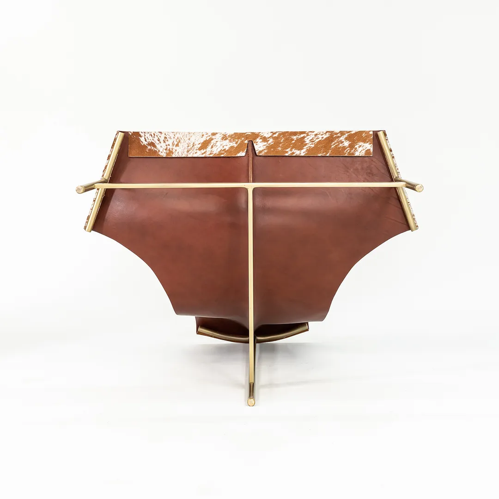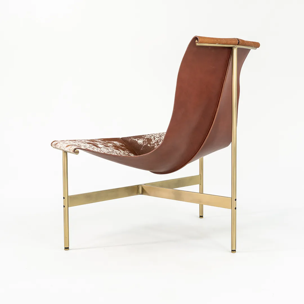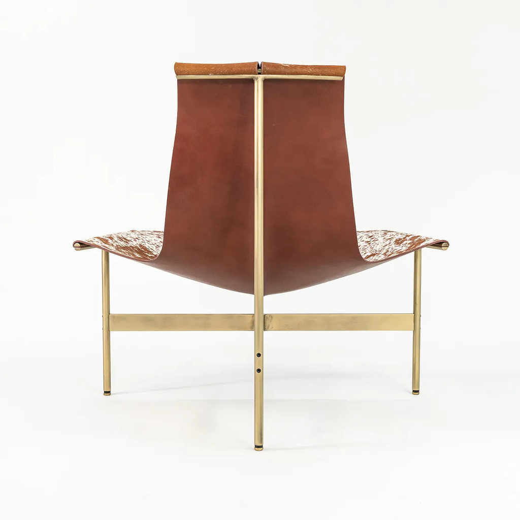 This is a TG-15 sling lounge chair in tan and white speckled hair on hide with a light antique bronze frame, produced by Gratz Industries. The chair was designed by Katavolos, Littell and Kelley in 1952 as part of the original Laverne Collection produced by Gratz Industries, formerly known as Trietel-Gratz. The chair dates to circa 2021 and guaranteed as an authentic Gratz production example.