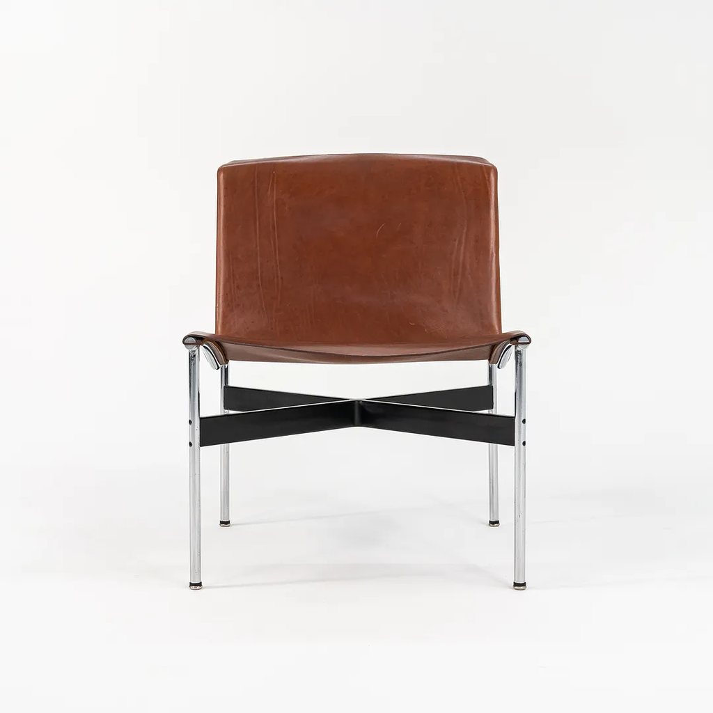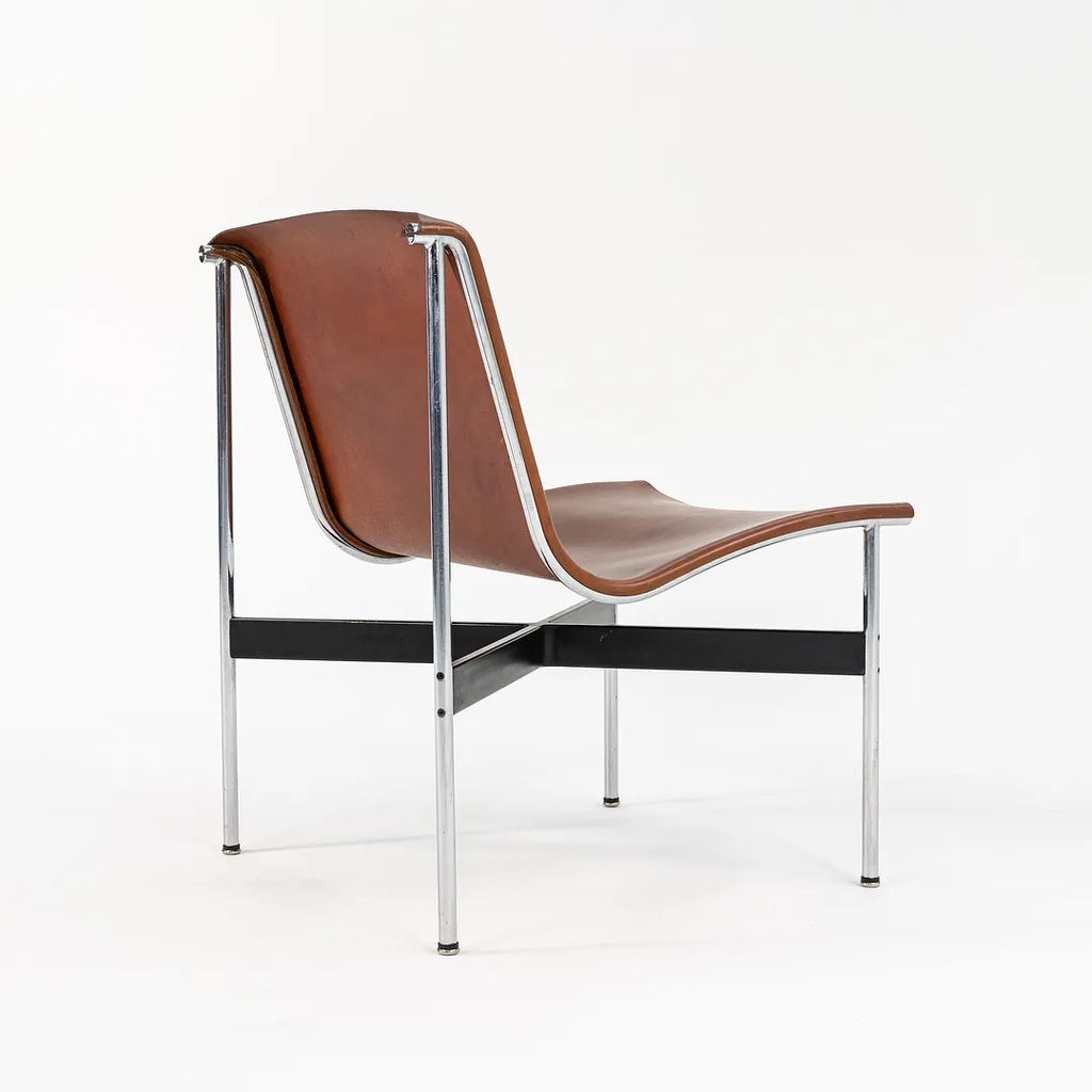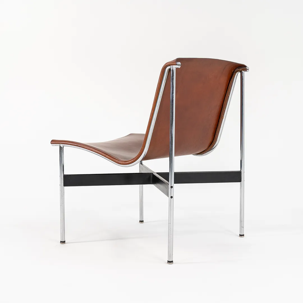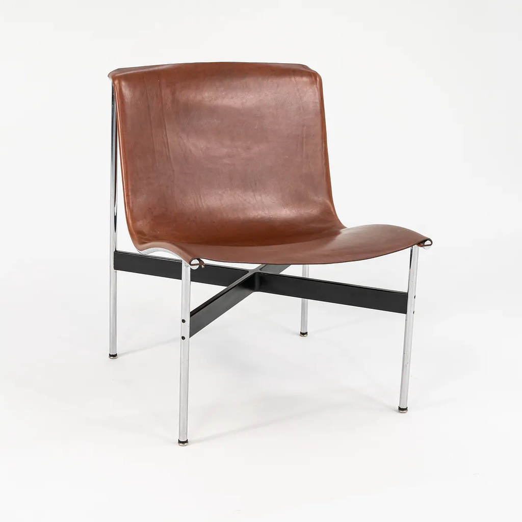 This is a TG-12 sling lounge chair in tan leather with a polished chrome frame and black t-bar, produced by Gratz Industries. The chair was designed in the 1950s by Katavolos, Littell and Kelley, distributed by Erwine and Estelle Laverne's International Furniture Collection, and produced by Gratz Industries, formerly known as Trietel-Gratz. The chair dates to circa 2021 and guaranteed as an authentic Gratz production example.