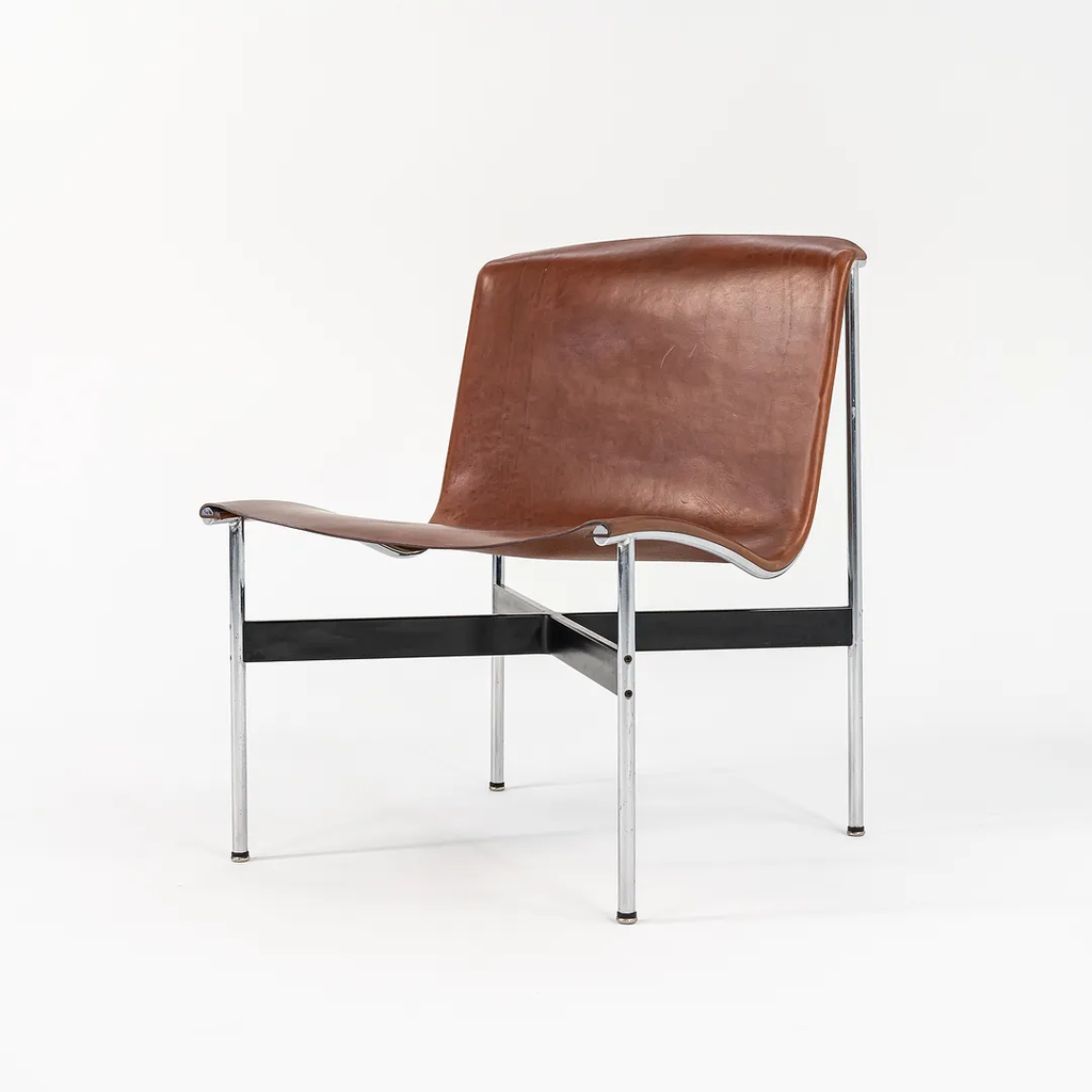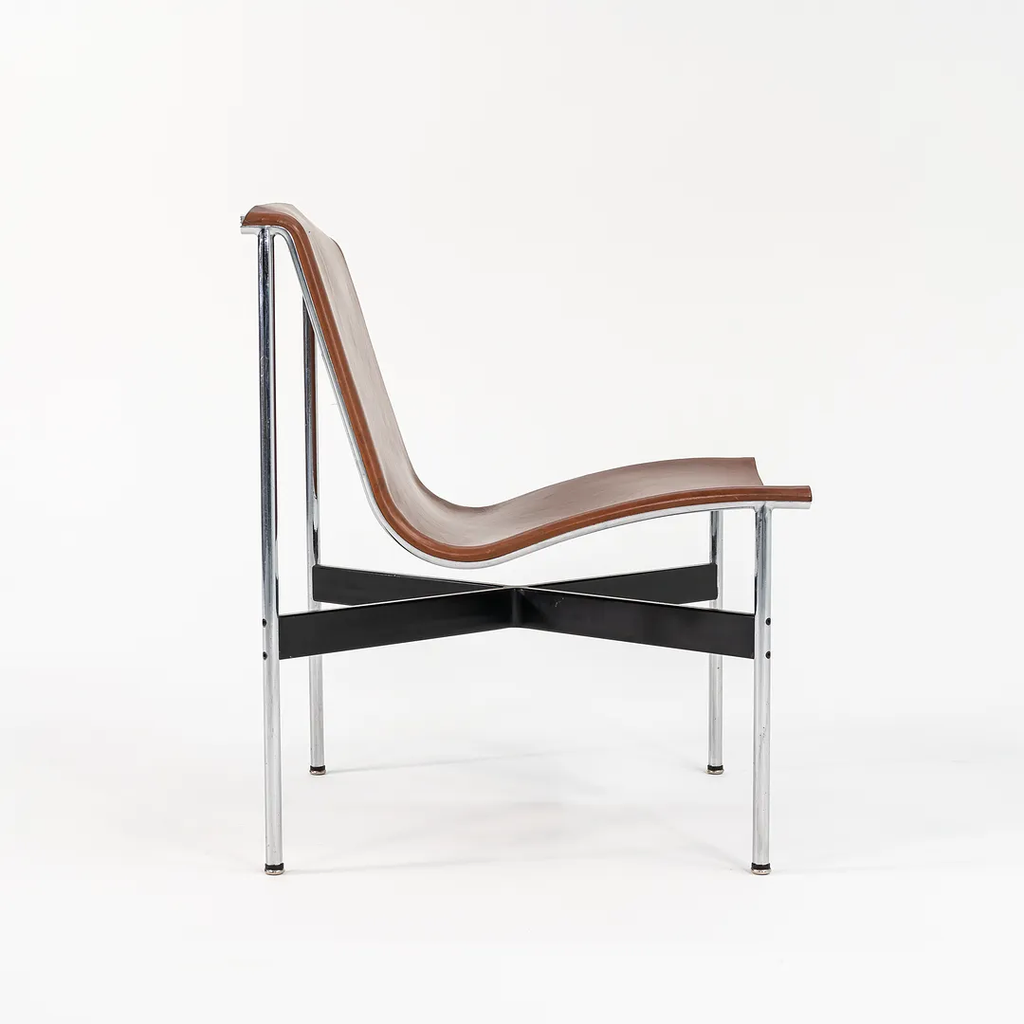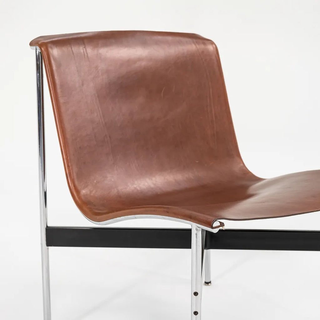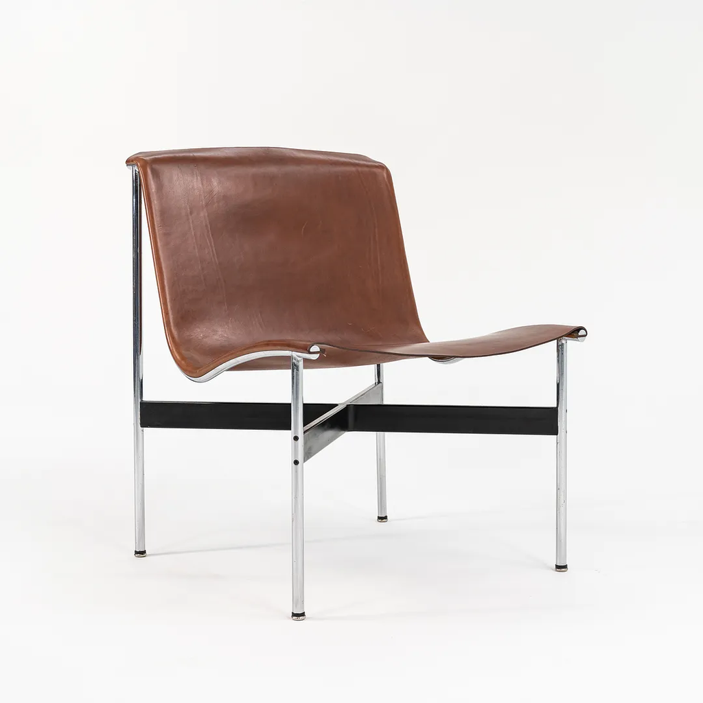 This is a TG-12 sling lounge chair in tan leather with a polished chrome frame and black t-bar, produced by Gratz Industries. The chair was designed in the 1950s by Katavolos, Littell and Kelley, distributed by Erwine and Estelle Laverne's International Furniture Collection, and produced by Gratz Industries, formerly known as Trietel-Gratz. The chair dates to circa 2021 and guaranteed as an authentic Gratz production example.