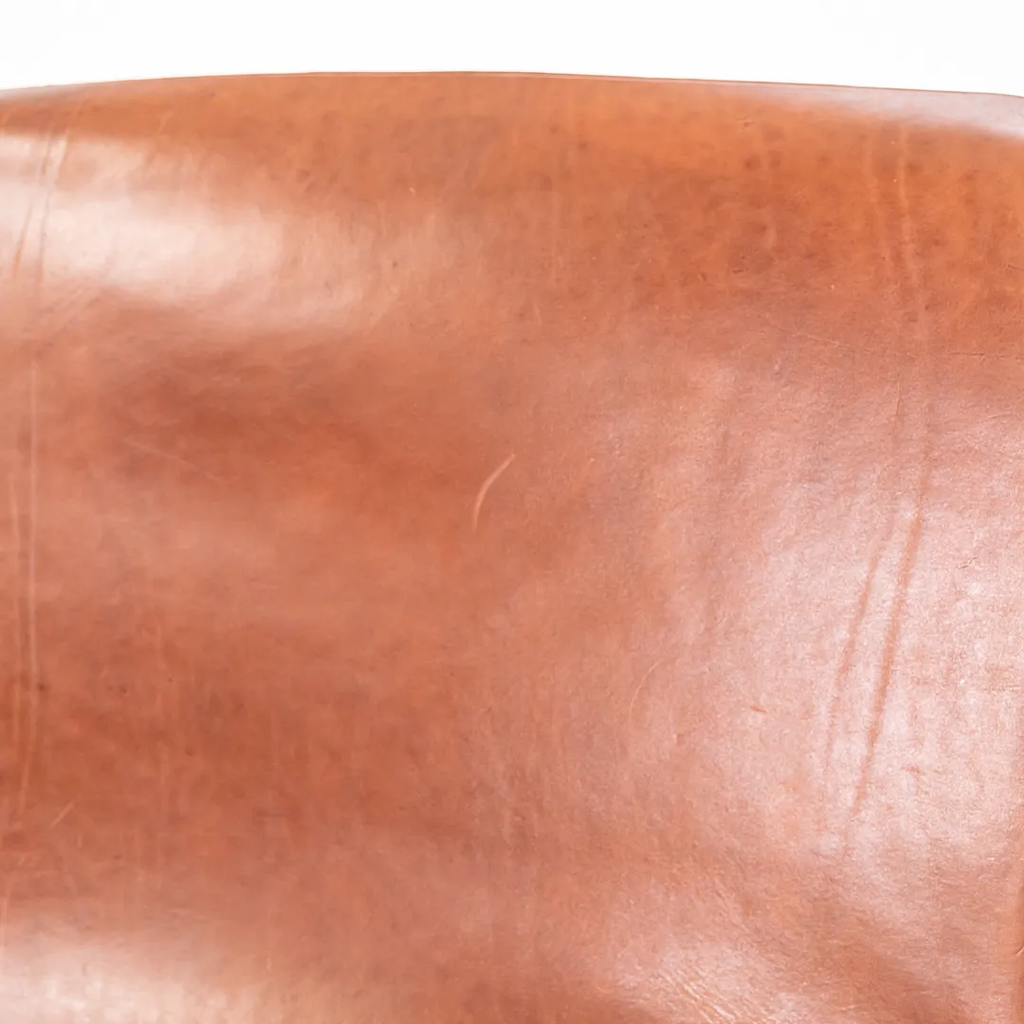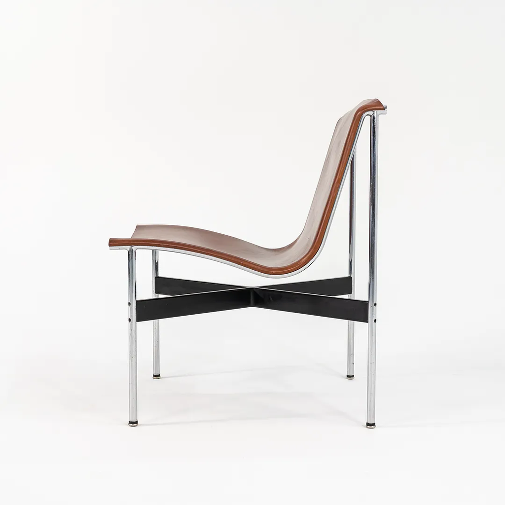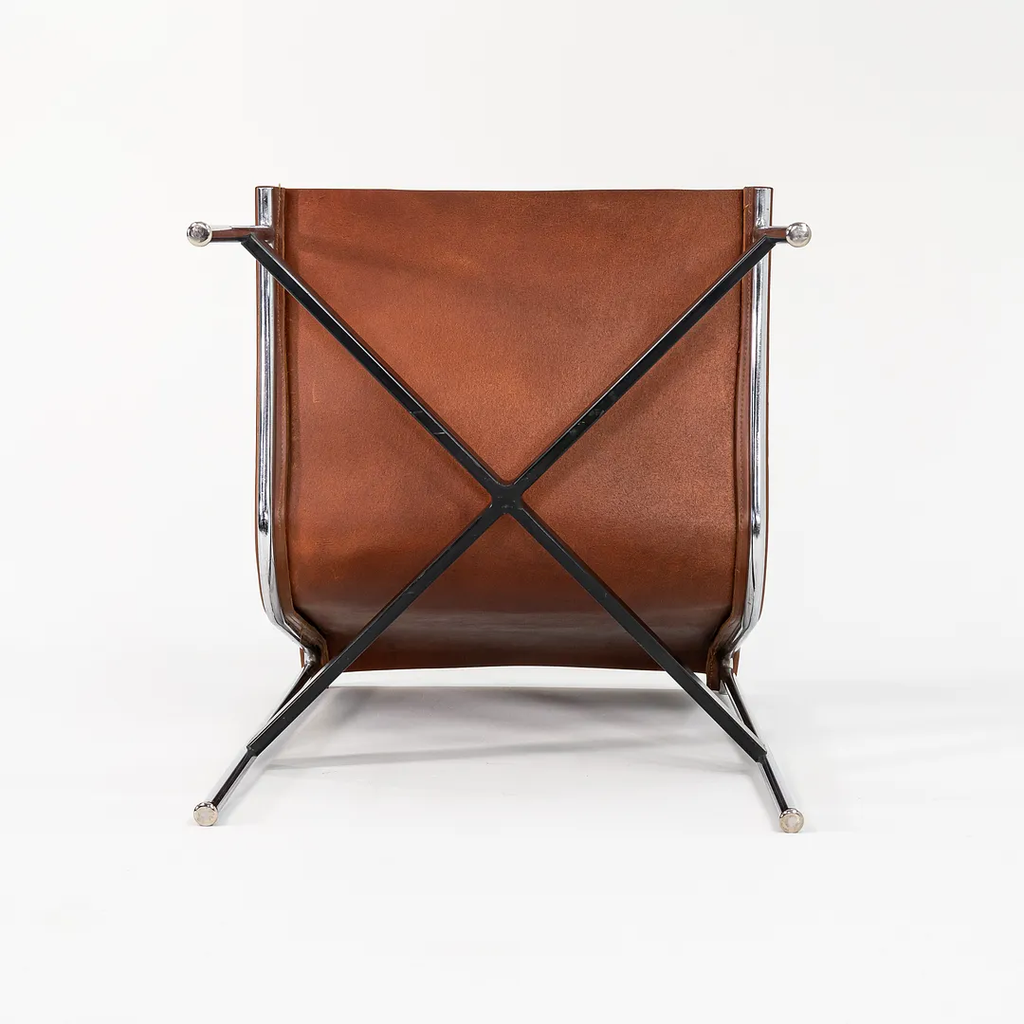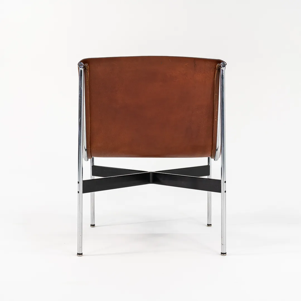 This is a TG-12 sling lounge chair in tan leather with a polished chrome frame and black t-bar, produced by Gratz Industries. The chair was designed in the 1950s by Katavolos, Littell and Kelley, distributed by Erwine and Estelle Laverne's International Furniture Collection, and produced by Gratz Industries, formerly known as Trietel-Gratz. The chair dates to circa 2021 and guaranteed as an authentic Gratz production example.