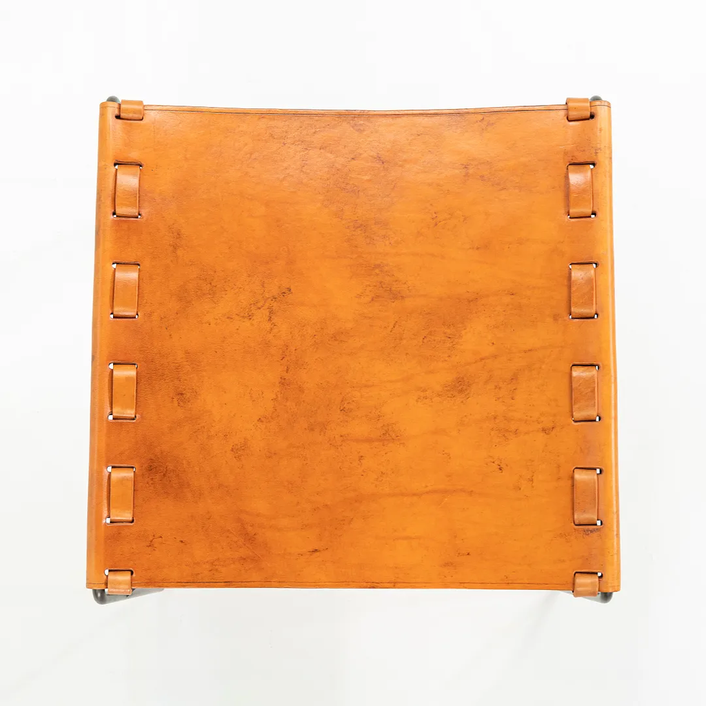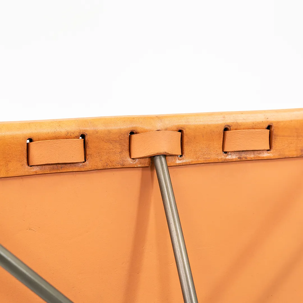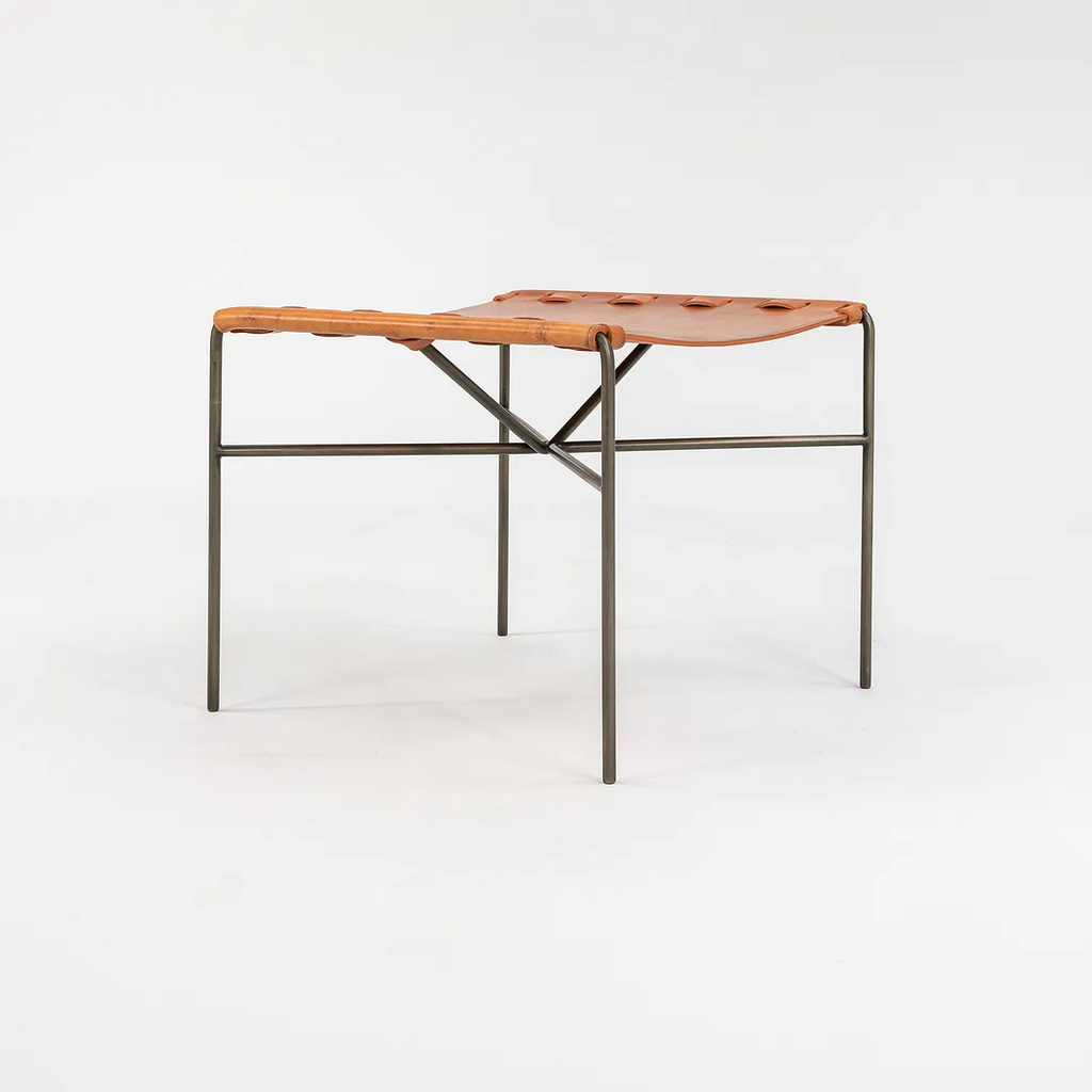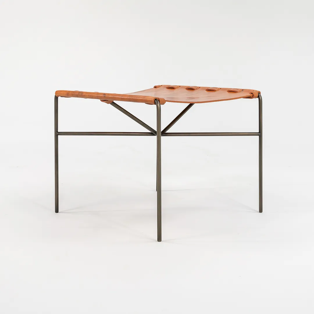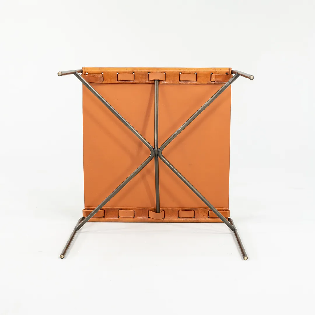 This is a TG-19 Sling Ottoman in antique tan leather with a medium antique bronze frame, produced by Gratz Industries. The ottoman was designed by Katavolos, Littell and Kelley in 1952 as part of the original Laverne Collection produced by Gratz Industries, formerly known as Trietel-Gratz. The ottoman dates to circa 2021 and guaranteed as an authentic Gratz production example.
