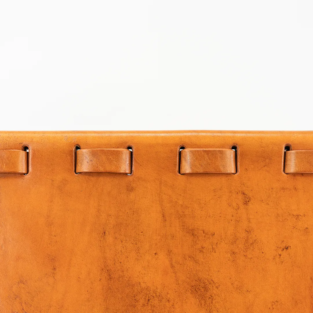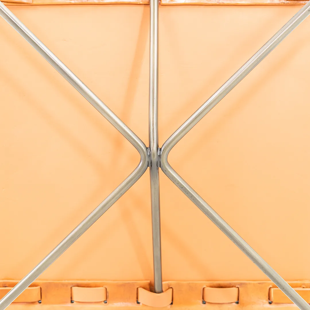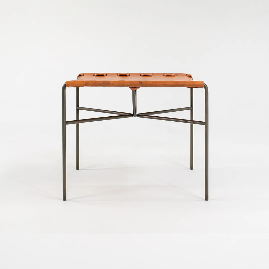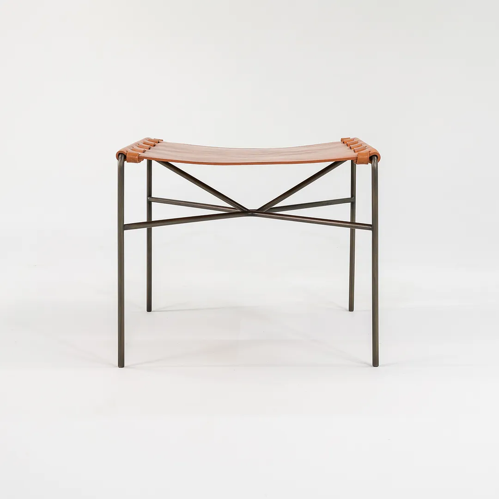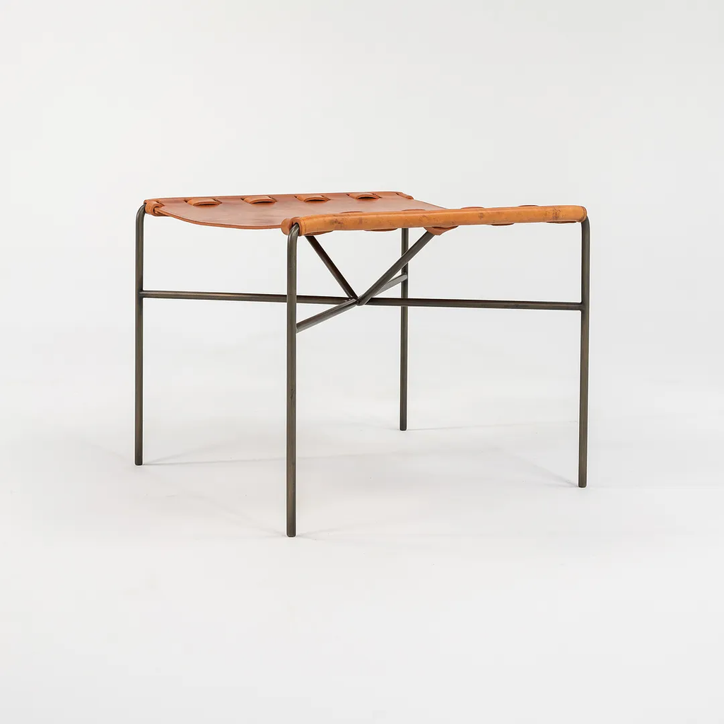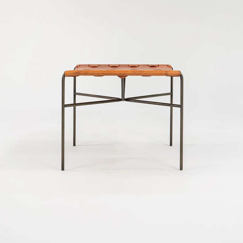 This is a TG-19 Sling Ottoman in antique tan leather with a medium antique bronze frame, produced by Gratz Industries. The ottoman was designed by Katavolos, Littell and Kelley in 1952 as part of the original Laverne Collection produced by Gratz Industries, formerly known as Trietel-Gratz. The ottoman dates to circa 2021 and guaranteed as an authentic Gratz production example.
