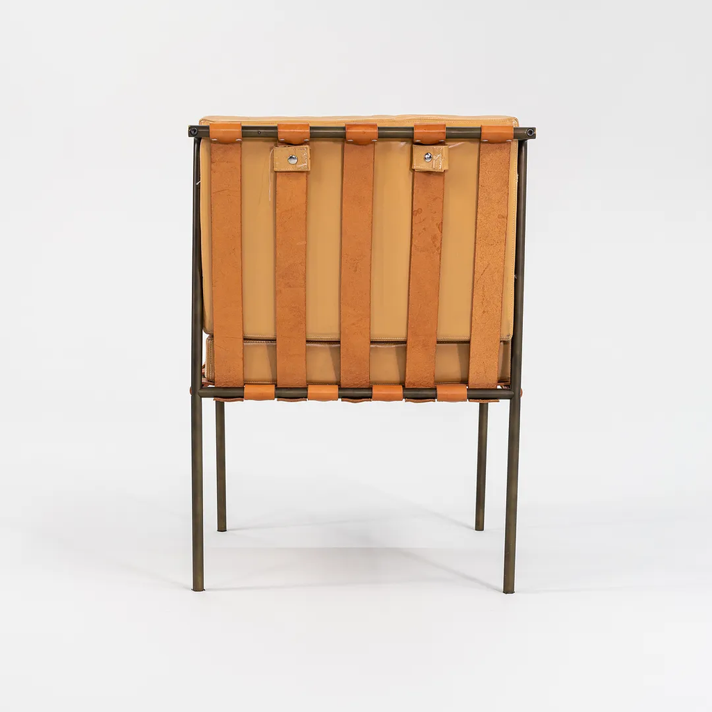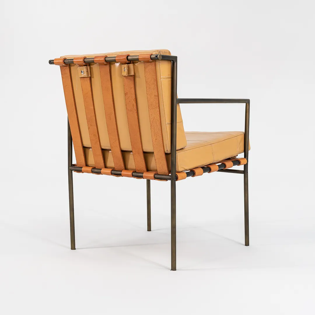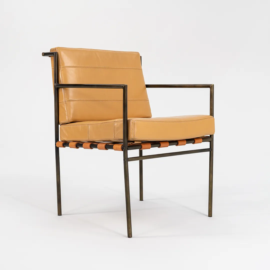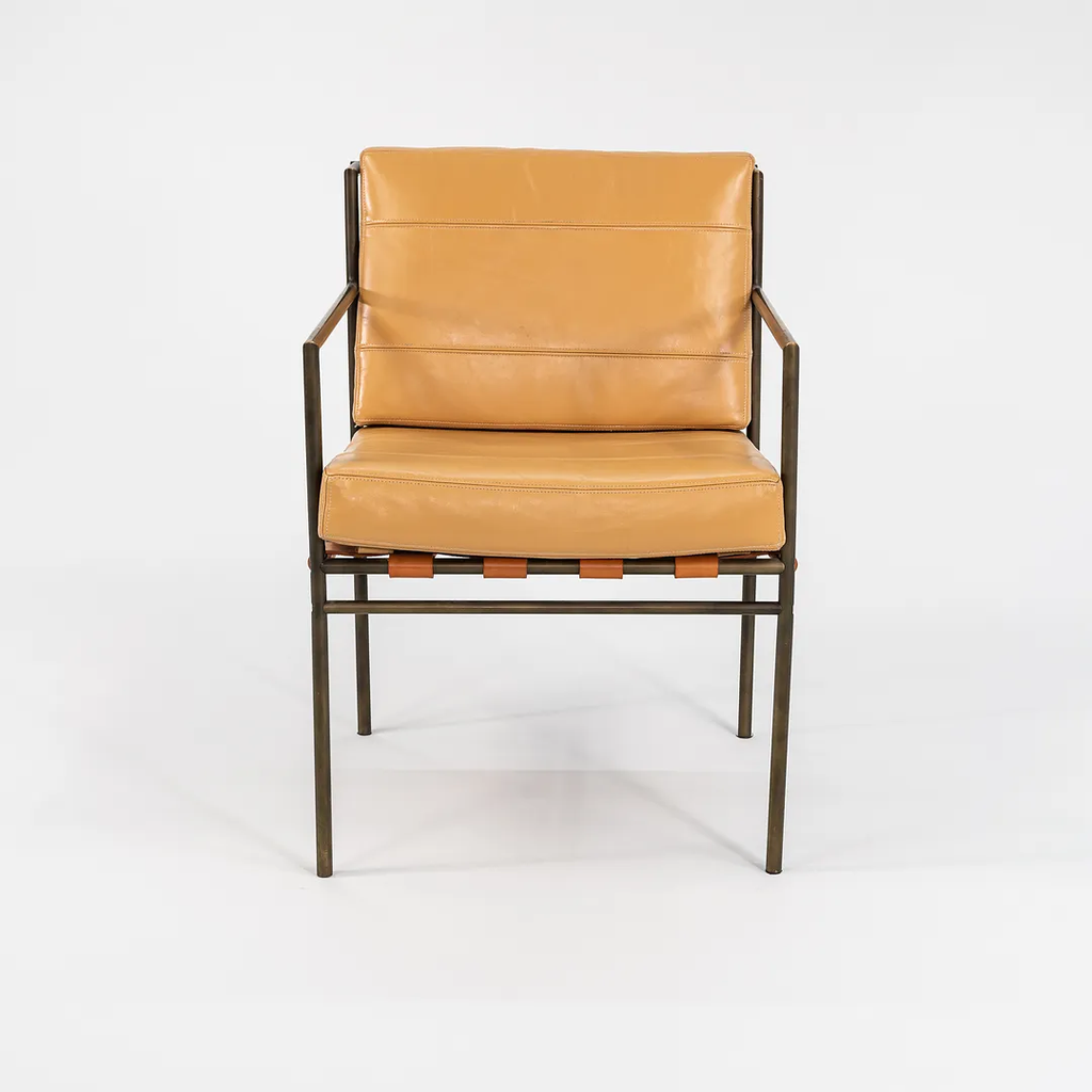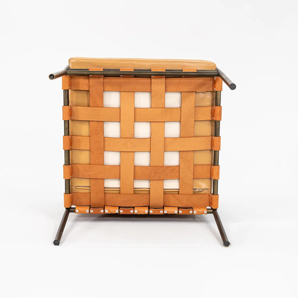 This is a prototype arm chair in Brushed Bronze with Tan leather, designed by Bill or William Katavolos and produced by Gratz Industries in 2009. This example came from the private collection of Gratz Industries and is a rare an unusual example of Katavolos' work. This particular chair has two small holes drilled on the top of the arms for armrests. If desired, we can have some arms made for them if desired or can be used as/is. The arms were intended as simple leather covers.