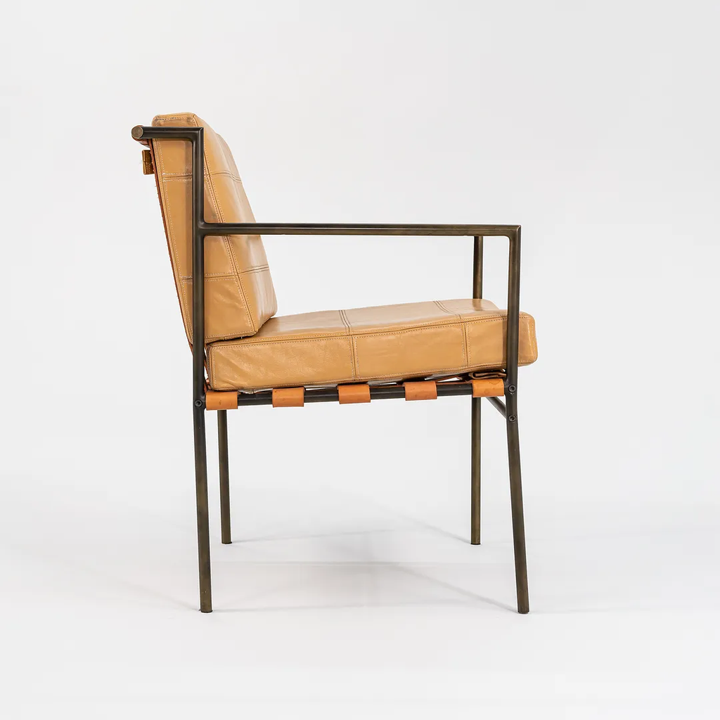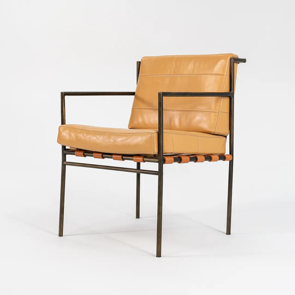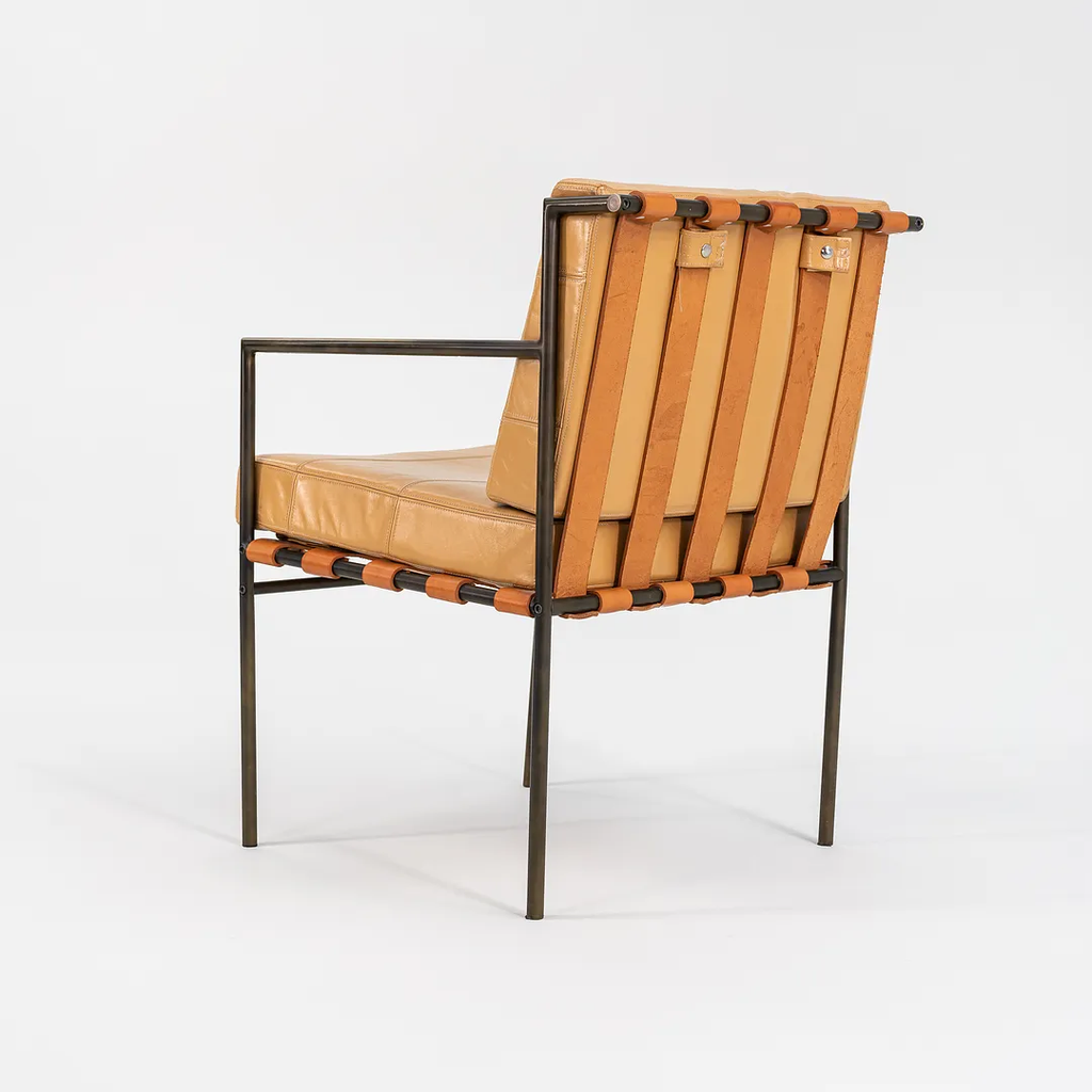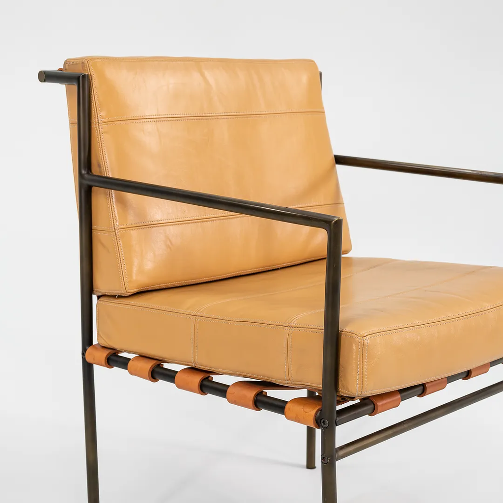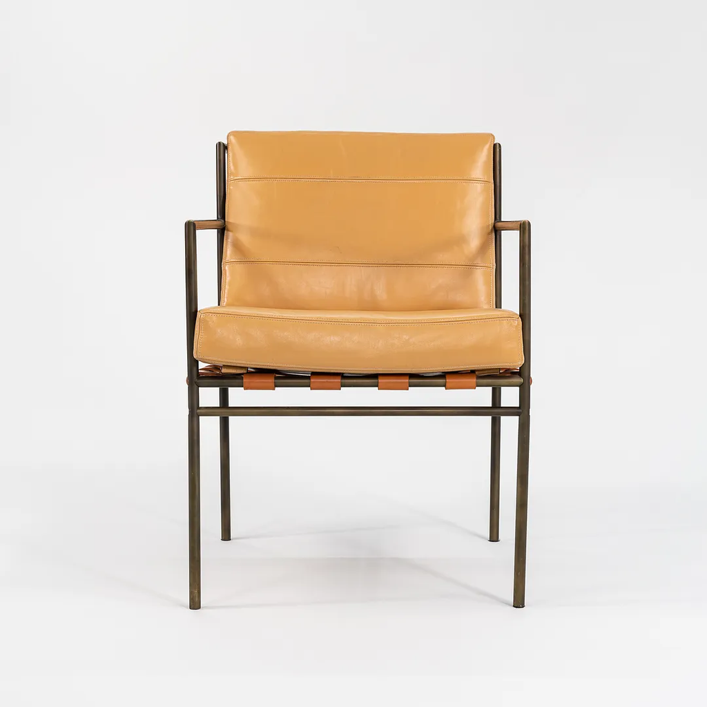 This is a prototype arm chair in Brushed Bronze with Tan leather, designed by Bill or William Katavolos and produced by Gratz Industries in 2009. This example came from the private collection of Gratz Industries and is a rare an unusual example of Katavolos' work. This particular chair has two small holes drilled on the top of the arms for armrests. If desired, we can have some arms made for them if desired or can be used as/is. The arms were intended as simple leather covers.