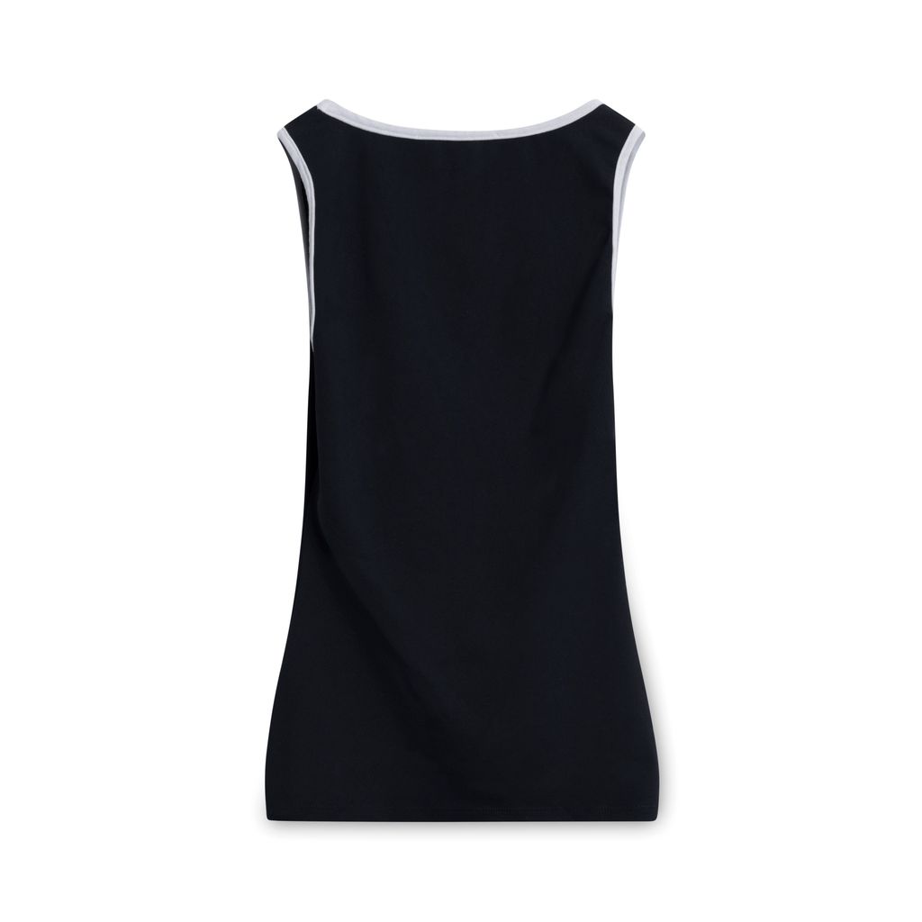 This sporty sleeveless top from Tank Air contrasts its solid black base with a white trim around the neck and shoulders.