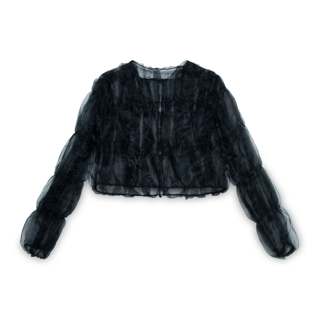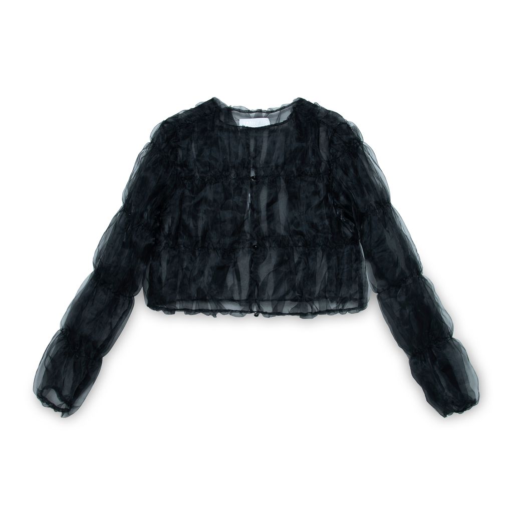 Tank Air puffer jacket features sheer organza fabric throughout with marble buttons closure at front.