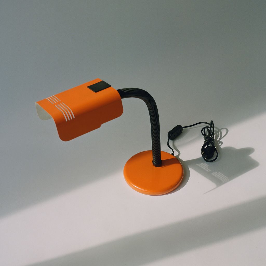 At the intersection of modern design and retro feel, the Emily Oberg curated furniture collection explores the essence of both through her own camera lens. This specific piece features a 1970's table lamp design by Targetti Sankey in Italy, orange metal bulb cover and base cover, adjustable neck with plastic coiled cover, on/off switch located on cord, and European style plug (will require a converter).