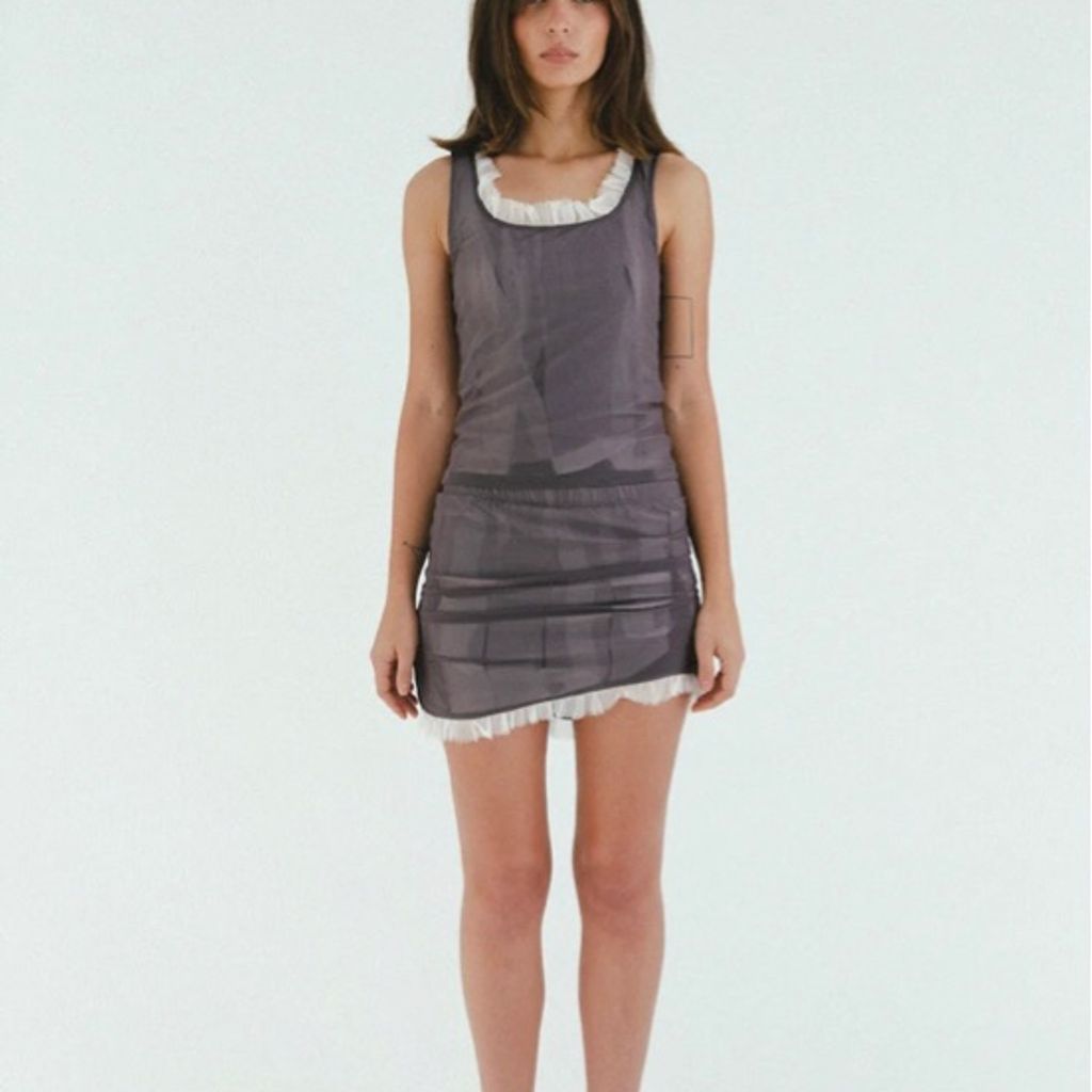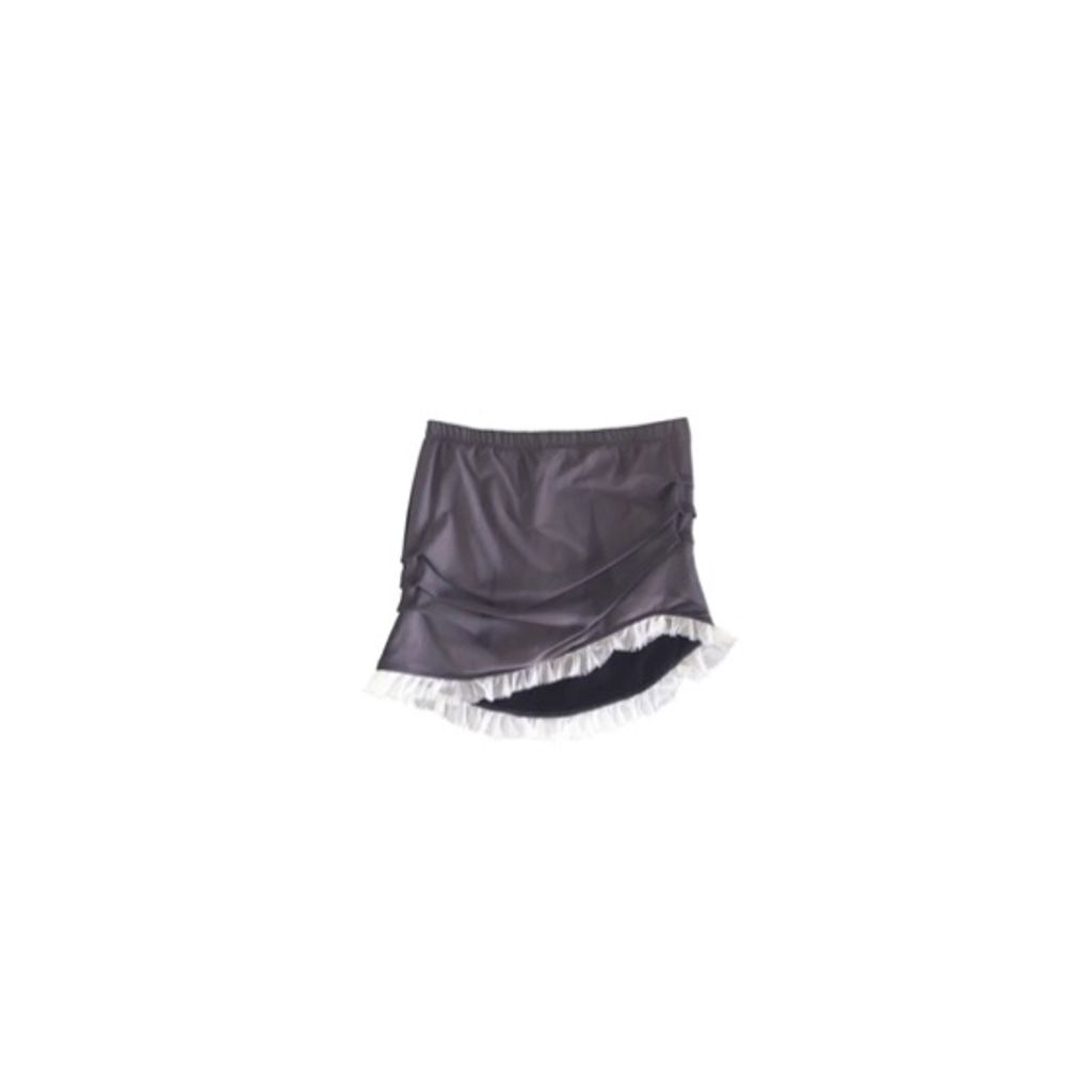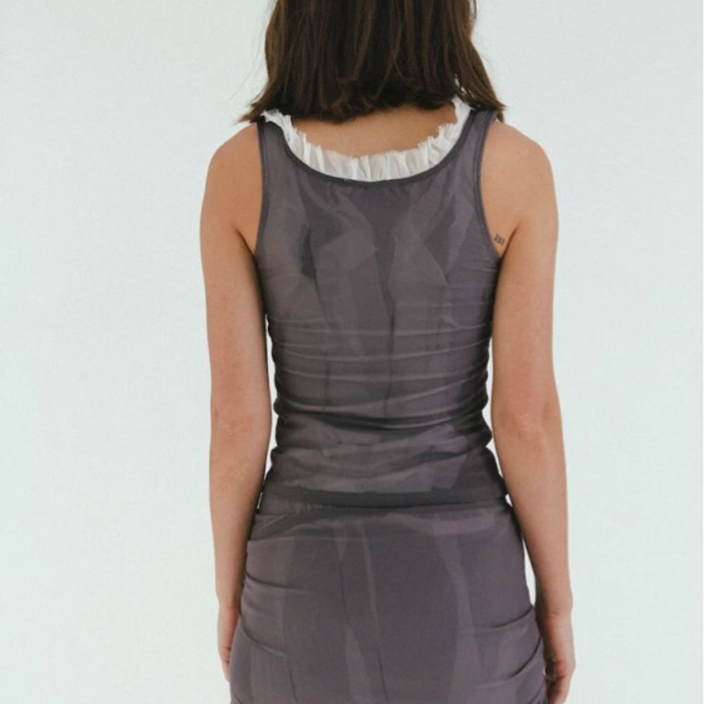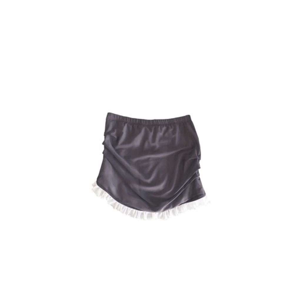 Tattered Top / Slate grey stretch nylon mesh outer layer with white tattered poly-silk interior. Fully lined in black jersey with white silk chiffon gathered trim around the neckline. Interior layer is only pleated at neckline and will therefore lay differently on the body with each wear. Tattered Skirt / Slate grey stretch nylon mesh outer layer with tattered white poly-silk interior. Fully lined in black jersey with white silk chiffon gathered trim around the hem. Interior layer is only pleated at waistband and will therefore lay differently on the body with each wear. Elastic waistband and side pleated detailing.