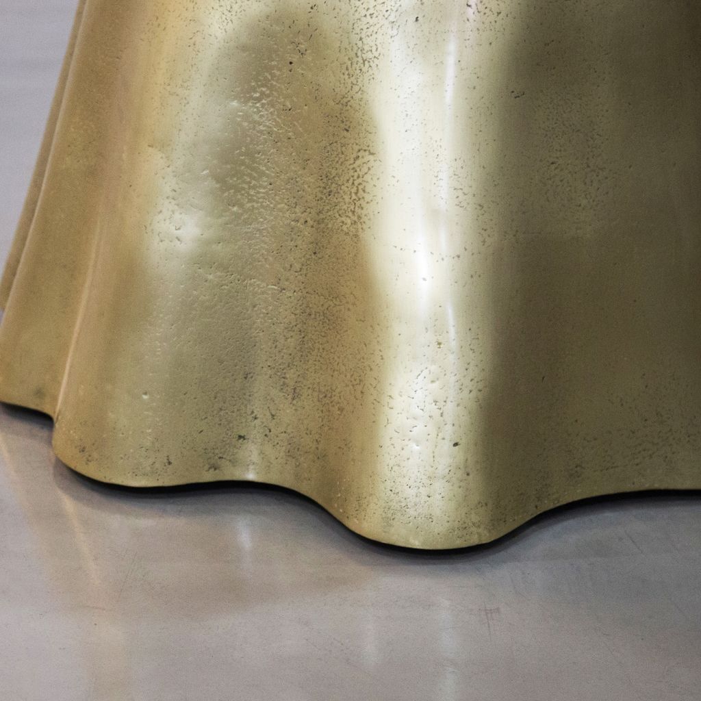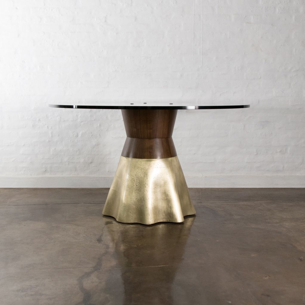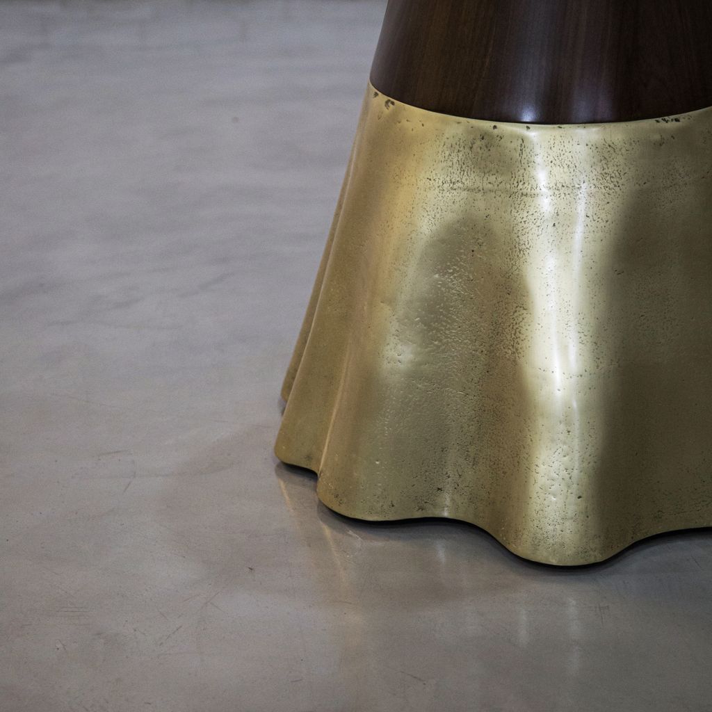 The Tavola 9 features an undulating cast bronze base paired with a geometric hourglass wood support. Only partially polished to show the evidence of the burnt earth that once surrounded the bronze, no two bases are ever alike, making each piece truly one of a kind.