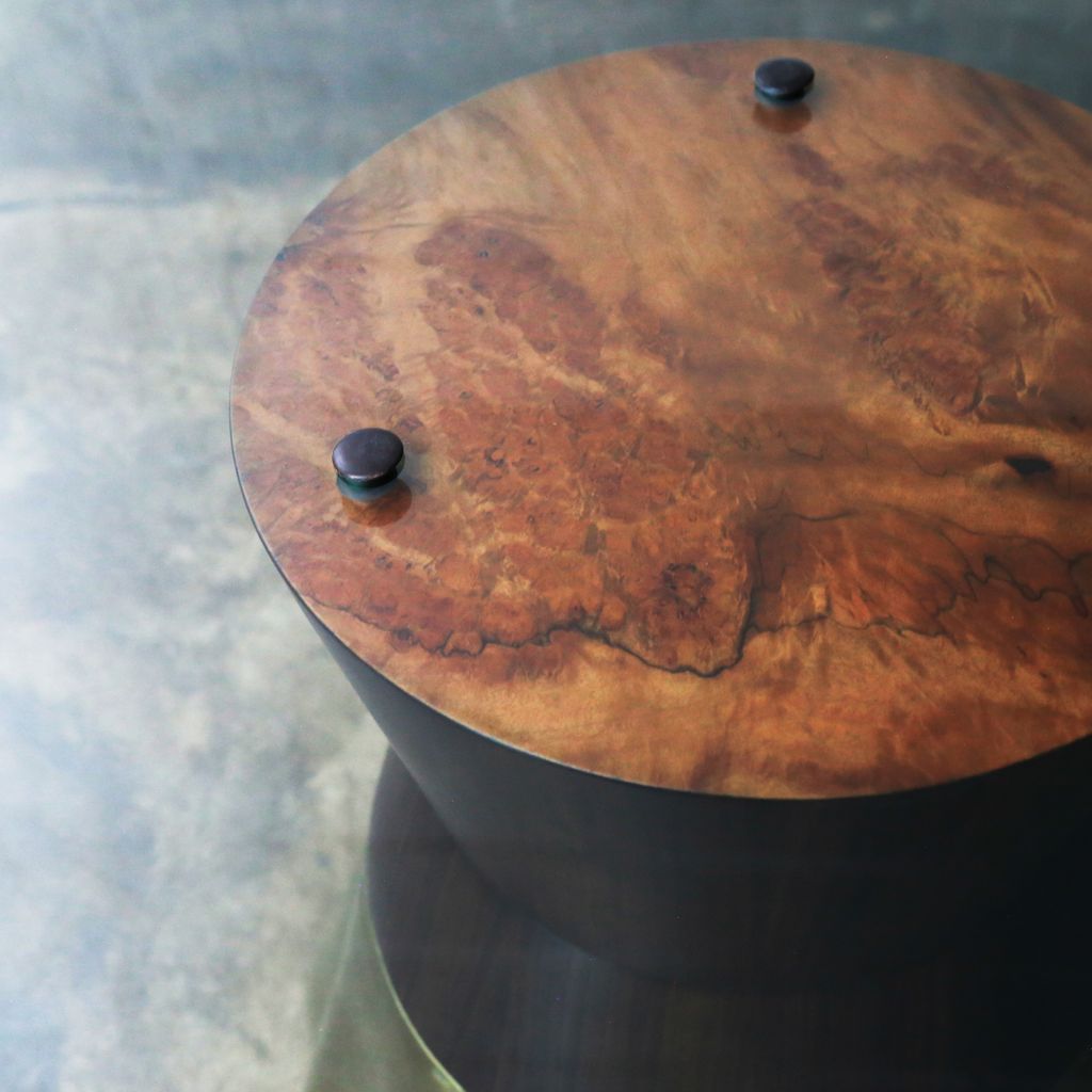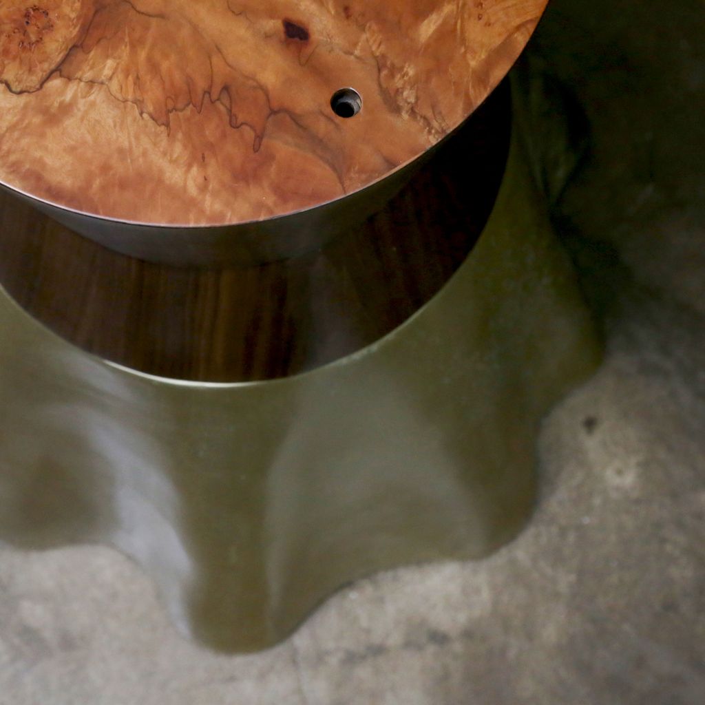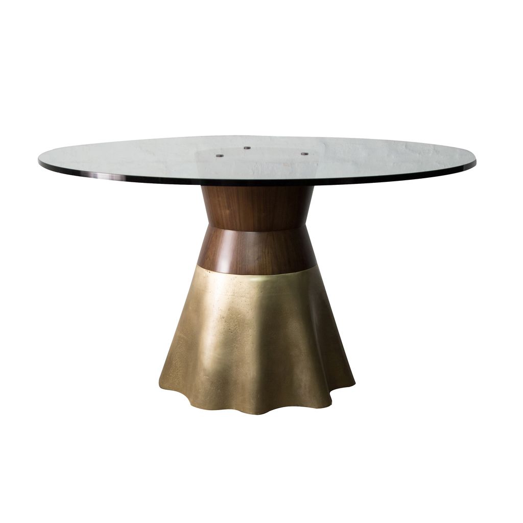 The Tavola 9 features an undulating cast bronze base paired with a geometric hourglass wood support. Only partially polished to show the evidence of the burnt earth that once surrounded the bronze, no two bases are ever alike, making each piece truly one of a kind.