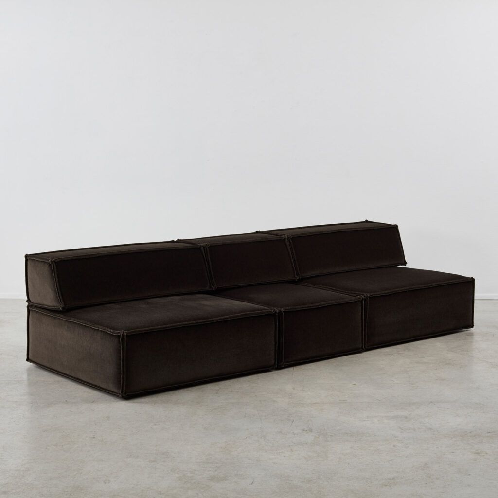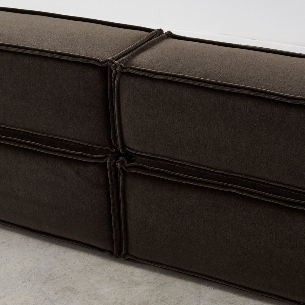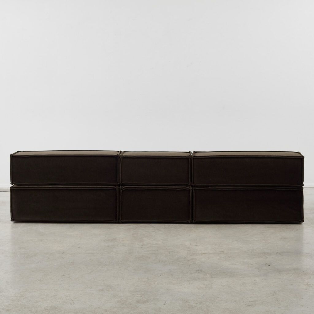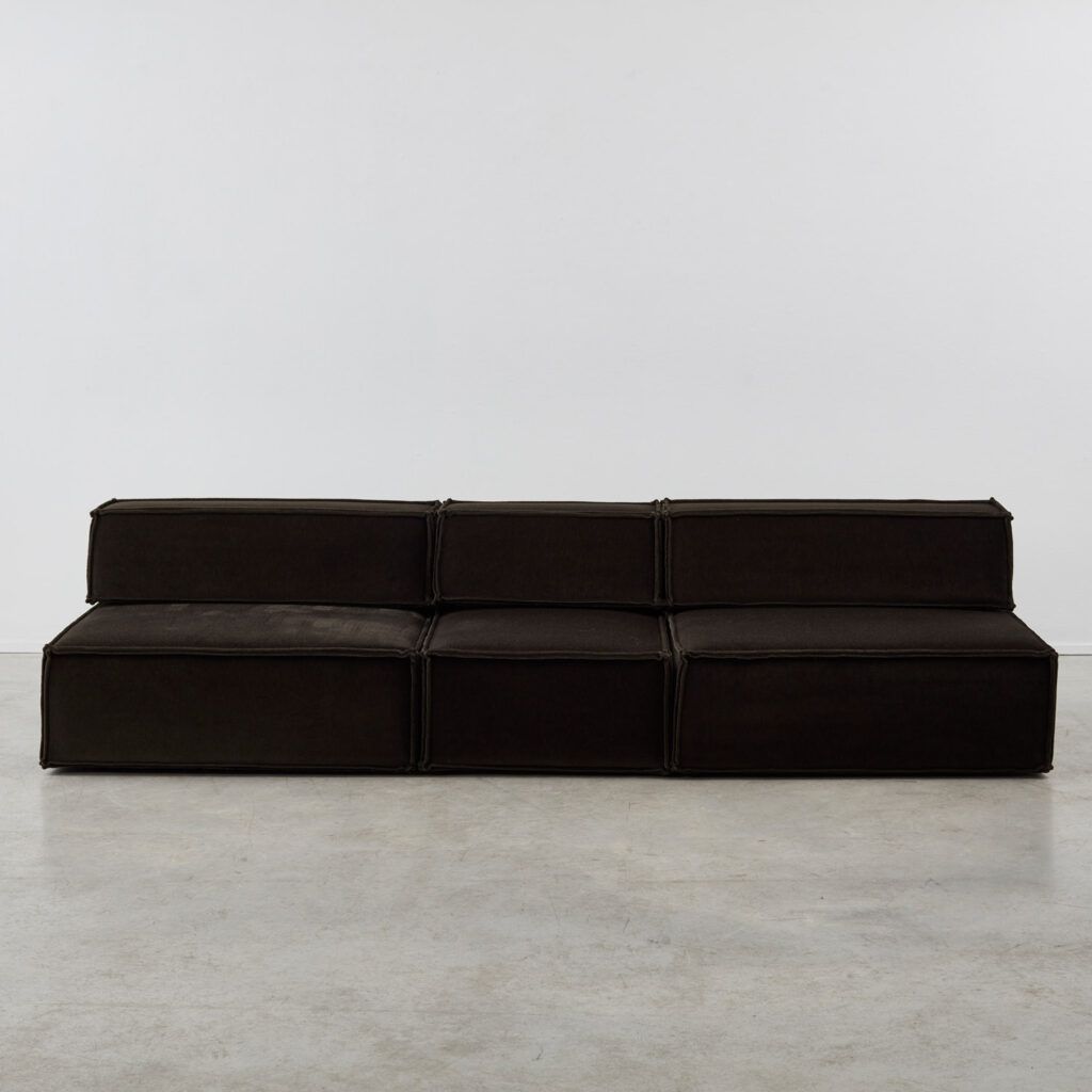 Dubbed ‘the great freedom’ by manufacturer COR, Team Form AG’s response to the stiff seating options of the era relished in a low, louche profile and endless configuration. The blocky foam elements, outlined in signature double seams, are designed to feel voluminous yet human in proportion. This vintage sofa is made up of three sections, including a slimmer central module.