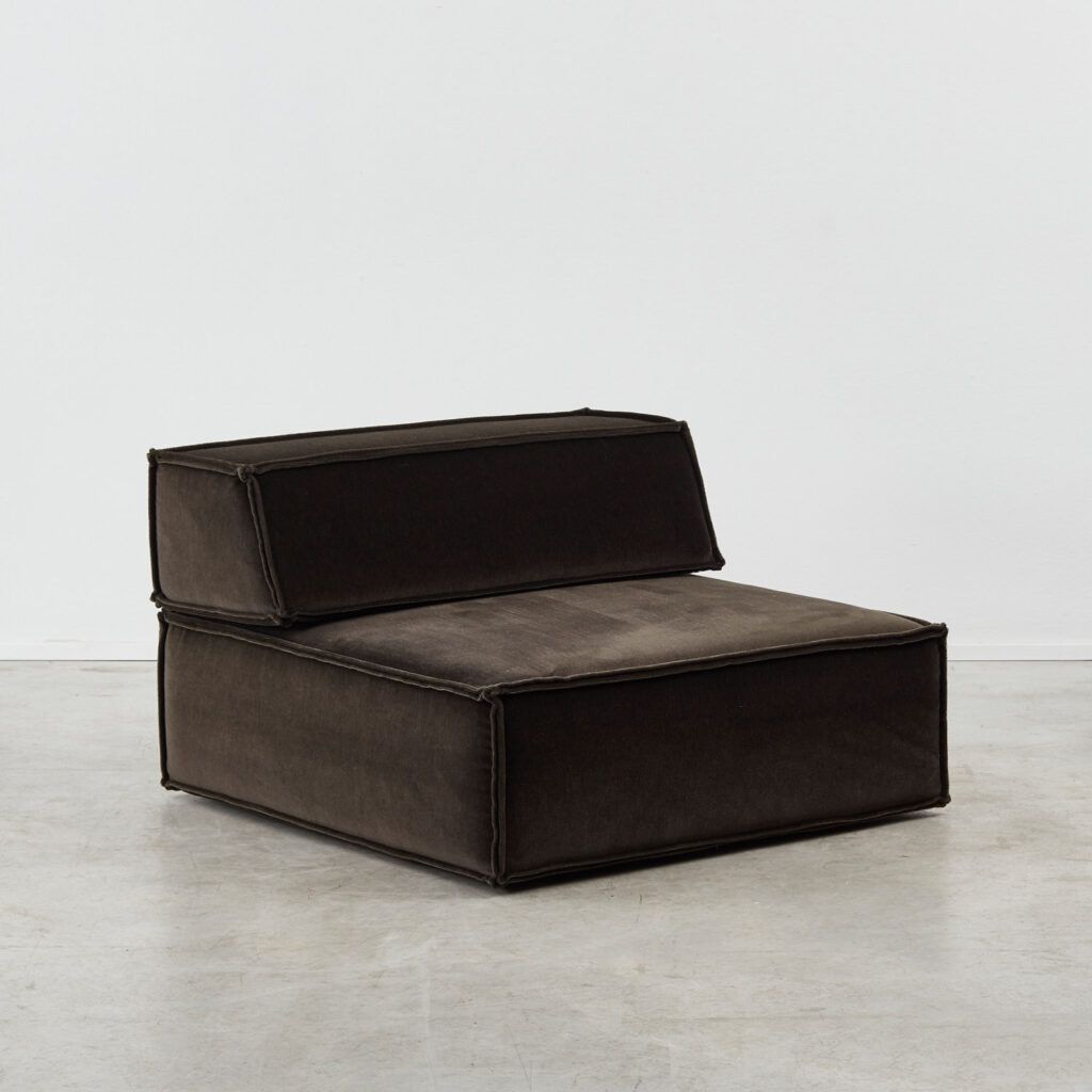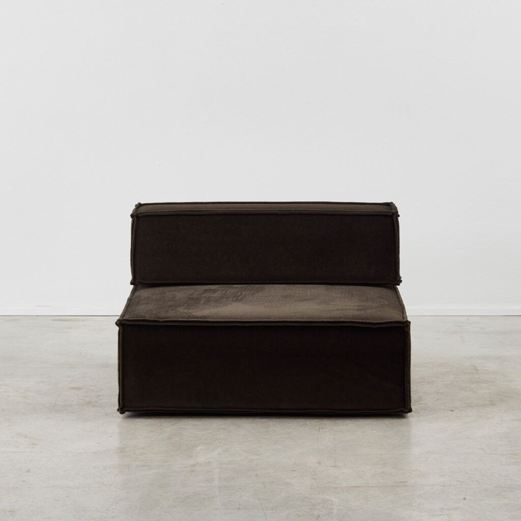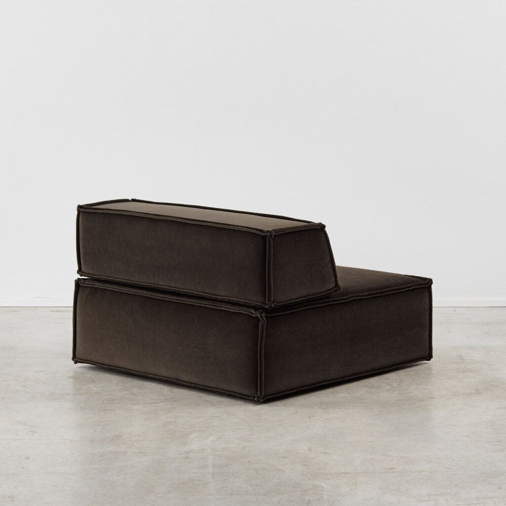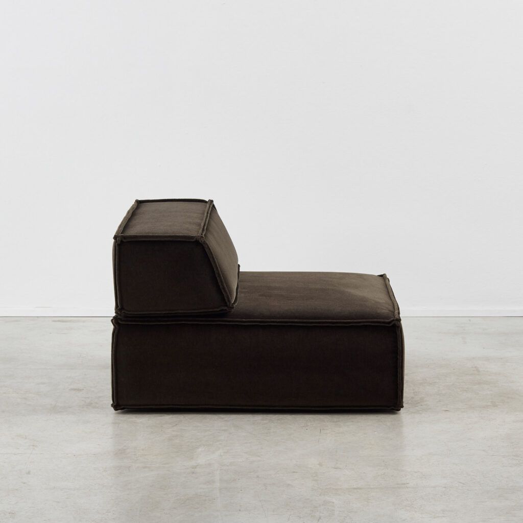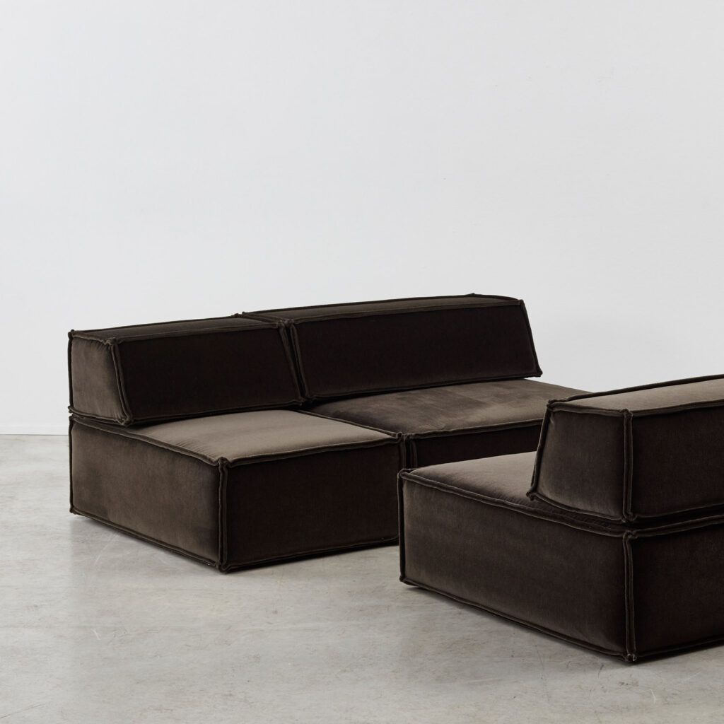 Dubbed ‘the great freedom’ by manufacturer COR, Team Form AG’s response to the stiff seating options of the era relished in a low, louche profile and endless configuration. The blocky foam elements, outlined in signature double seams, are designed to feel voluminous yet human in proportion. This vintage sofa is made up of three sections, including a slimmer central module.