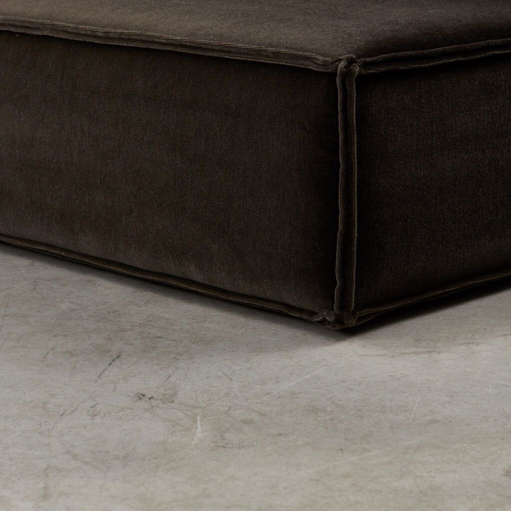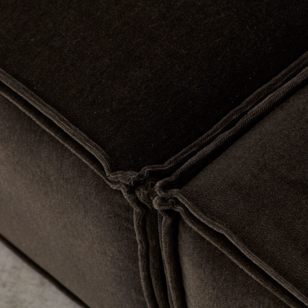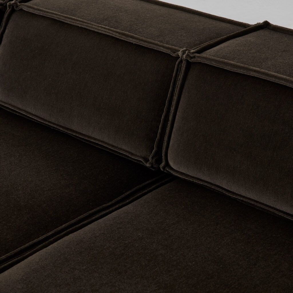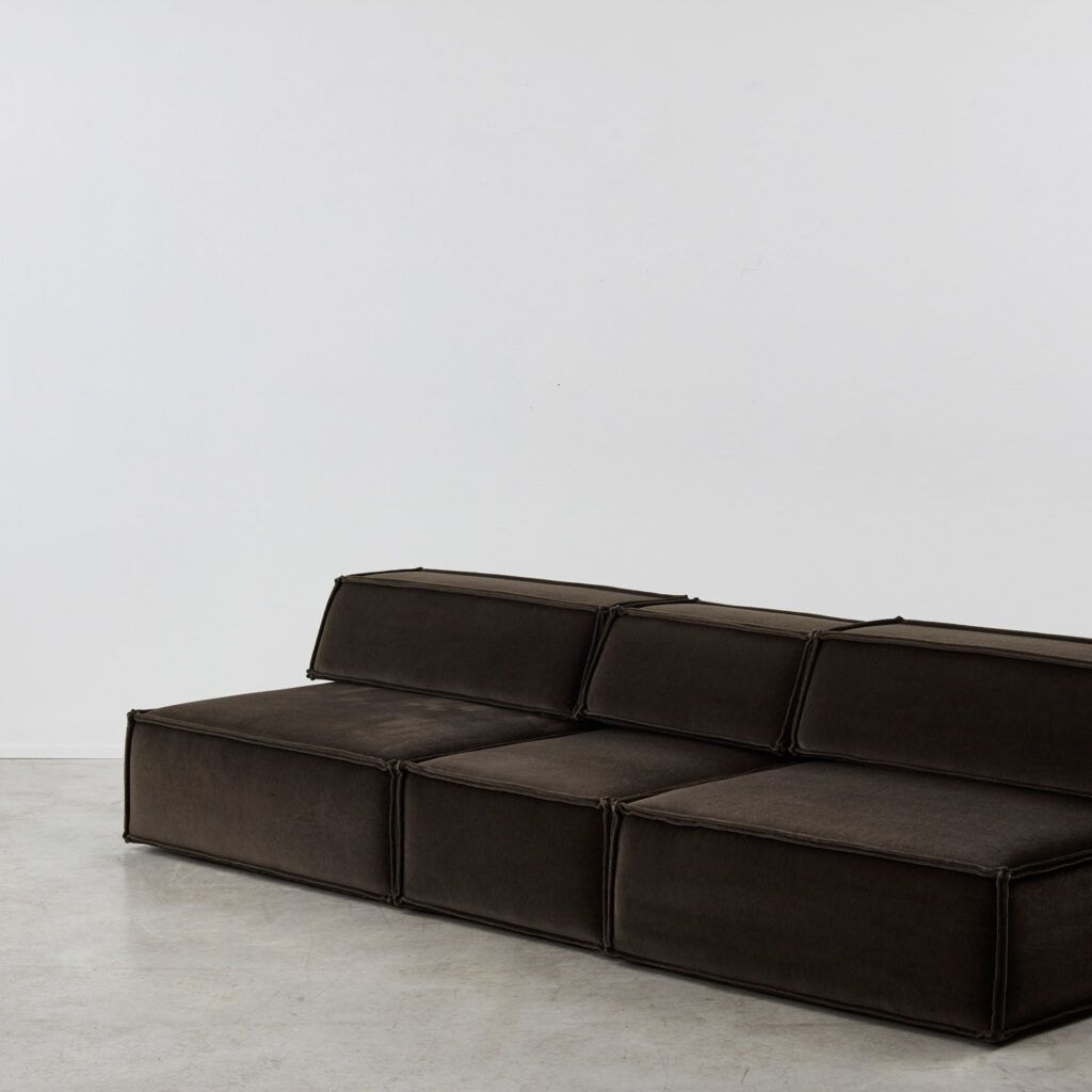Dubbed ‘the great freedom’ by manufacturer COR, Team Form AG’s response to the stiff seating options of the era relished in a low, louche profile and endless configuration. The blocky foam elements, outlined in signature double seams, are designed to feel voluminous yet human in proportion. This vintage sofa is made up of three sections, including a slimmer central module.