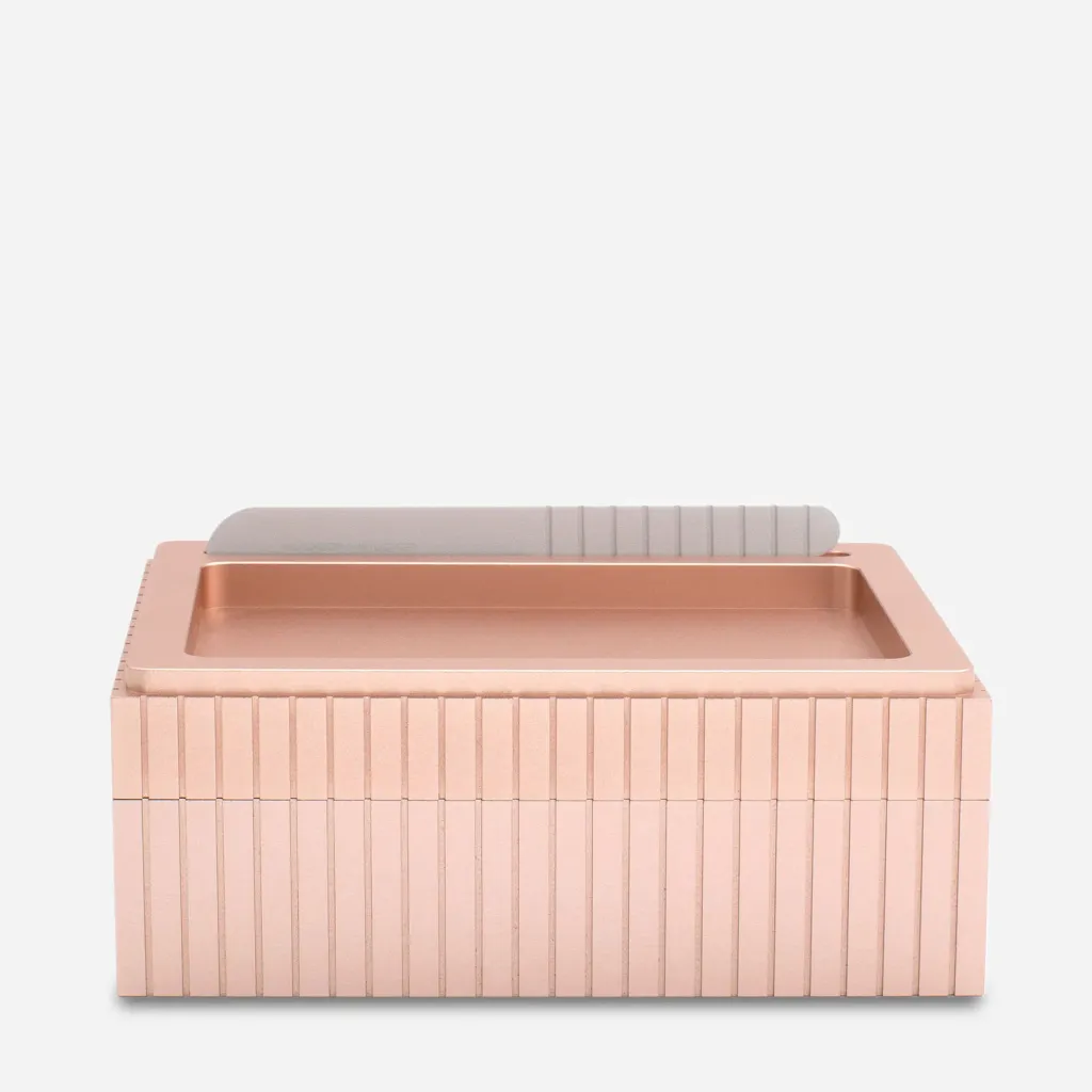 Crafted from aircraft-grade aluminum, the Tecnica butter dish is a versatile tabletop object resistant to chips, scratches, and stains. It features a built-in cradle for the matching butter knife designed for easy slicing. Available in three finishes.