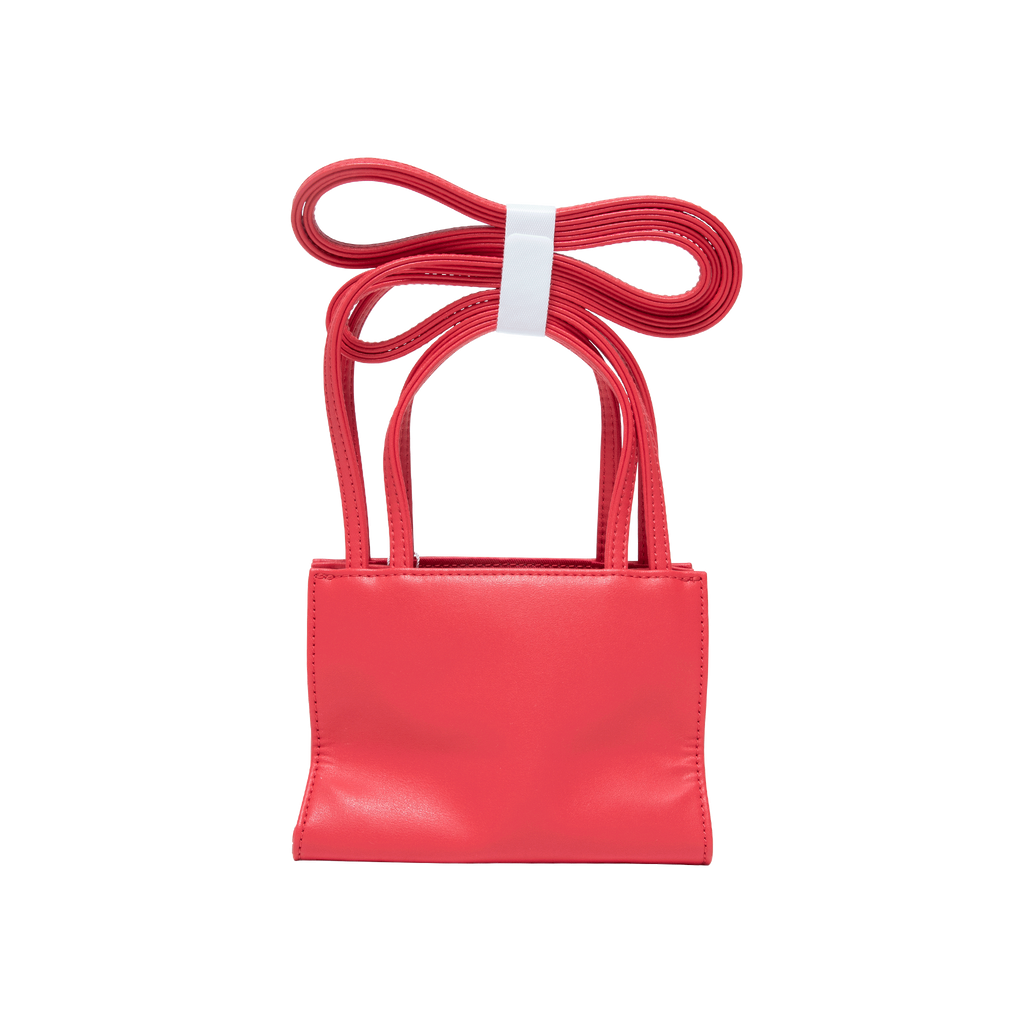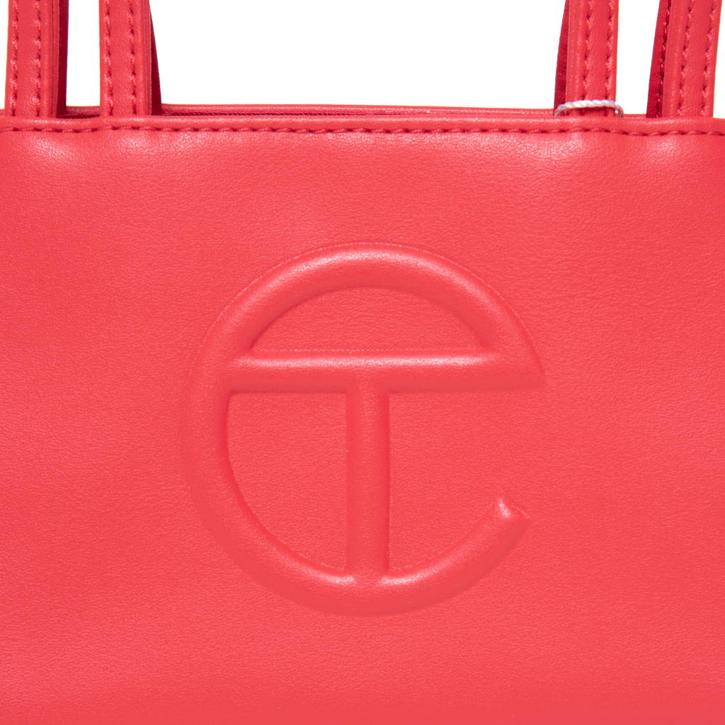 Telfar Small Red Shopping Bag features red vegan leather, flat handles and dual shoulder straps, twill lining, snap closure at top, and dust bag.