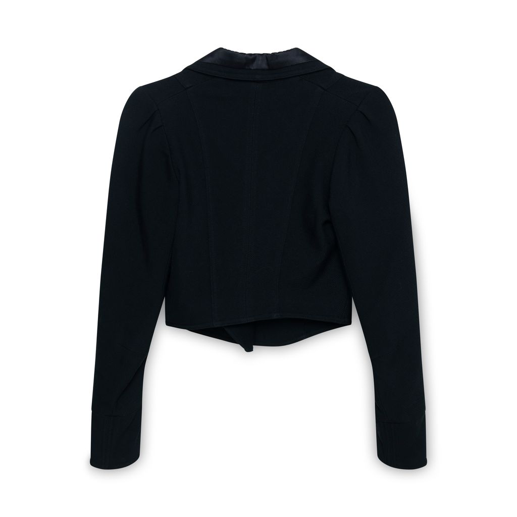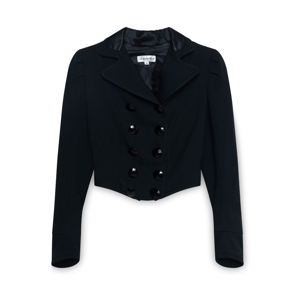 Temperley London Black Cropped Blazer features double breasted button front closure, satin lining on inside and back of collar, and cropped fitted style.