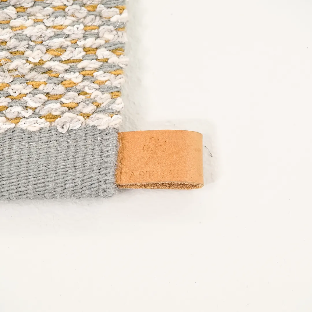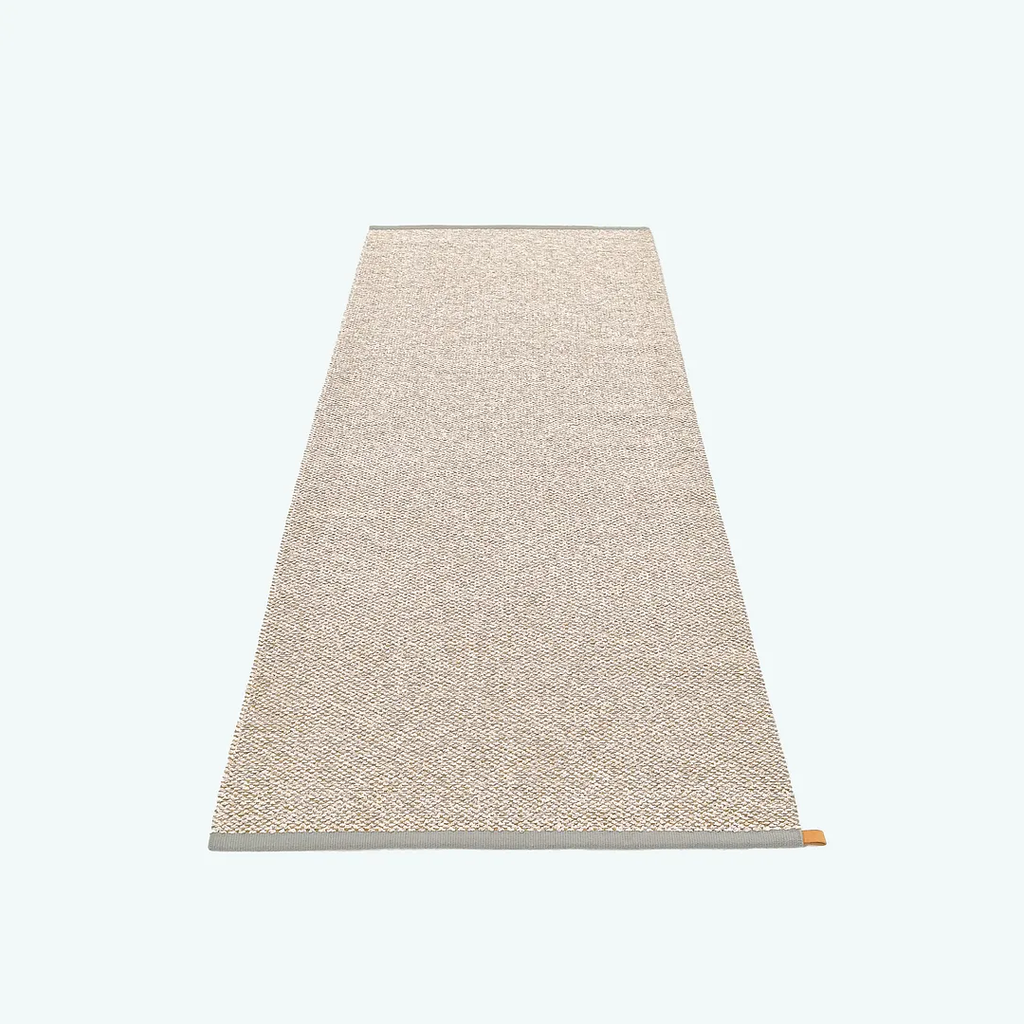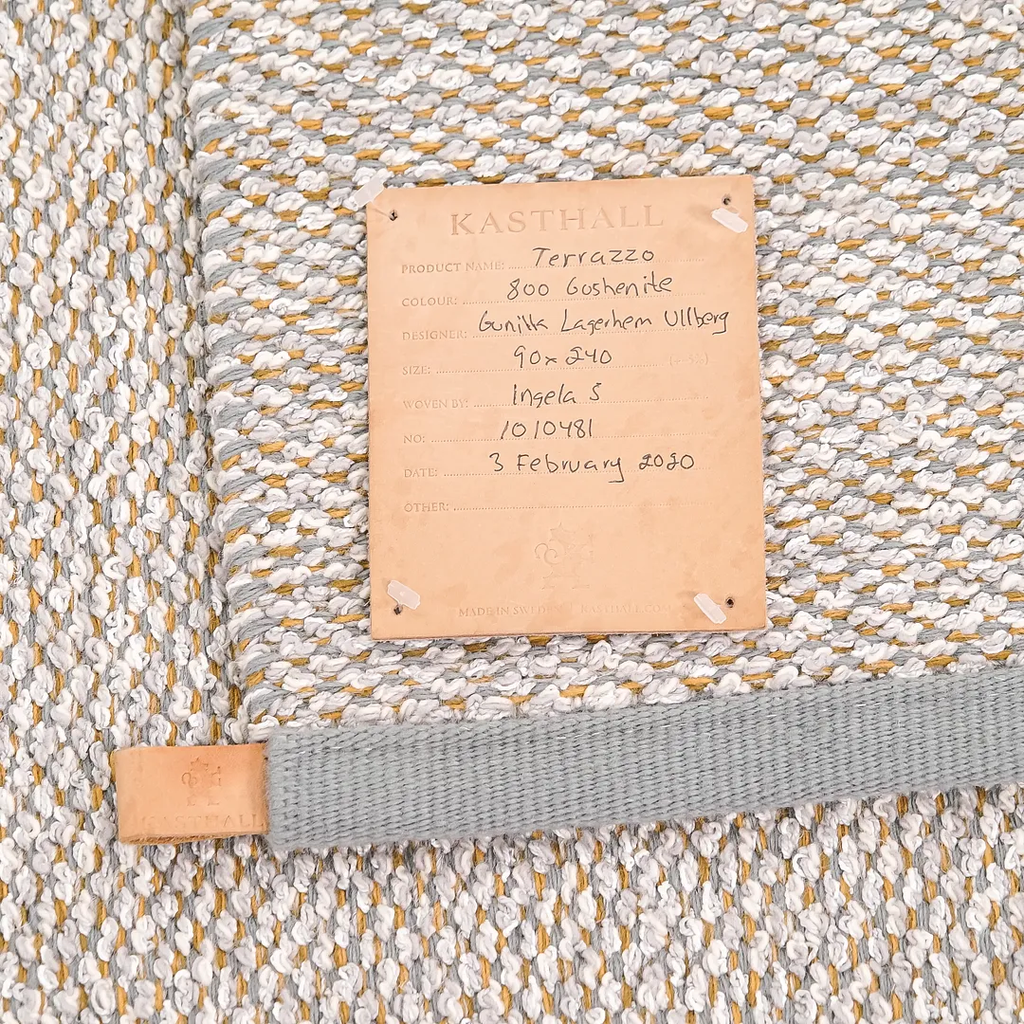 This is a Terrazzo Runner woven with pure wool and linen in shades of blue and gold. The rug was designed by Gunilla Lagerhem Ullberg and produced by Kasthall in Sweden. It dates to circa 2020 and is guaranteed as authentic. Condition is very good to excellent. See photos. This came directly from Kasthall and was previously a showroom display model.