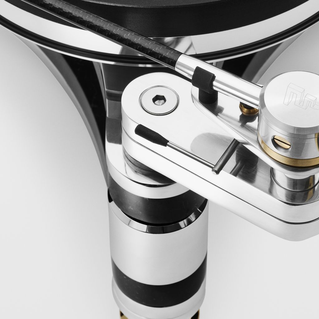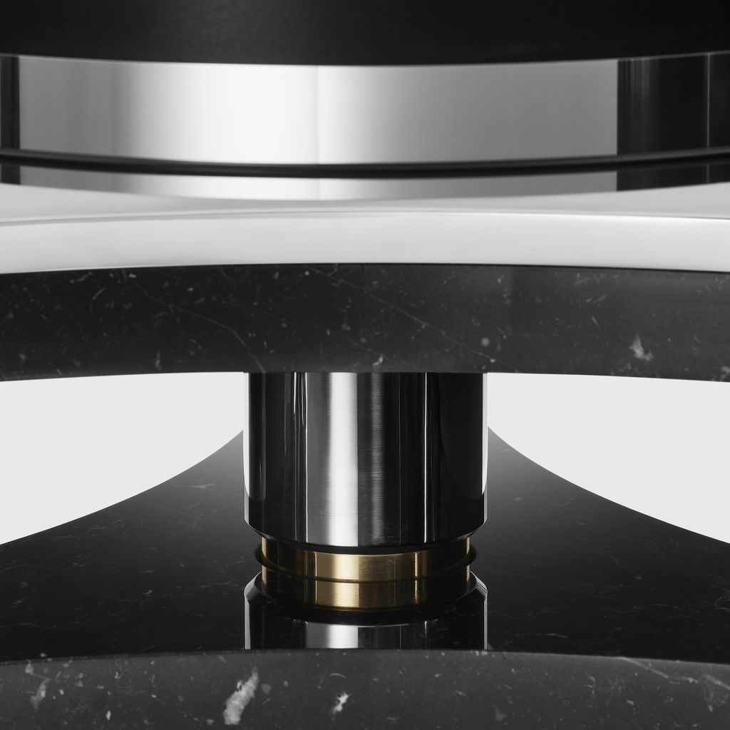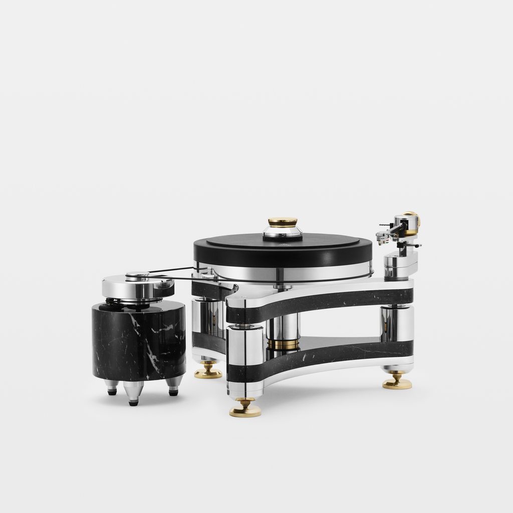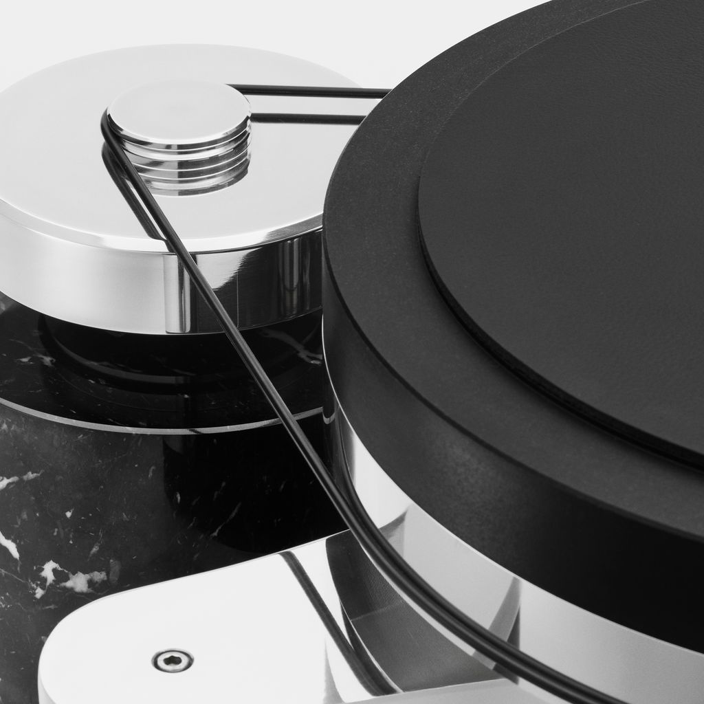 With a reinforced double chassis in black Marquinia marble and aluminium, proportionally combined with a 350 millimetre rotating plate, the TH350 turntable produces an elevated dynamic sound. The engine system with a larger flywheel, magnetic suspensions and screwable clamp combine to an extremely robust assembly, to guarantee the sound greater authority and an expanded sound stage, obtaining an extremely high level of fidelity but also a thoroughly physical listening experience.