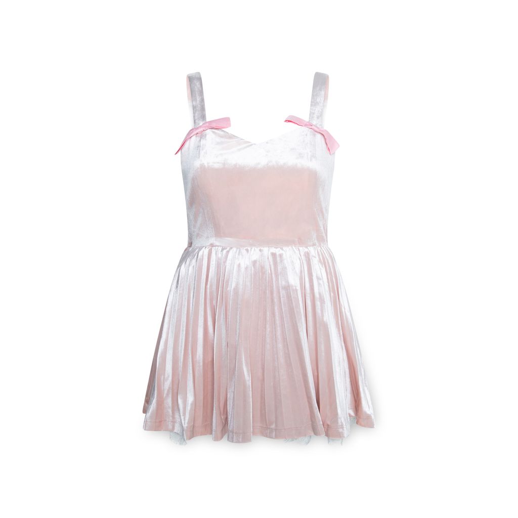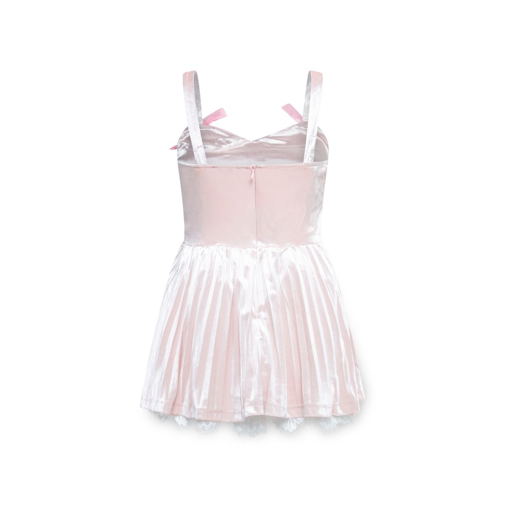 The Adorable Dress features ballerina pink plush velvet fabric, pink satin bows at shoulder straps, pleated skirt detail, mini length, white lace trim, and invisible zipper in back.