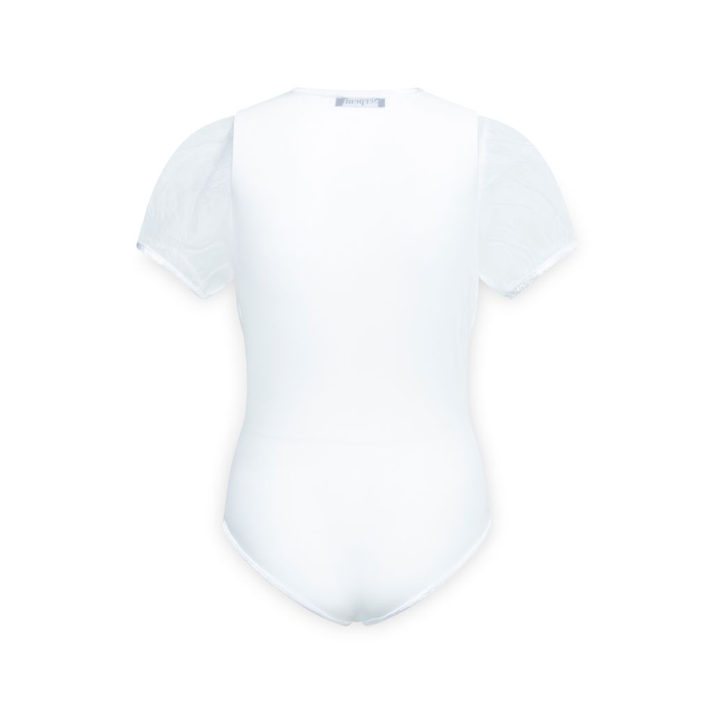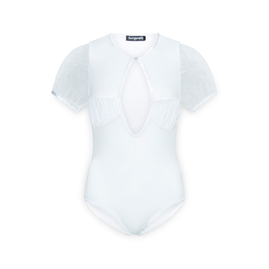 The Agatha Bodysuit features organza mini puff sleeves, white stretch tulle fabric through torso and panty line, white gathered velvet at bust cups, keyhole through center chest, snap closure at crotch, and faux pearl button at top of keyhole for closure.