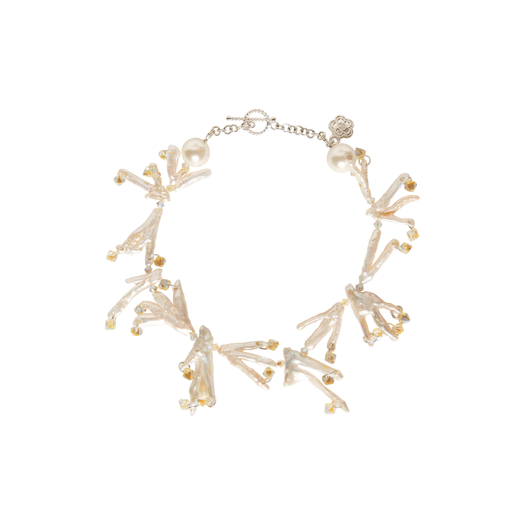 The Amber Pearl features fresh water pearls, sterling silver, stainless steel, and glass and is a handmade one of a kind necklace.