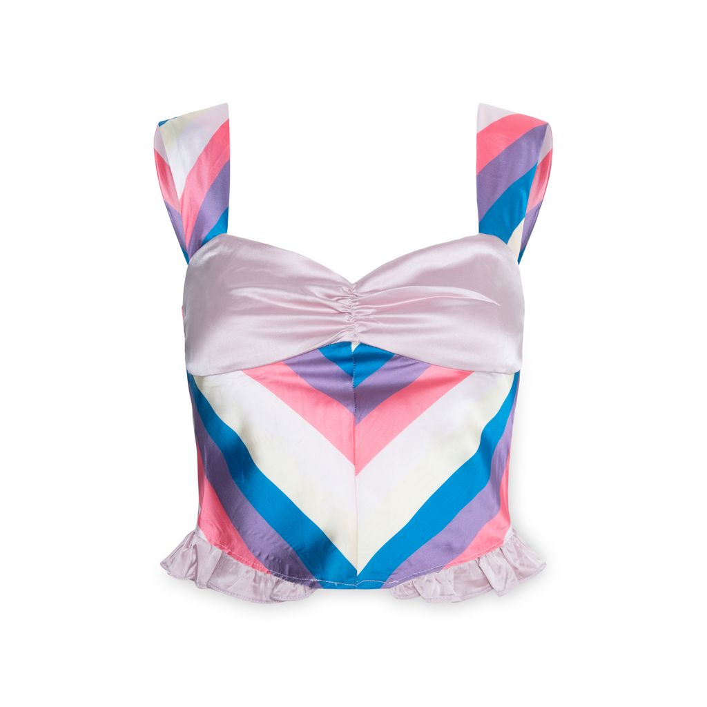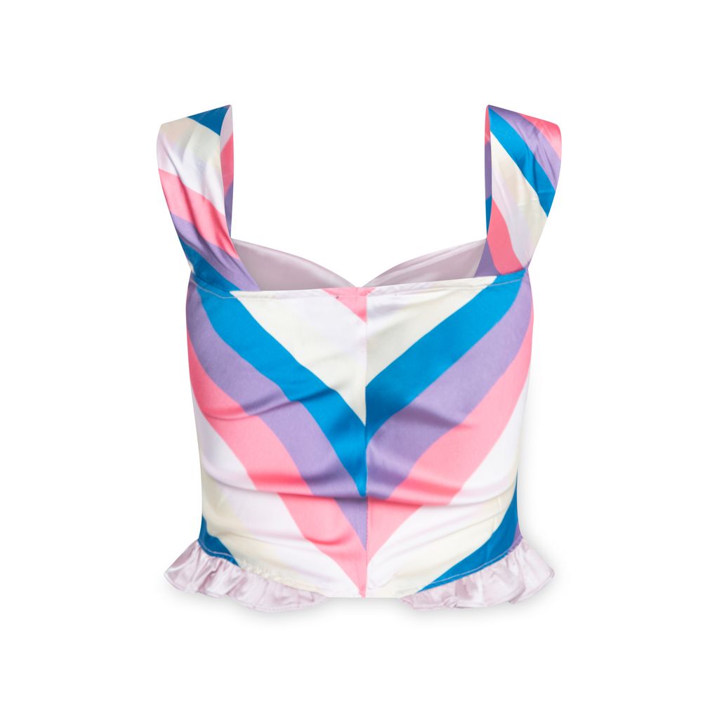The Candy Corset features removable crystal broach at center chest, striped stretch satin fabric, wide shoulder straps, lined top, mini self ruffle at either side seams, and semi cropped length.