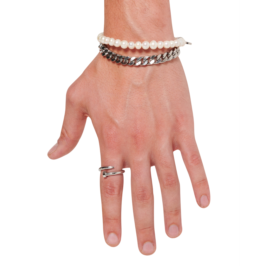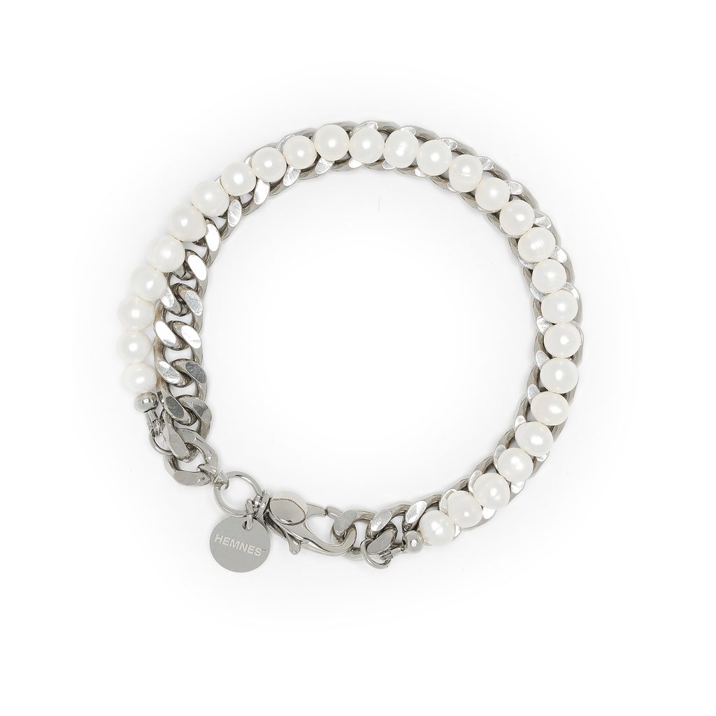 Handcrafted bracelet in stainless steel. Freshwater pearl detailing. Swivel clasp closure. Logo engraved charm. Made in Los Angeles, CA.