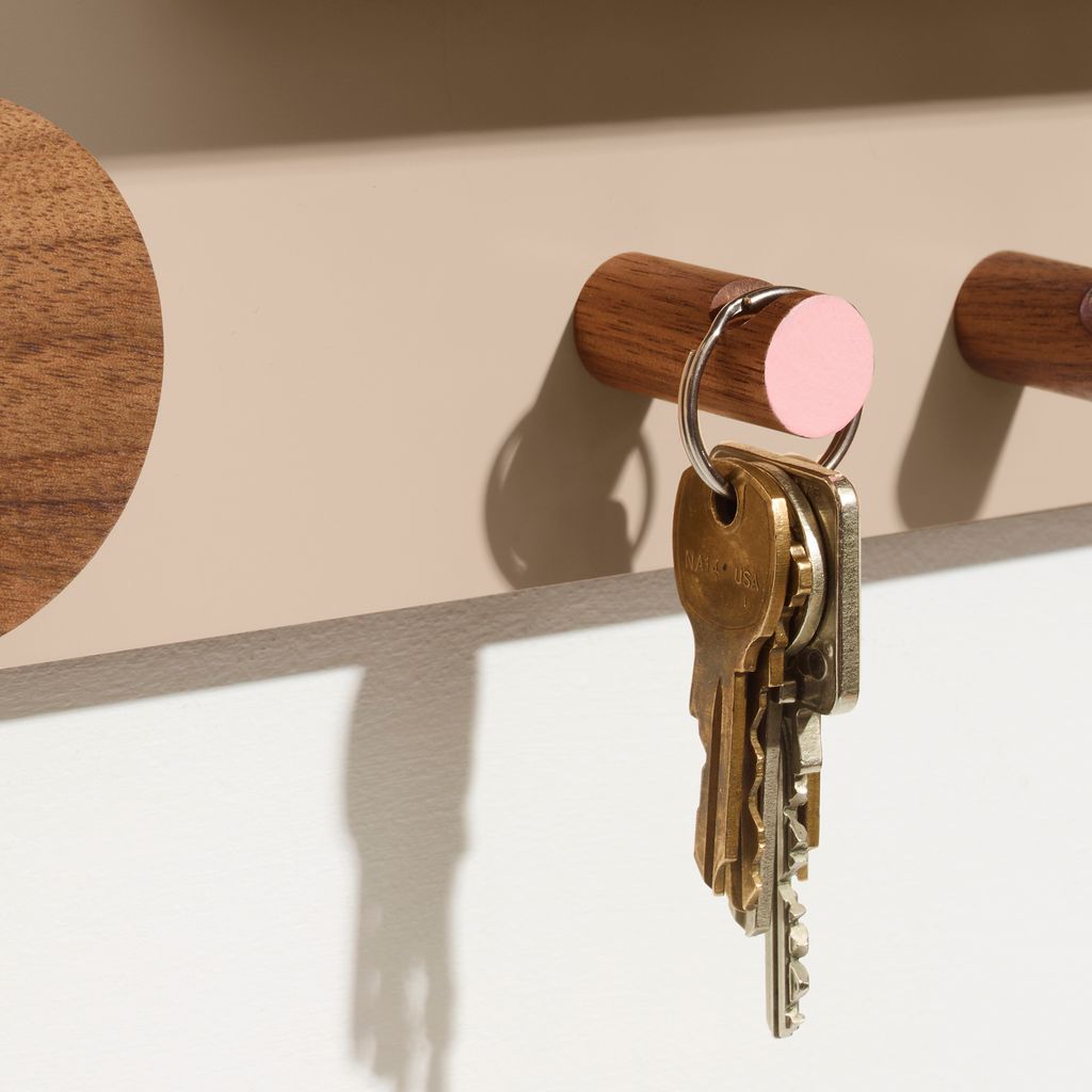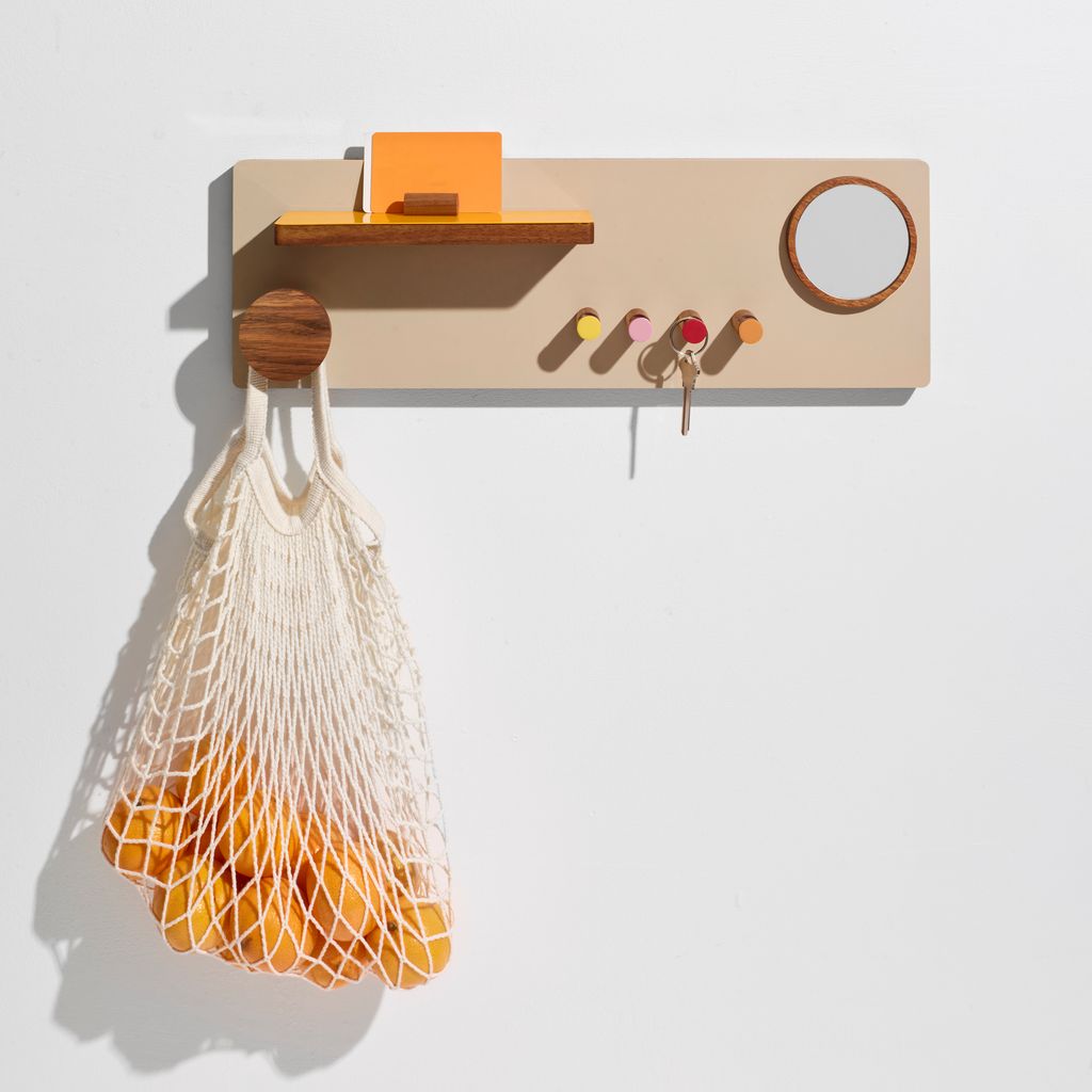 The Control Panel banishes that anxious mantra "wallet, phone, keys". This entryway wall panel has a large fixed hook and four magnetized ones to accommodate your bag, umbrella, keys, scarf, etc. The adjustable magnetized shelf with stopper prevents iphone, mail, glasses, and earbuds from getting lost in the shuffle. The movable mirror offers a reassuring glimpse before you head out. In solid walnut with powder coated magnetic components.