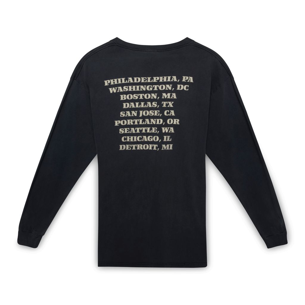 The Cure Long Sleeve Tee features graphic of The Cure front man Robert Smith and list of tour locations on the back.