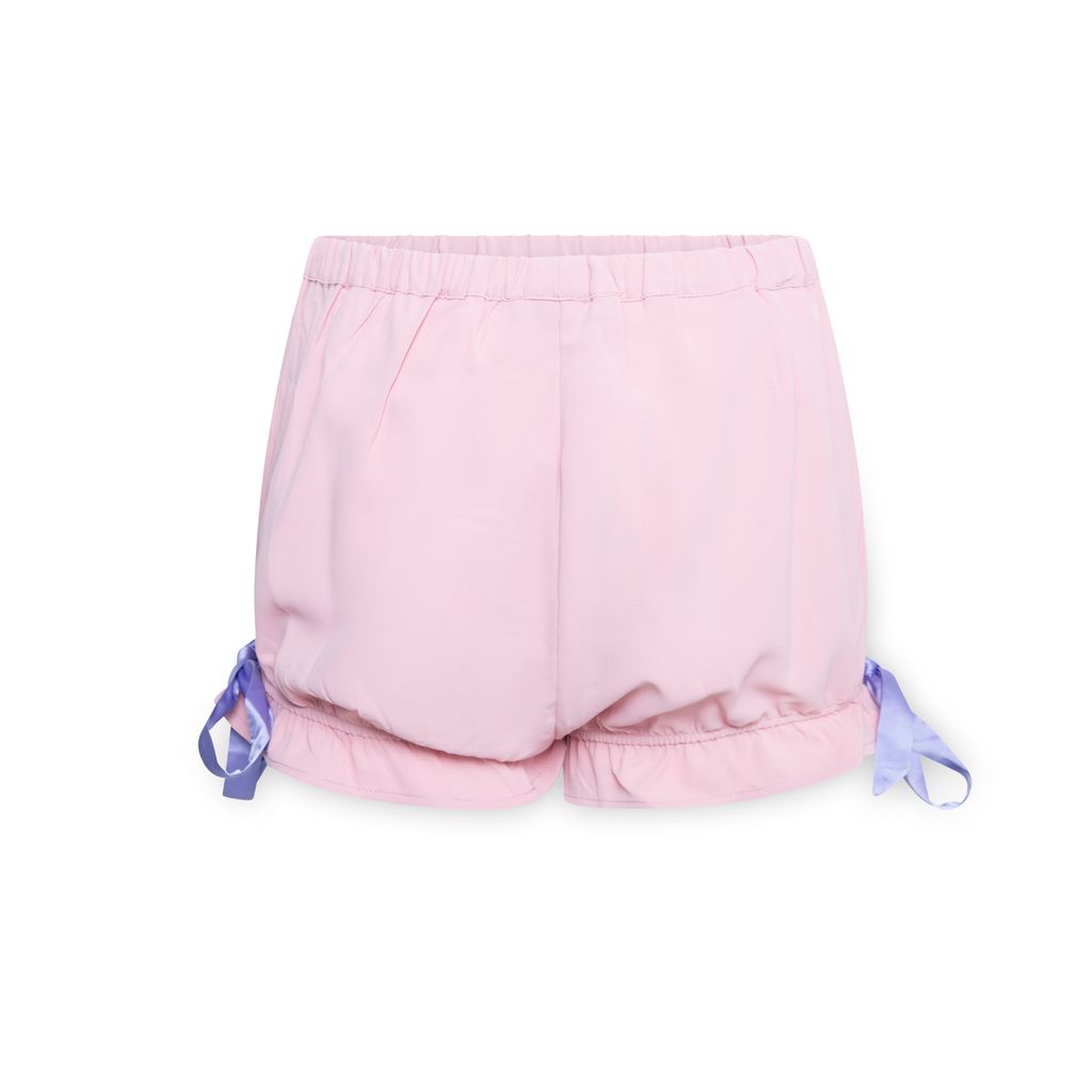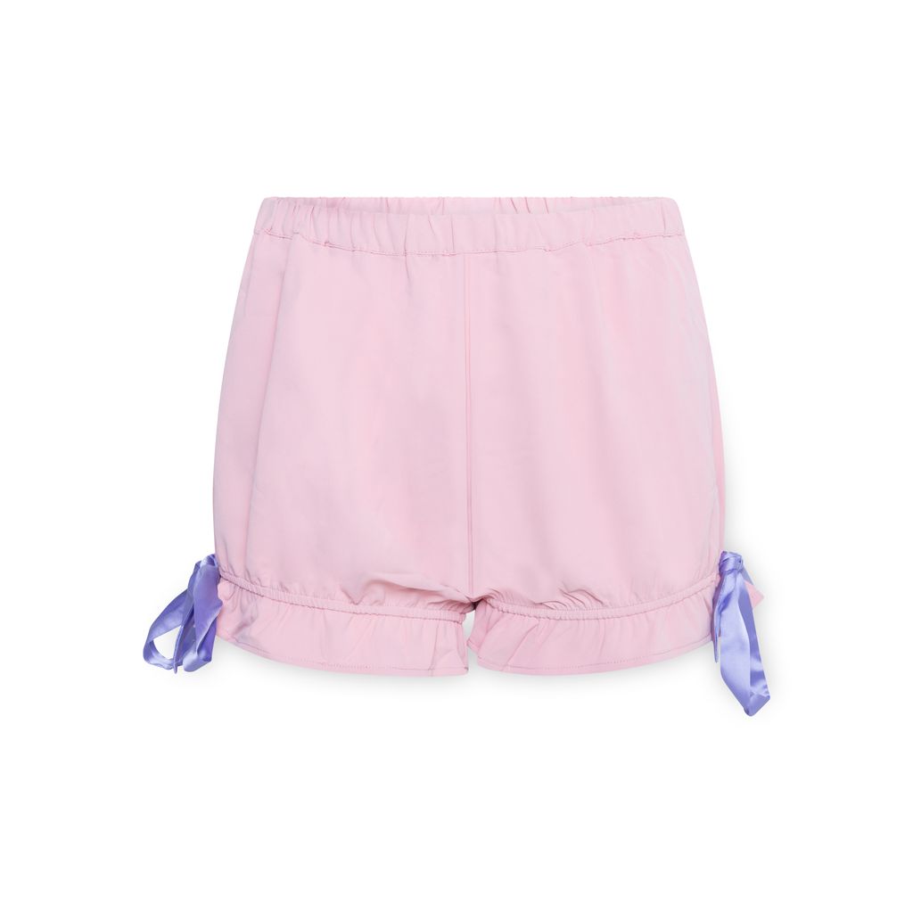 The Darling Short features mauve chiffon fabric with lilac satin contrast detail, ruffle at leg hole opening, lilac satin bows at side seams, thick elasticated waist, and gathering across top waistline.
